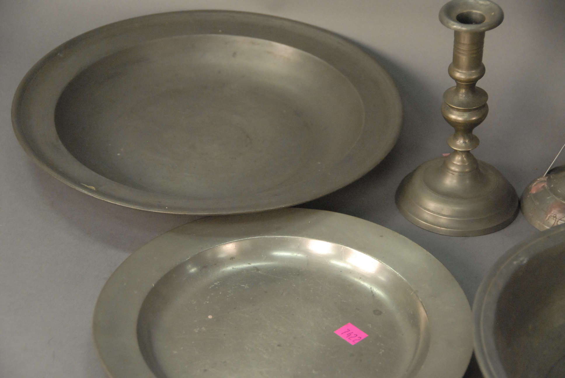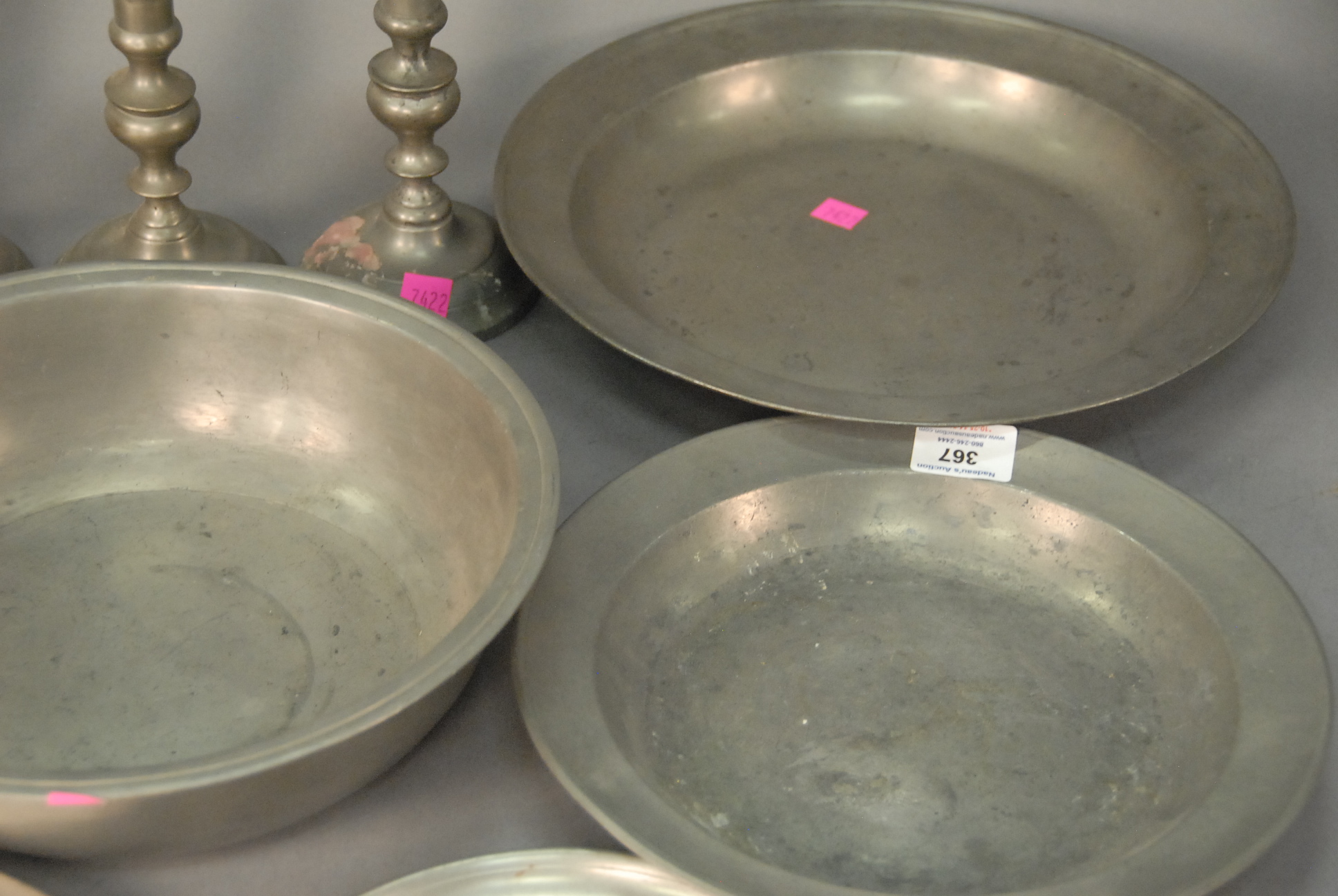 Eleven piece pewter lot including three deep chargers, one basin, and set of four pewter push-up candlesticks. Provenance: Property from the Estate of Elizabeth and Edward Wallace of The Tracy House in Meriden, Connecticut.