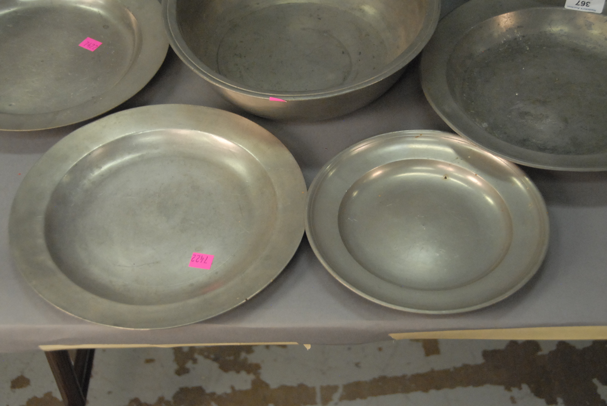 Lot 367: Eleven piece pewter lot including three deep chargers, one basin, and set of four pewter push-up candlesticks. Provenance: Property from the Estate of Elizabeth and Edward Wallace of The Tracy House in Meriden, Connecticut.