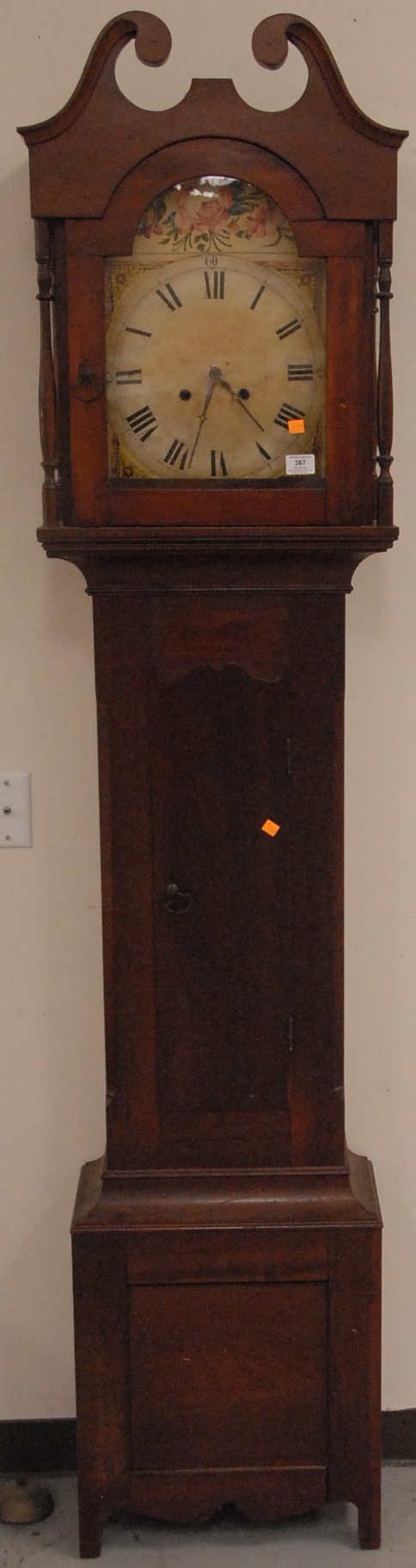 Lot 367: Federal tall clock with broken arch top over tombstone wood dial, plain case with door on base set on bracket feet with brass works. ht. 81in.