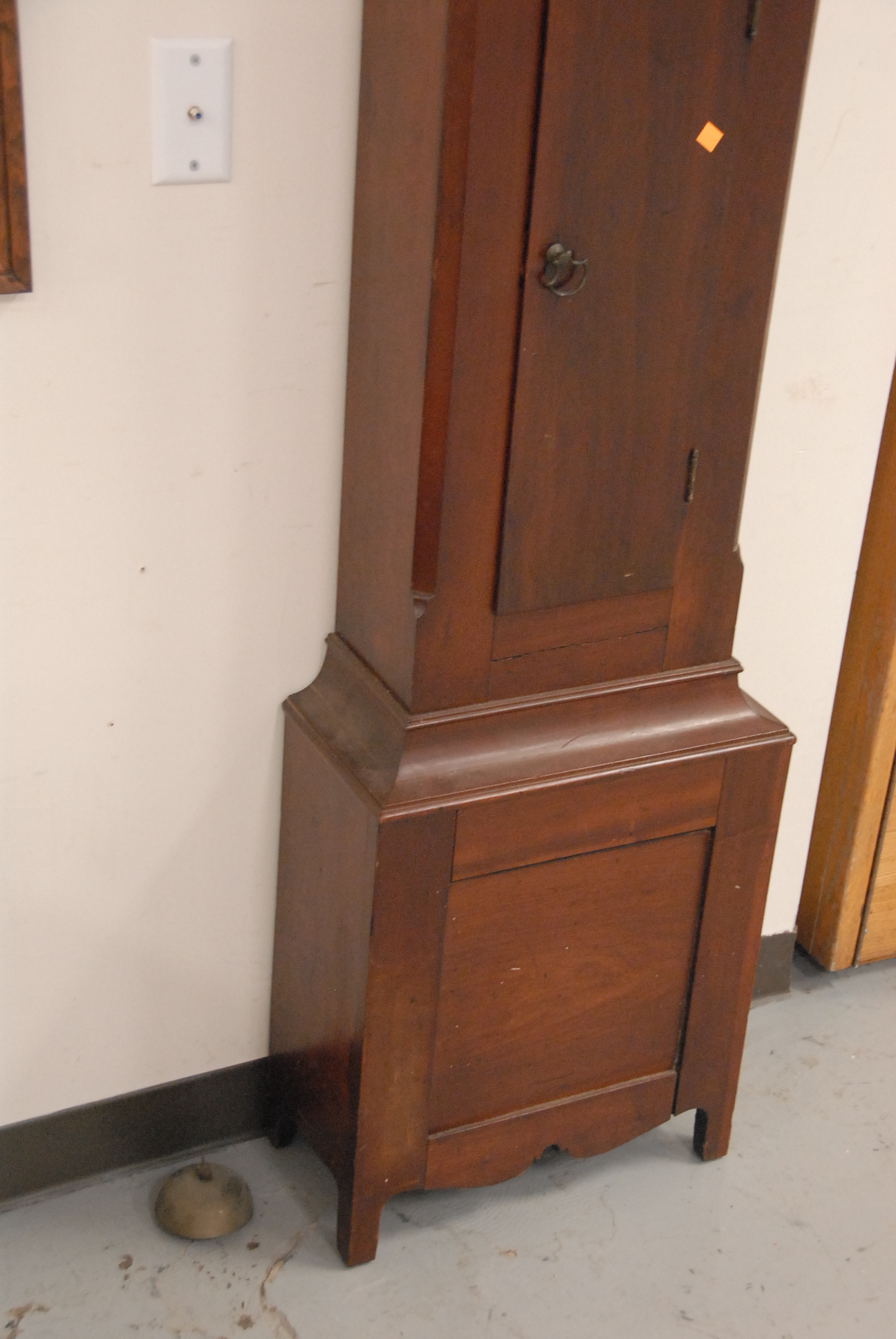 Federal tall clock with broken arch top over tombstone wood dial, plain case with door on base set on bracket feet with brass works. ht. 81in.