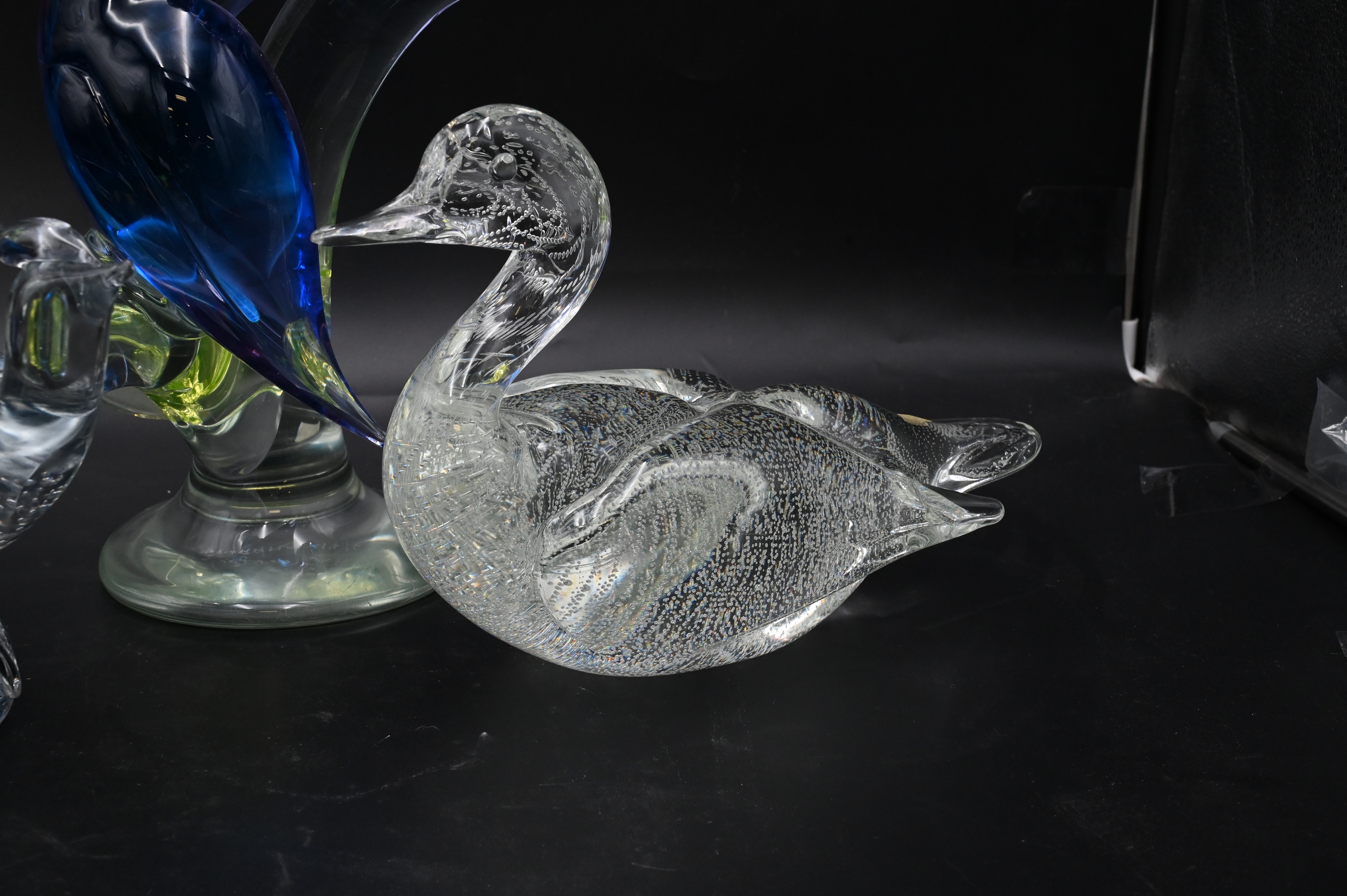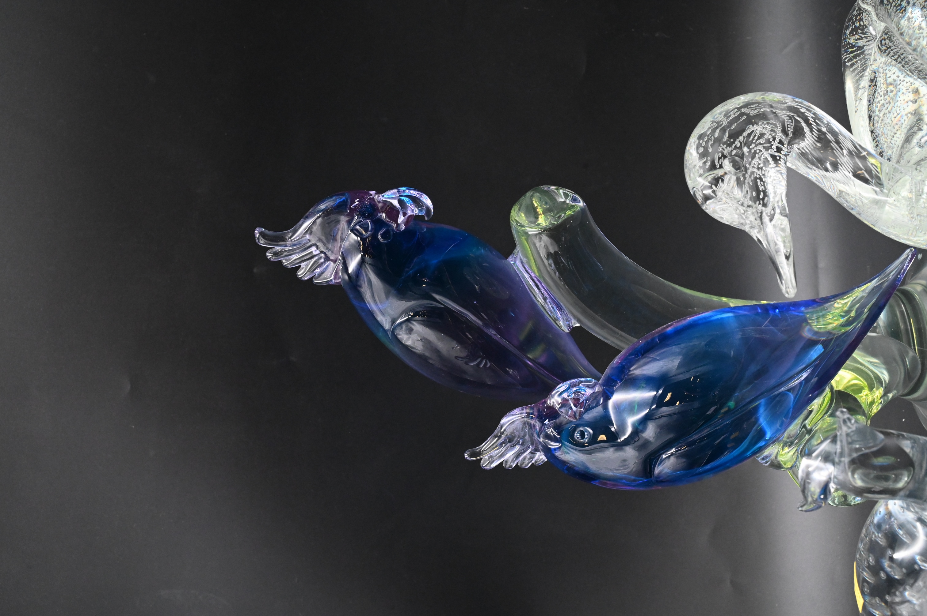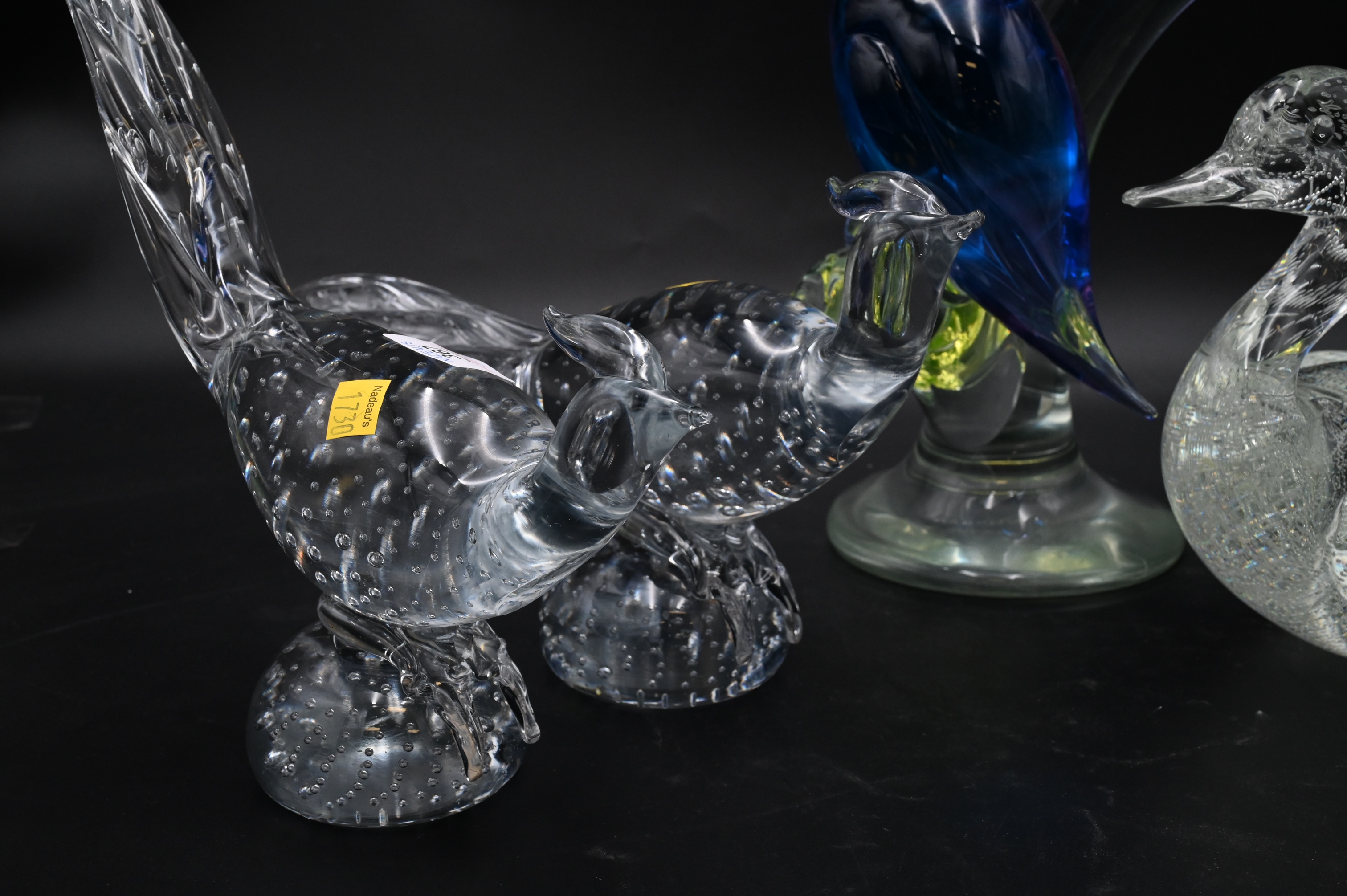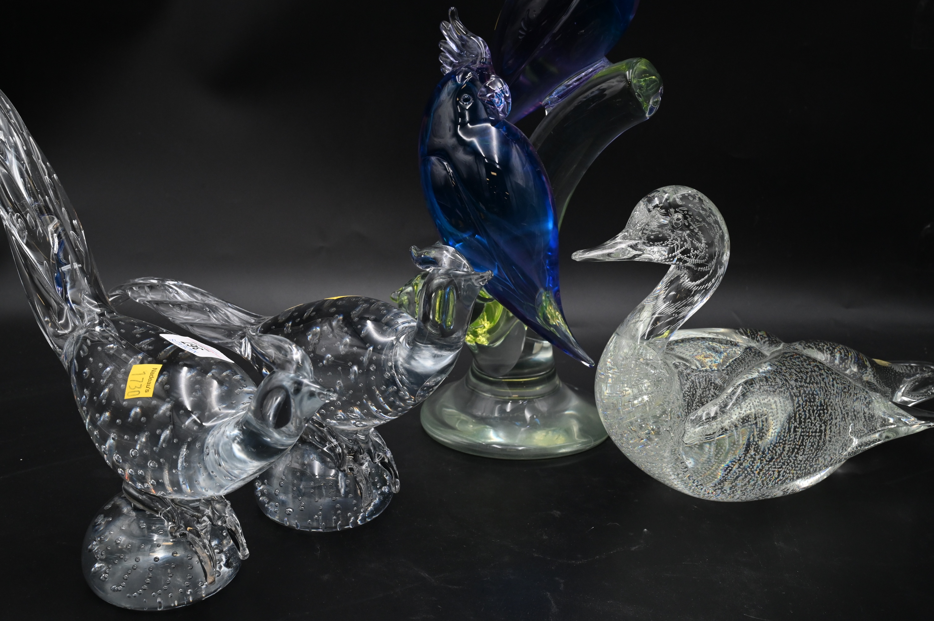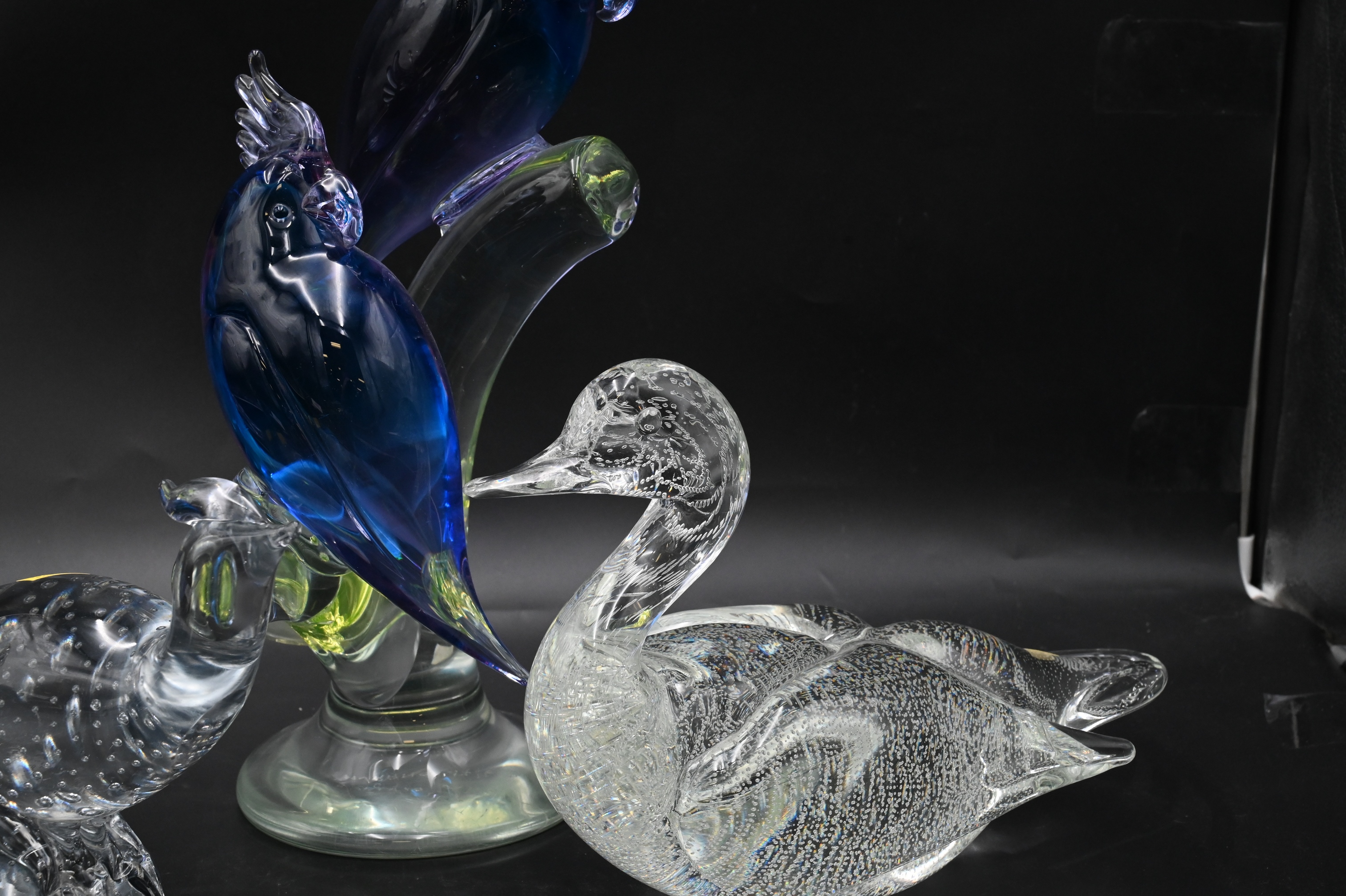 to include a pair of pheasant, duck with air bubbles and a double parrot figure signed Seguso Livio Murano on base