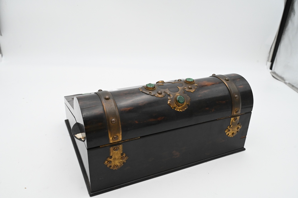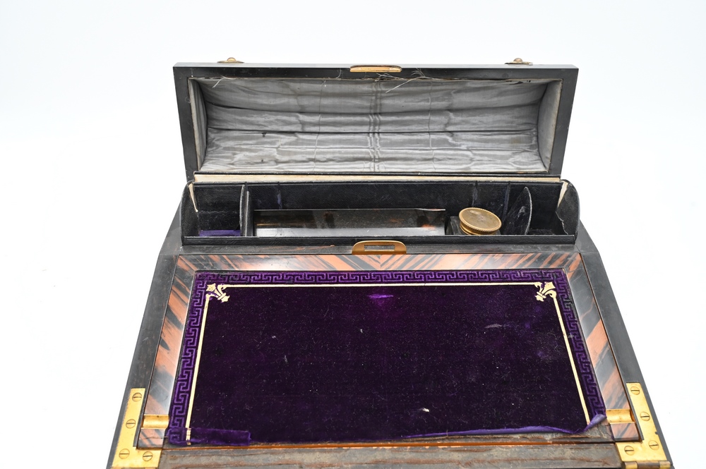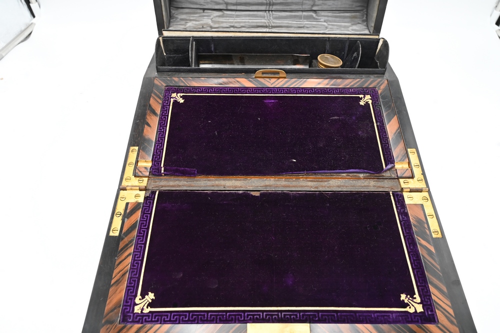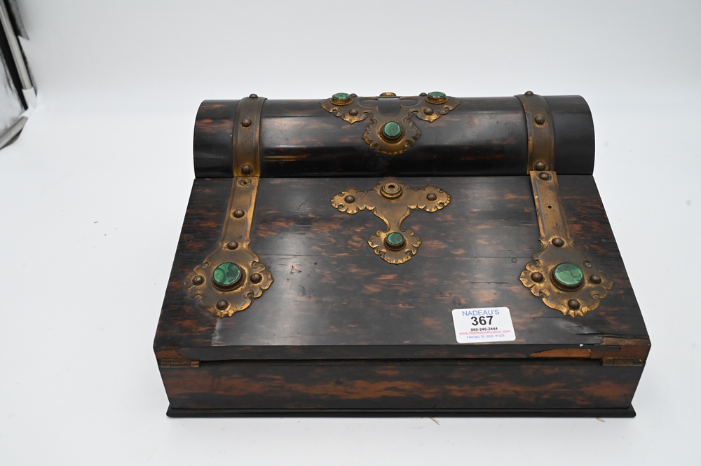 Lot 367: George Betjemann and Sons Travel Lap Desk, coromandel wood case with brass mounts and malachite jewels, velvet interior, as is, width 12 3/4 inches.