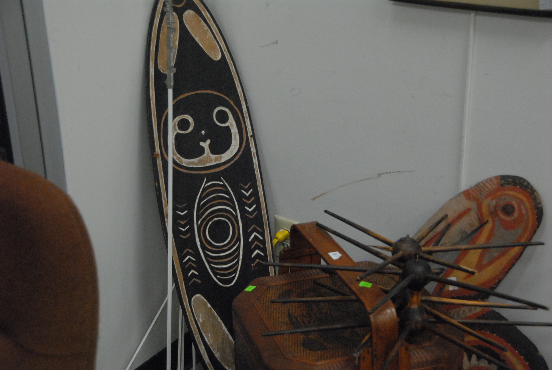 Lot 367: Group of eight items to include an elephant, wood box, three part box, shields, New Guinea masks, East African carving etc
