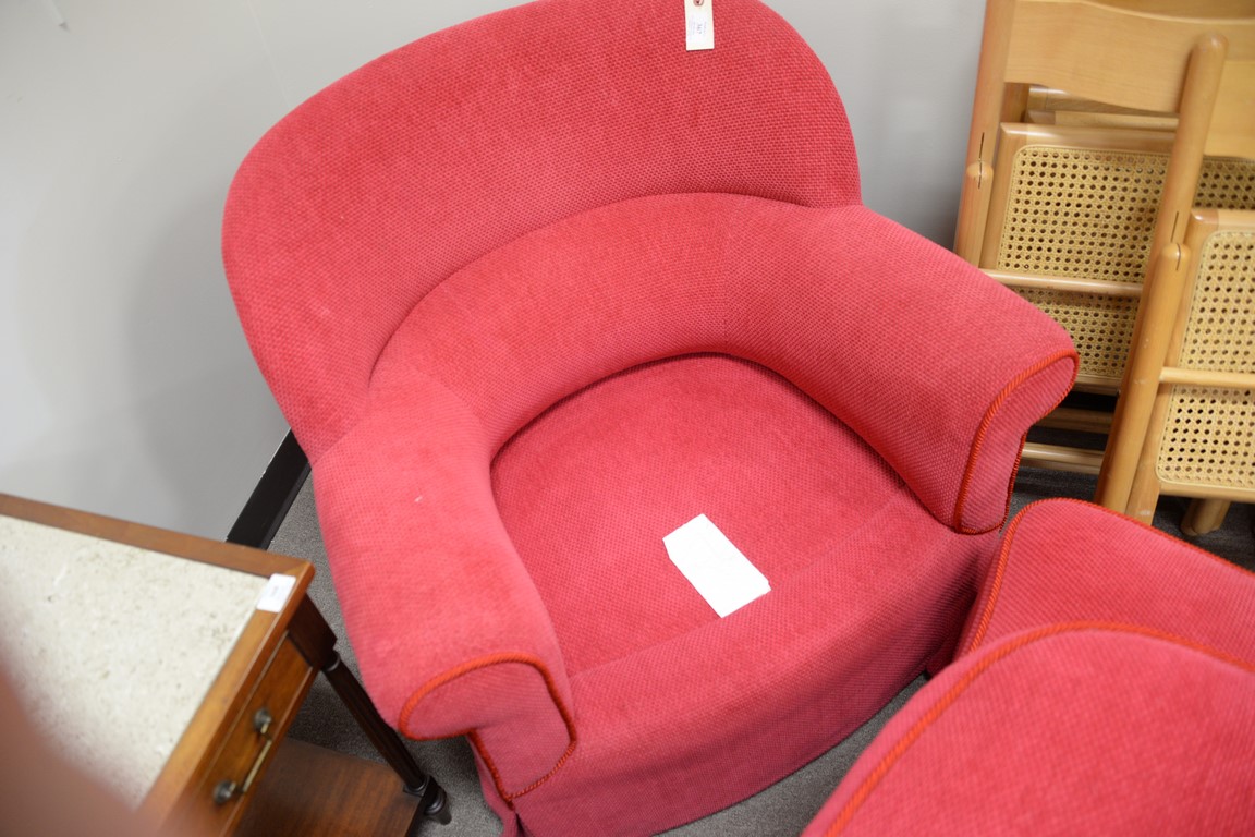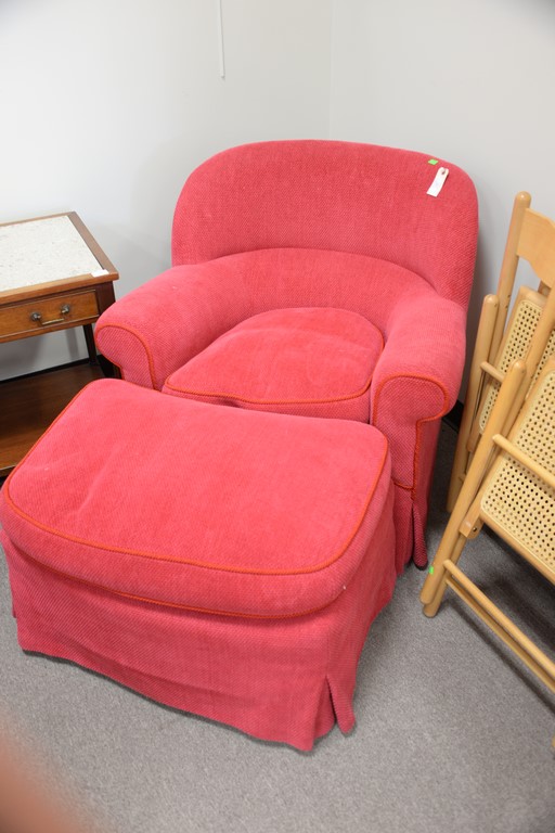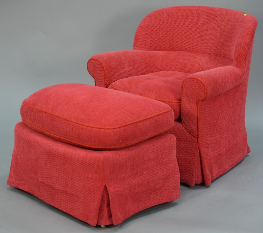 Lot 367: Henry Chan Furniture Co. New York, red upholstered swivel club chair with footstool and down filled cushions.