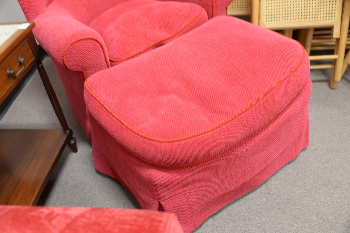 Henry Chan Furniture Co. New York, red upholstered swivel club chair with footstool and down filled cushions.