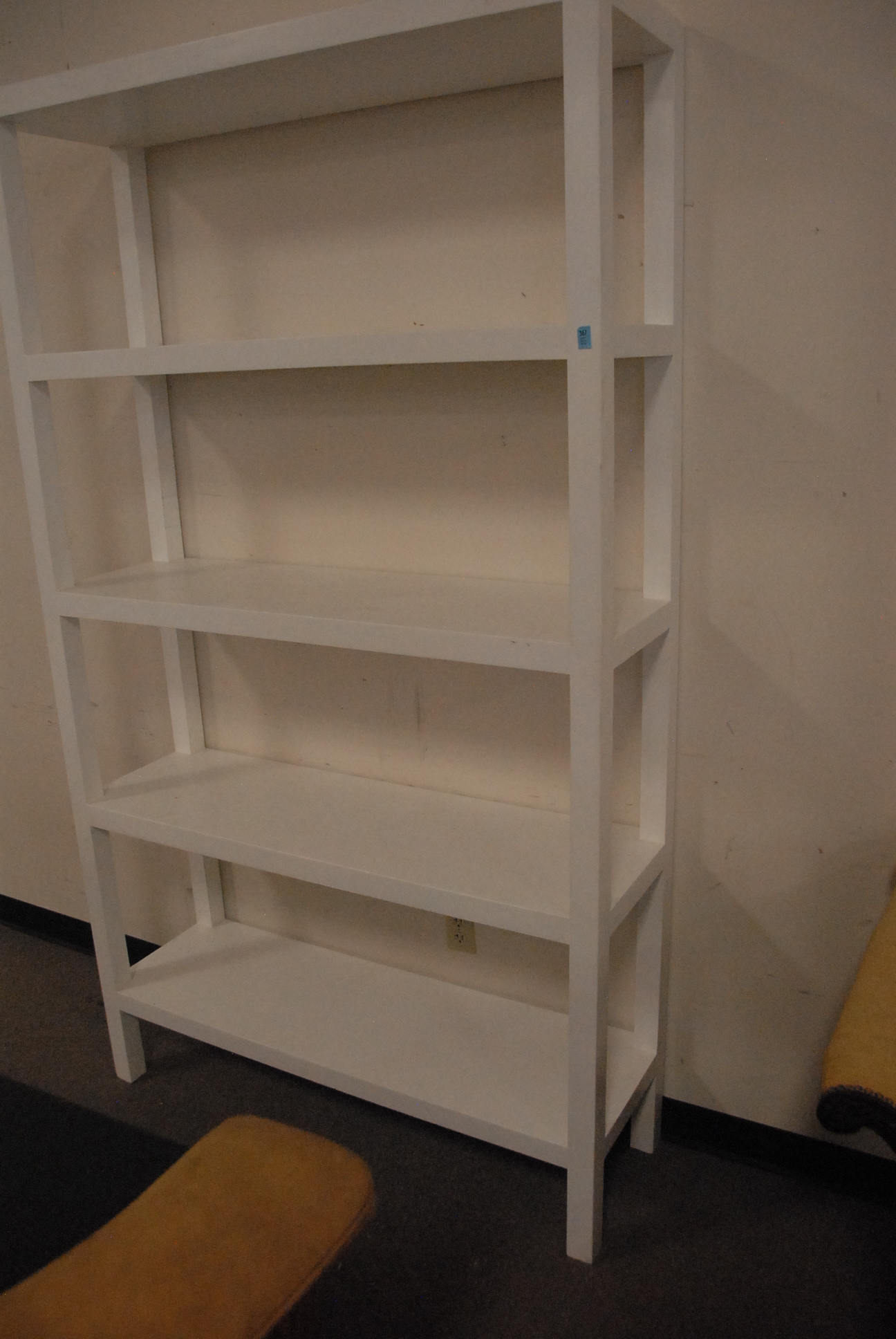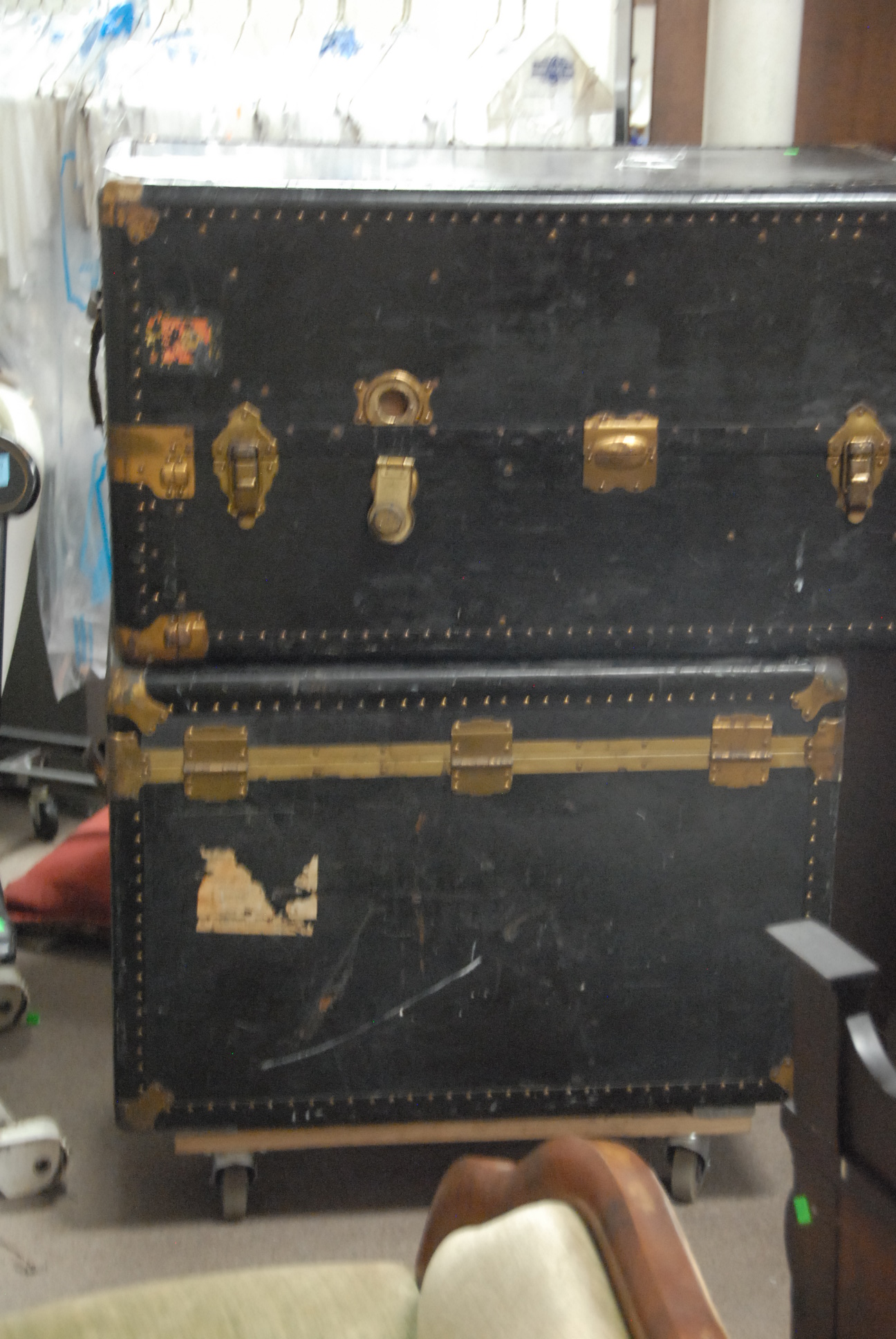 Large white shelf and two trunks.