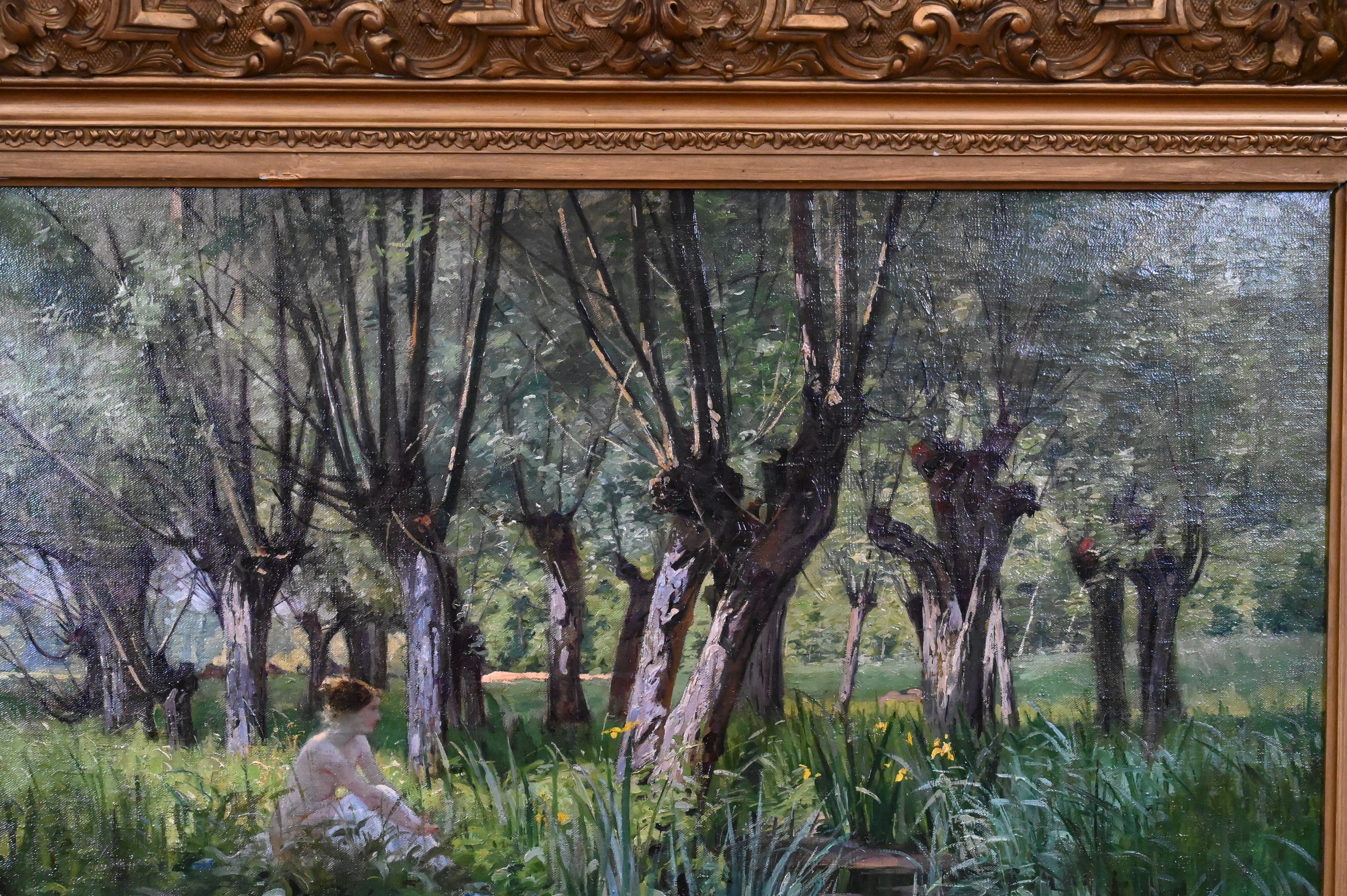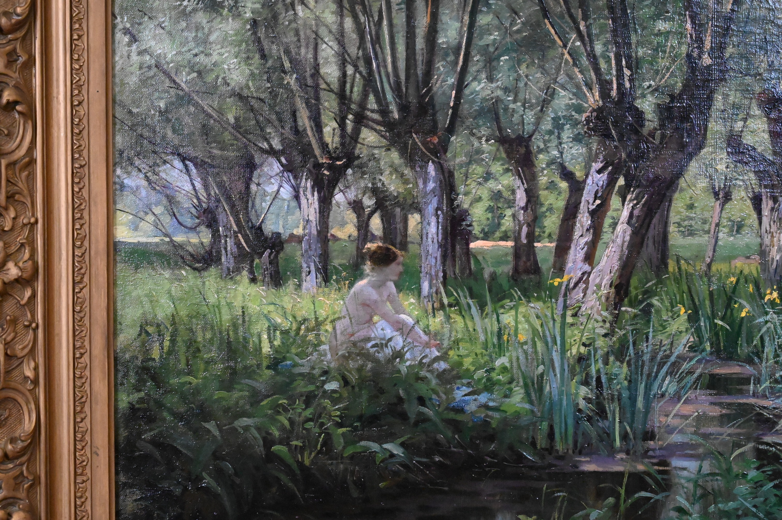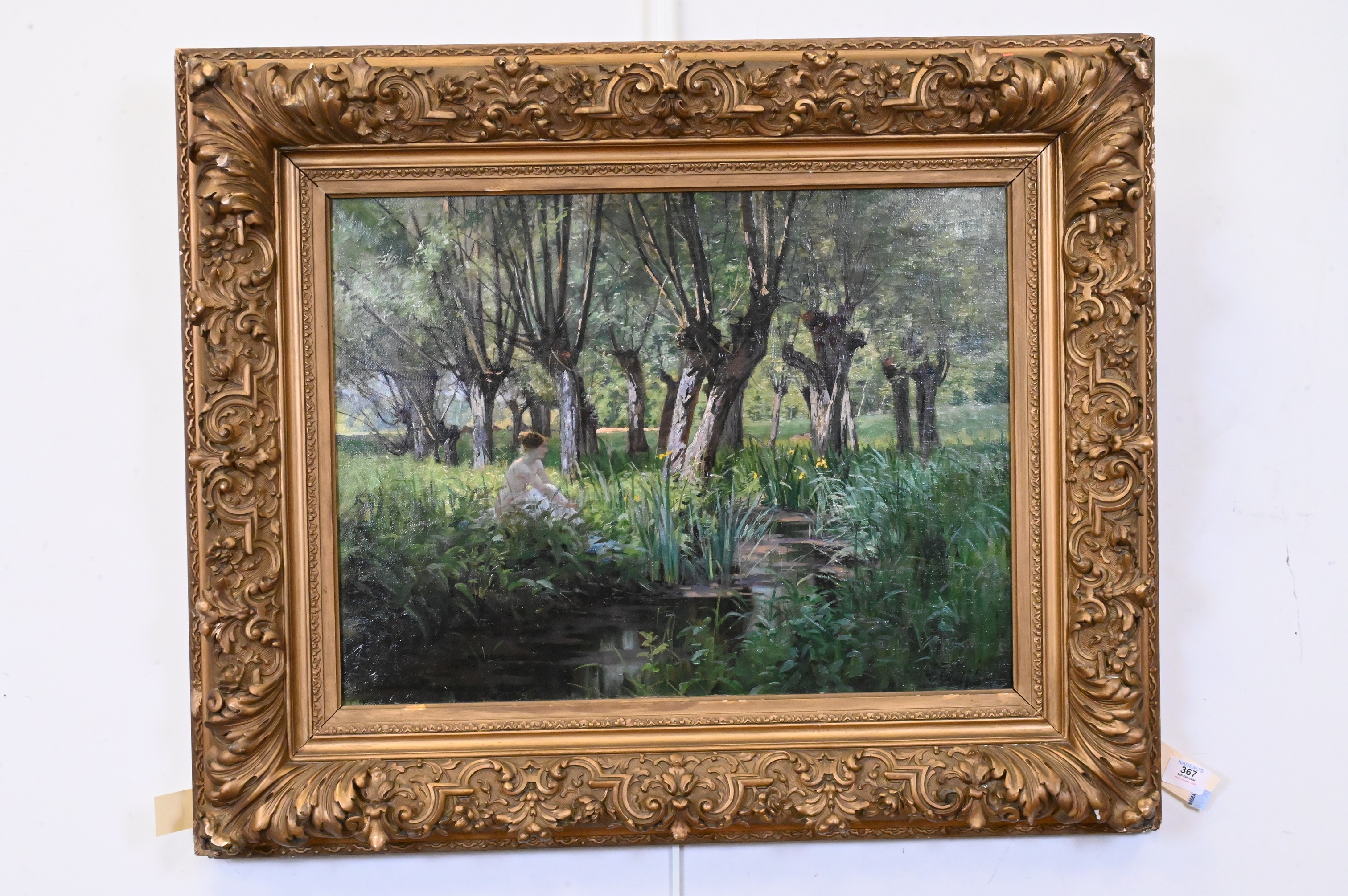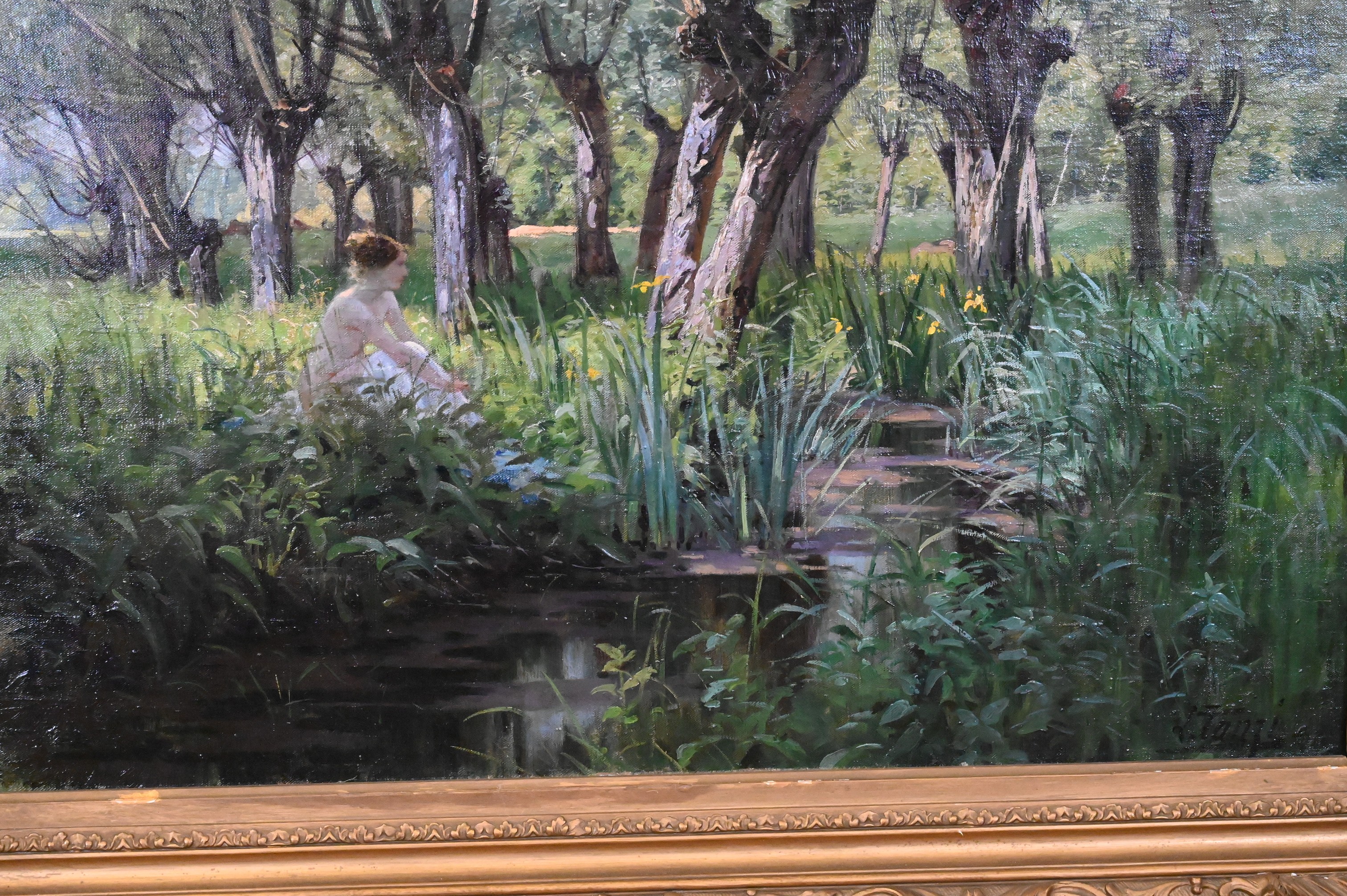 depicting a seated young woman beside a shaded stream within a lush grove, rendered in finely detailed naturalistic brushwork and soft, luminous tones characteristic of Tanzi’s romantic scenes