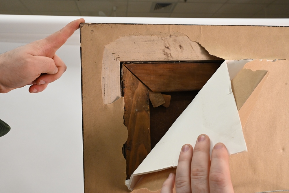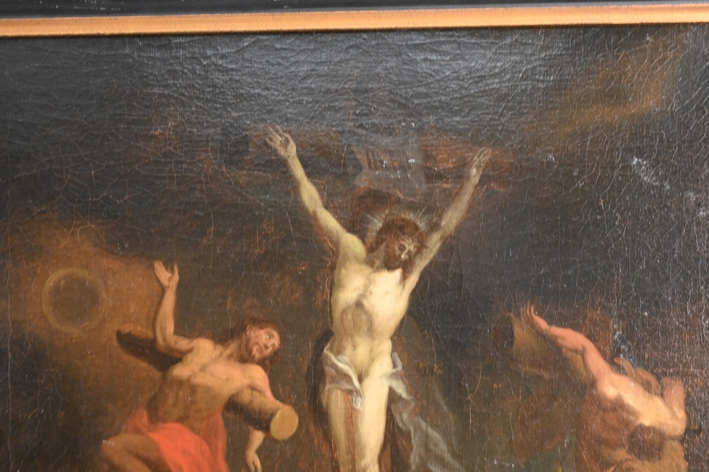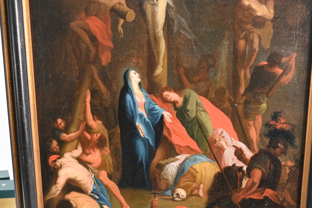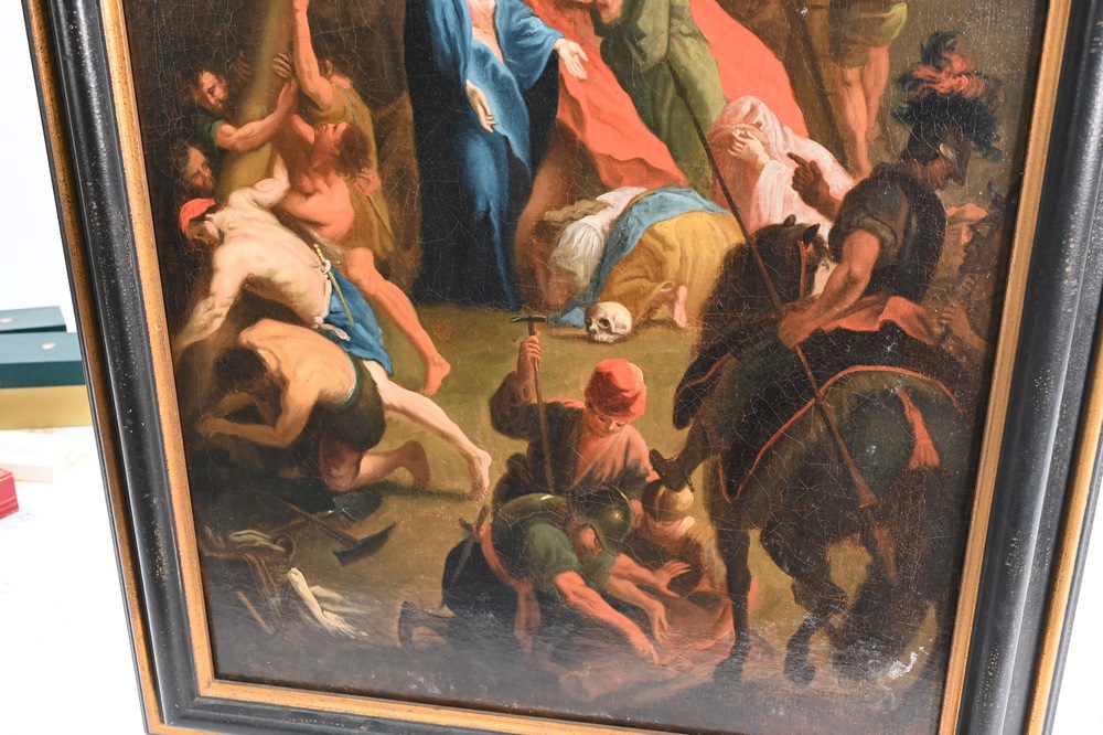 Lot 367: Old Master School, portrait painting scene of fighting soldiers that put Jesus on the cross, having skull and Mary in center, oil on…