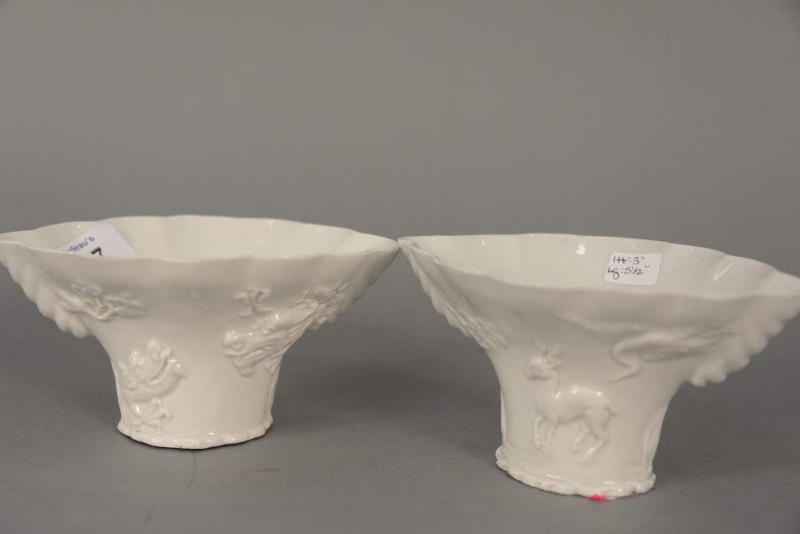 Pair of Chinese porcelain cups, molded in a horn form with dragons and a white glaze. ht. 3 in. lg. 5 1/2 in.