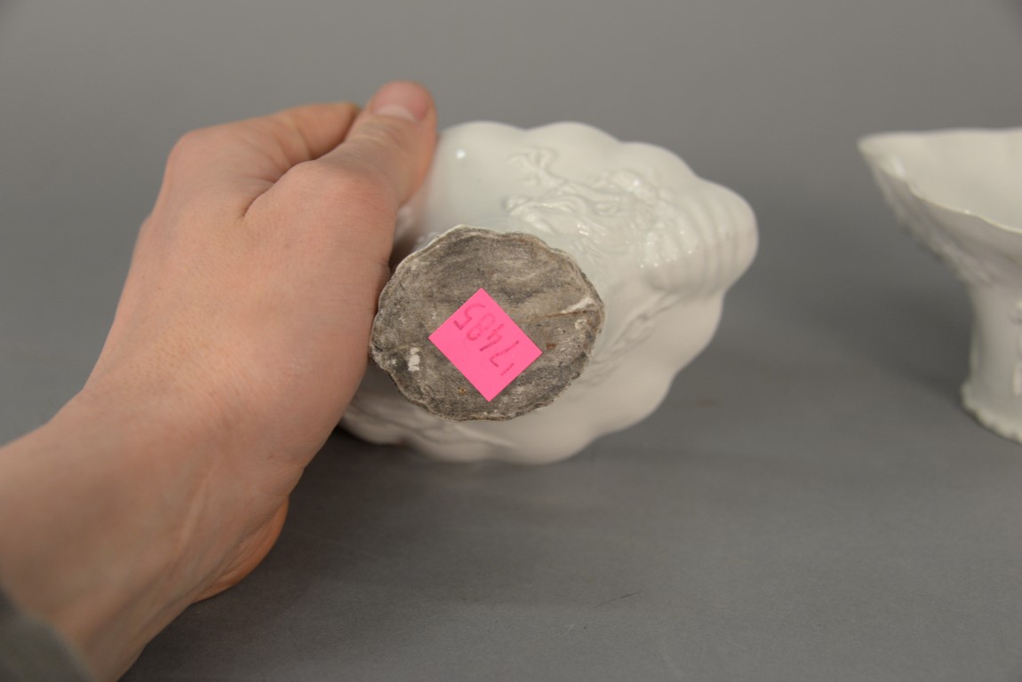 Lot 367: Pair of Chinese porcelain cups, molded in a horn form with dragons and a white glaze. ht. 3 in. lg. 5 1/2 in.