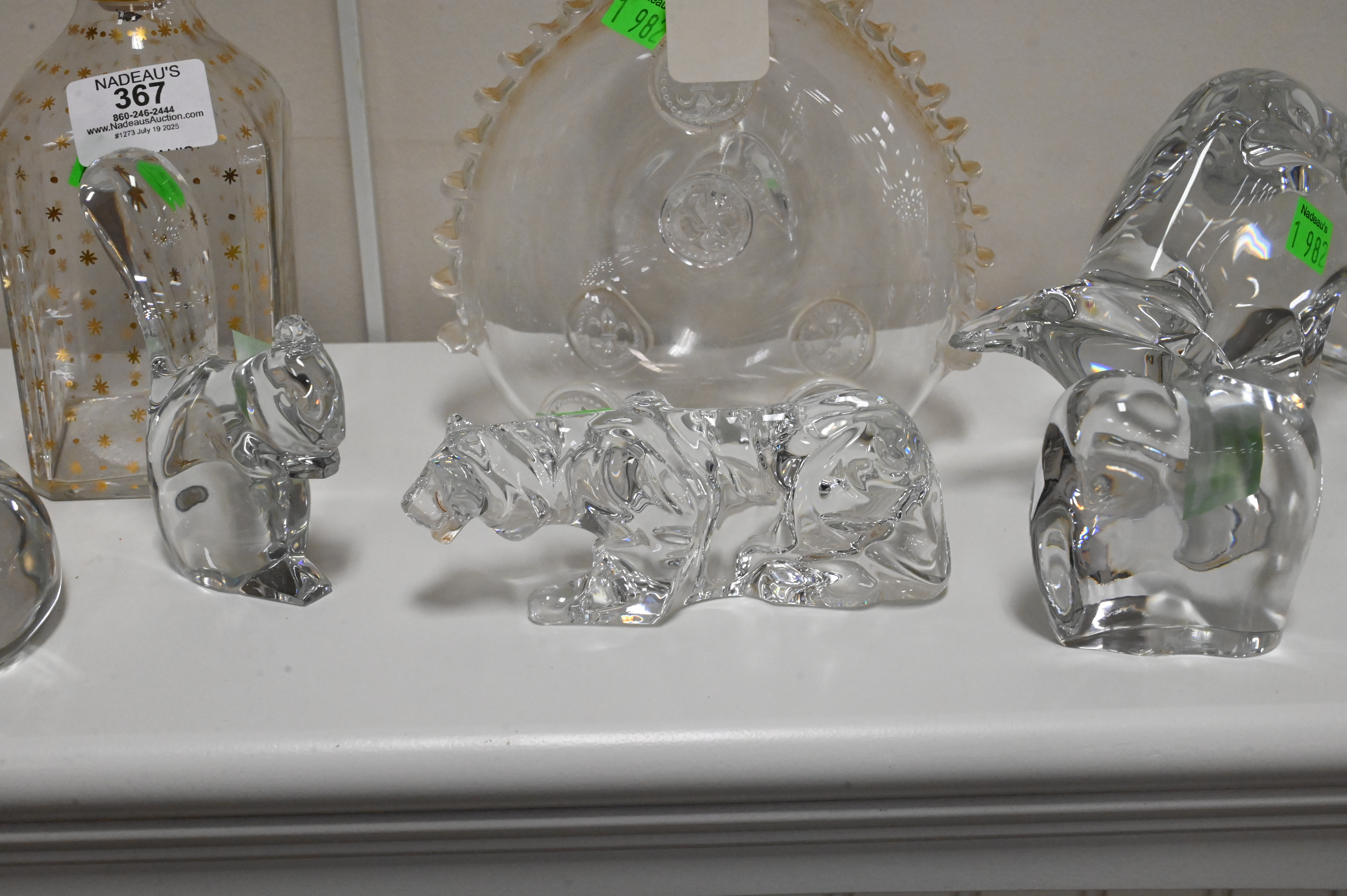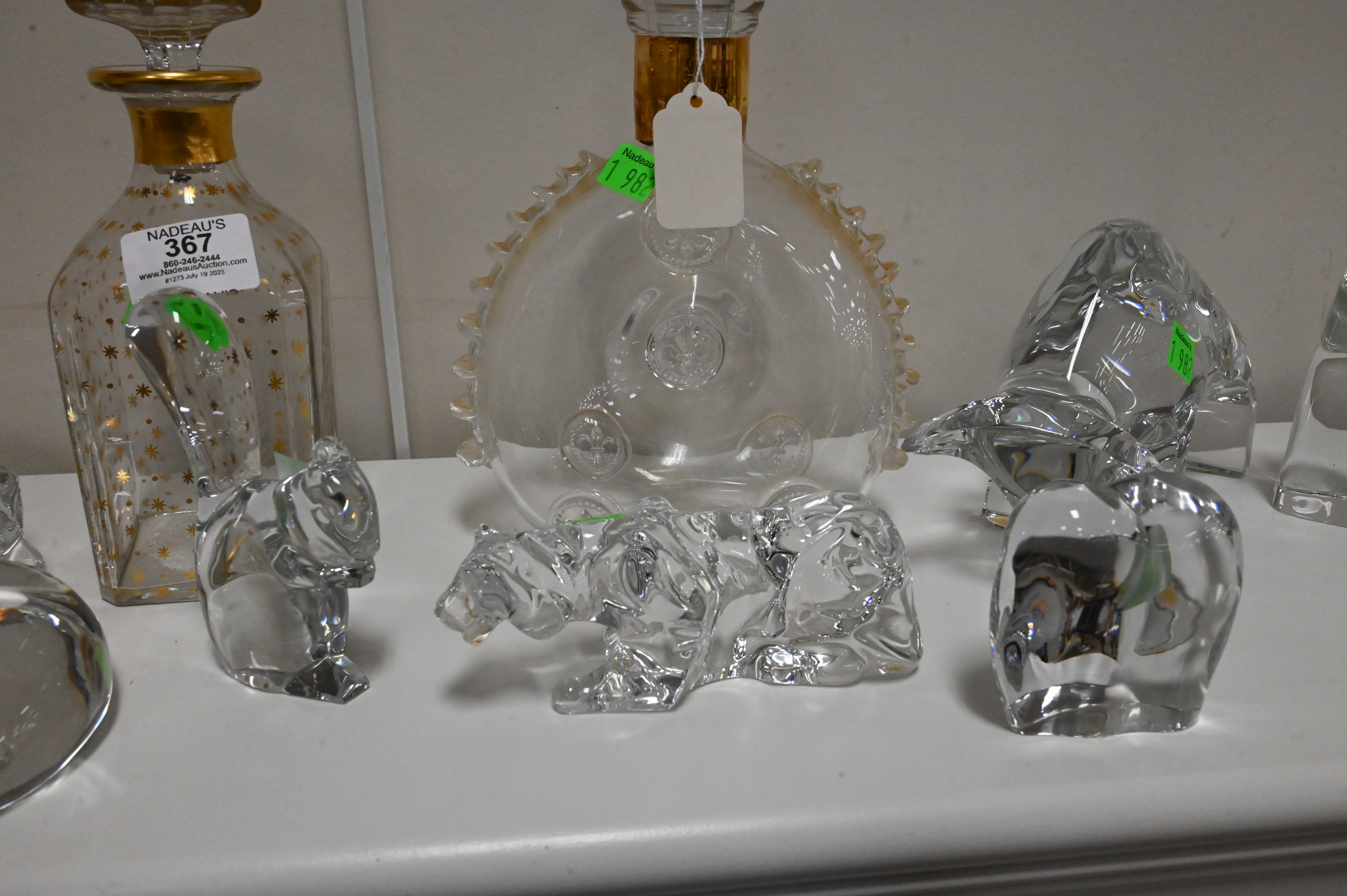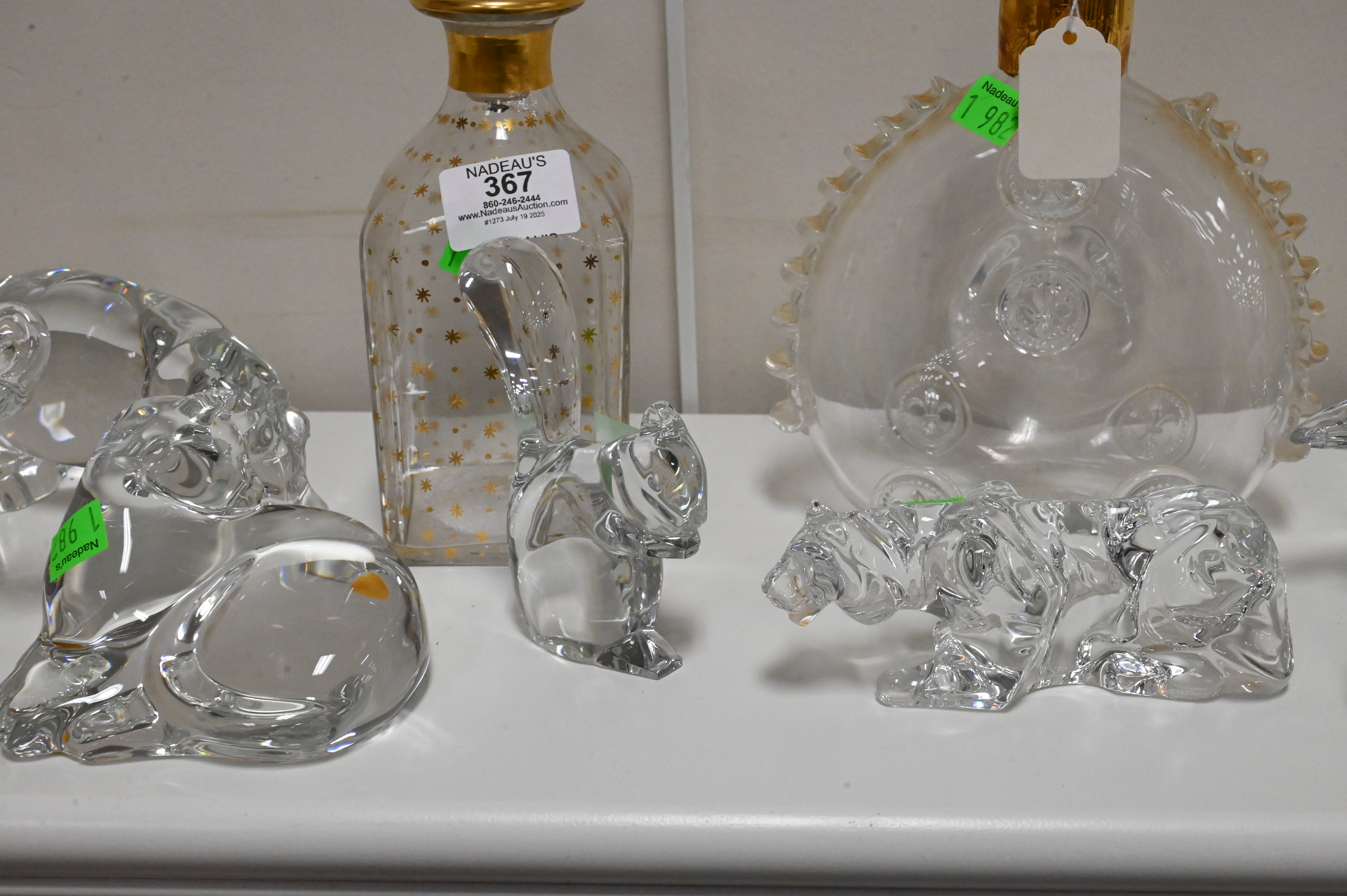Remy Martin cognac decanter Louis Xlll (purchased $4,929) Napoleon III gilt decanter, hippo, nautilus shell, squirrel, tiger, cat, Wall Street Bull (purchased $1,460) two elephants, giraffe, lidded jar