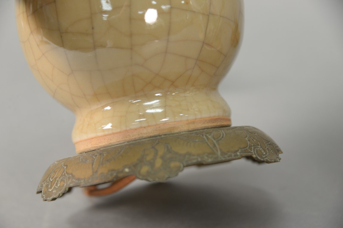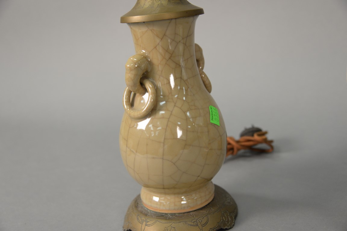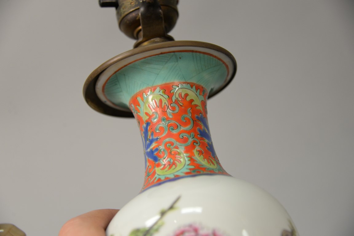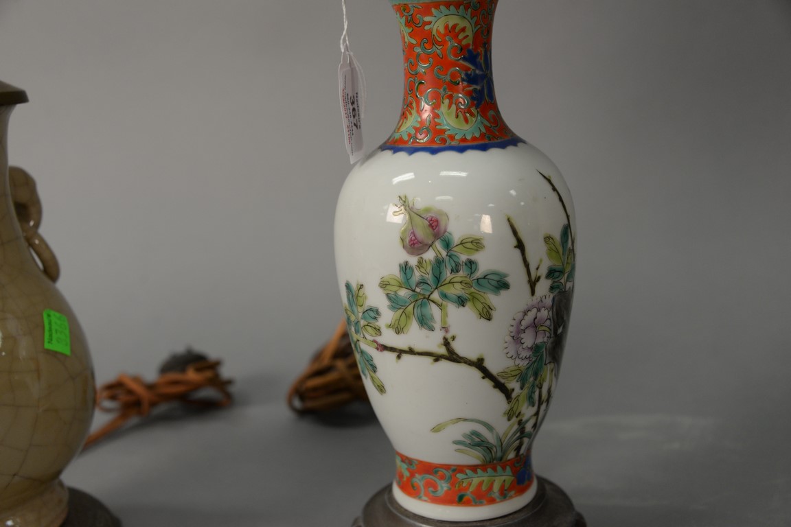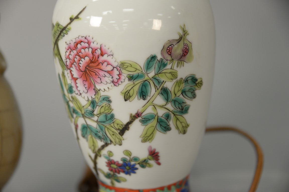 Two Chinese porcelain vases to include a small famille rose baluster form vase with hand painted flowers drilled and a crackle glazed tan vase made into a table lamp.