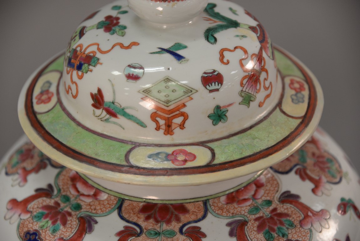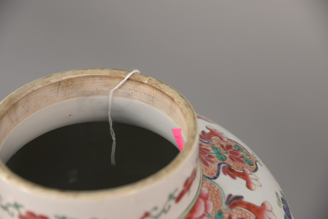 Chinese covered jar, ovoid form with furniture, flowers, and butterflies cover repaired. ht. 17 in.
