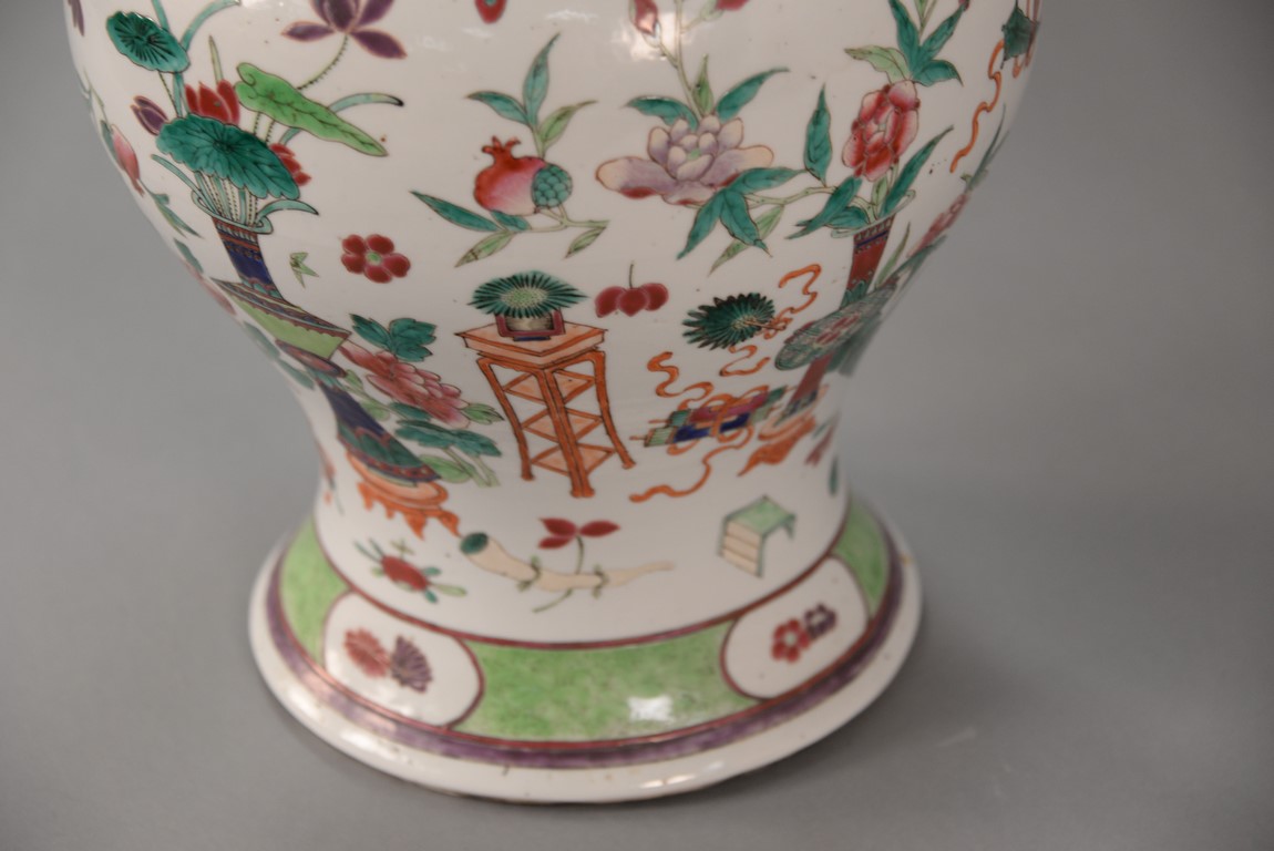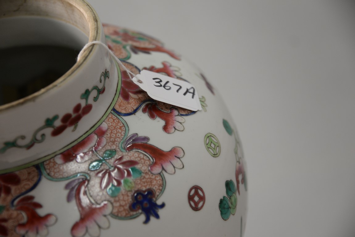 Lot 367A: Chinese covered jar, ovoid form with furniture, flowers, and butterflies cover repaired. ht. 17 in.