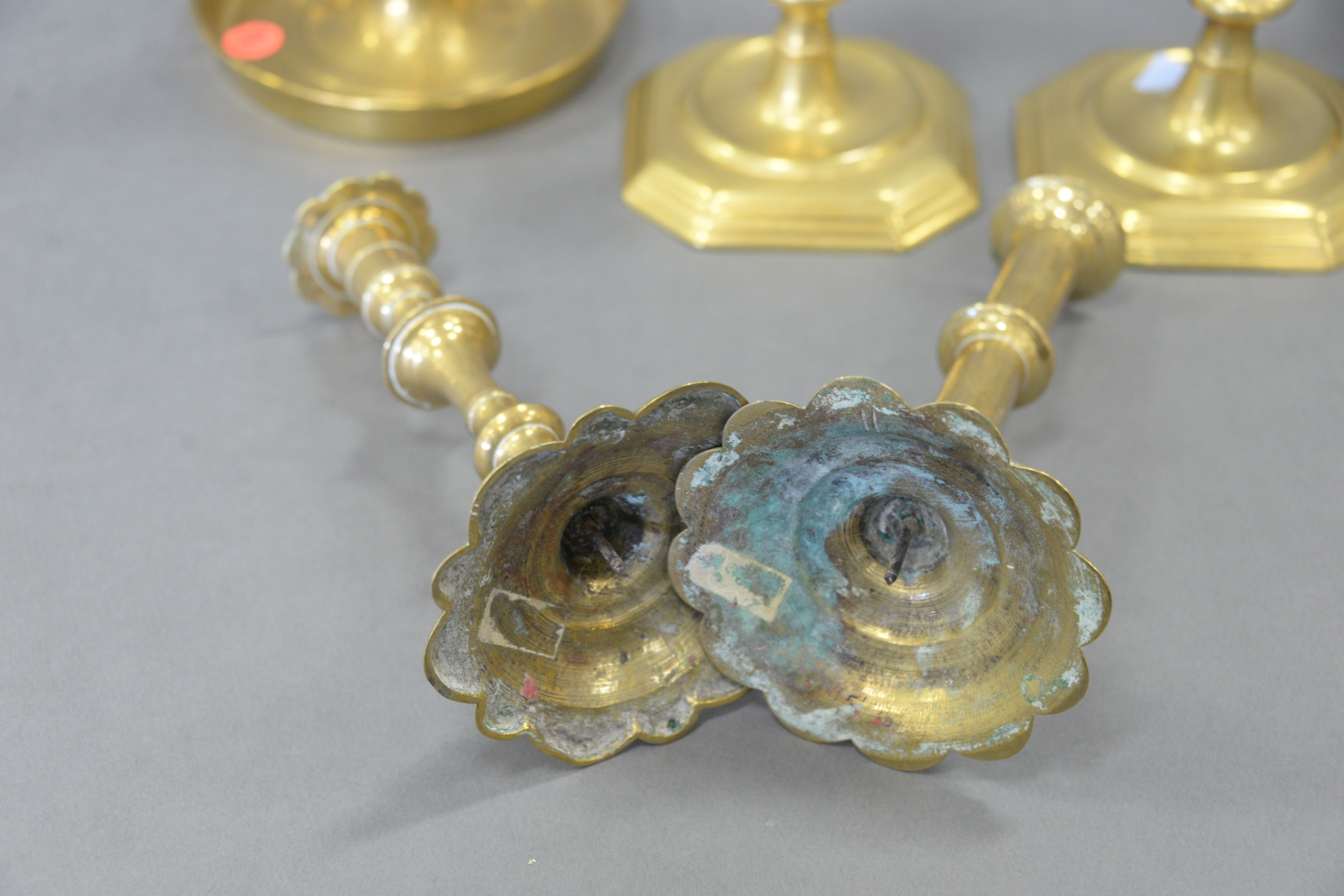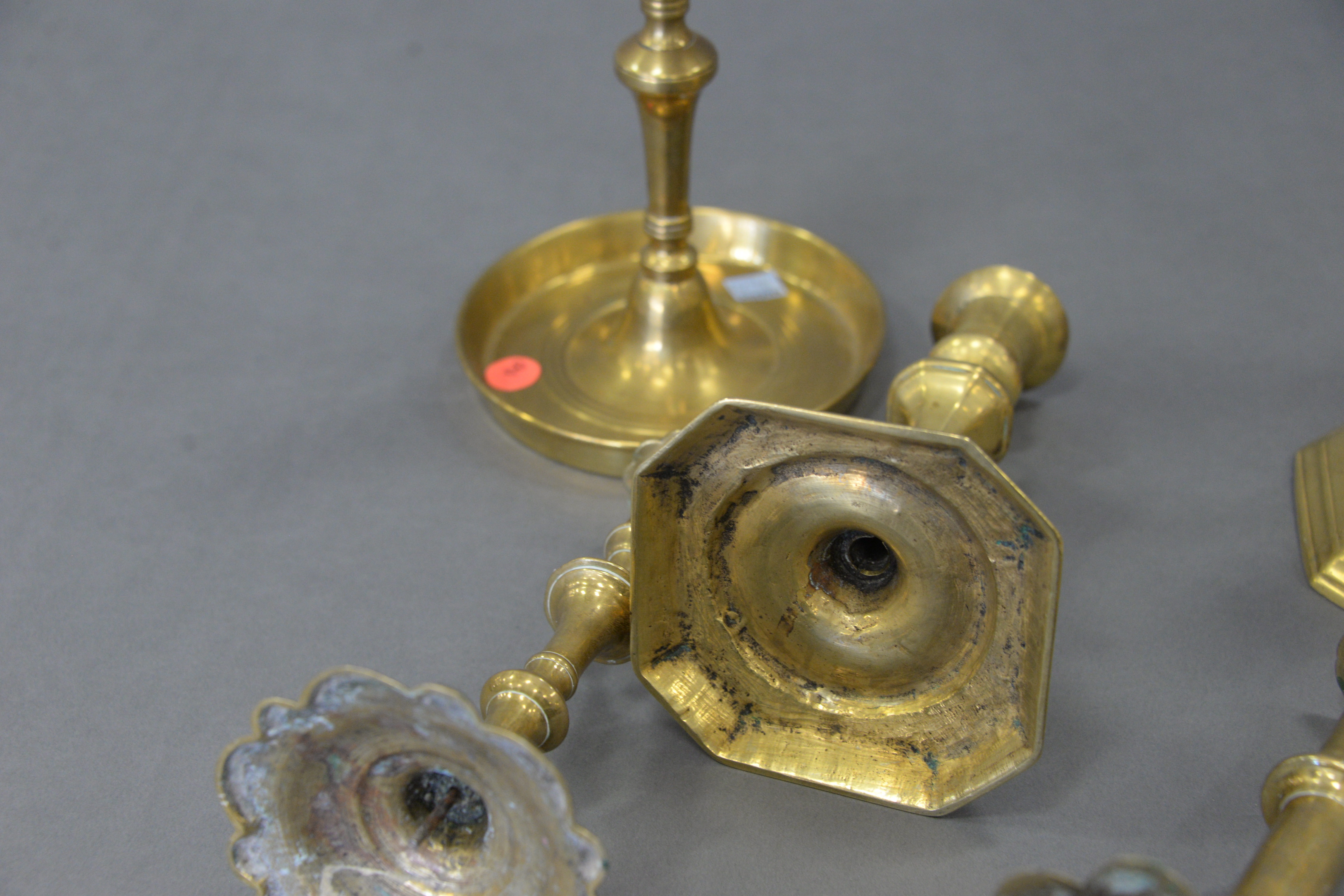 Three Pairs of Brass Candlesticks to include, two Queen Anne petal base, height 7 1/2 inches, pair of shaped base, height 8 inches, along with pair with bells, height 12 inches.