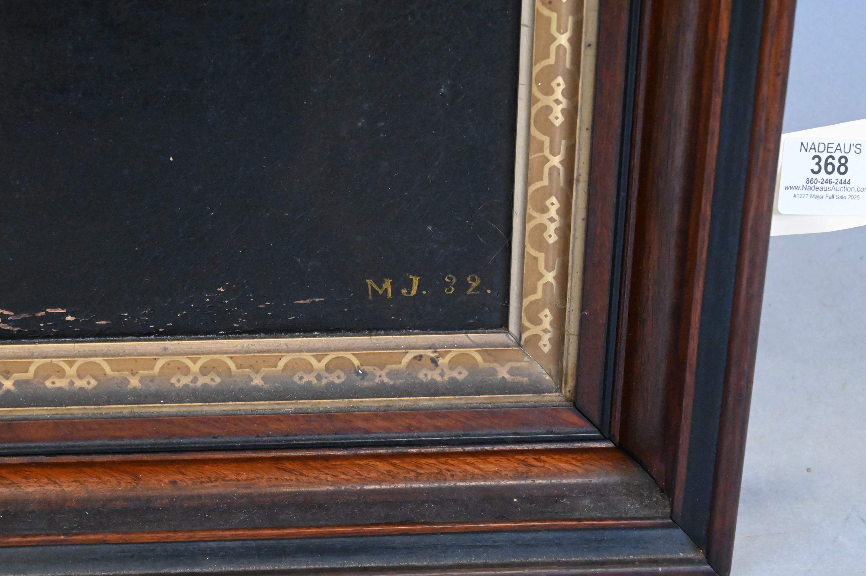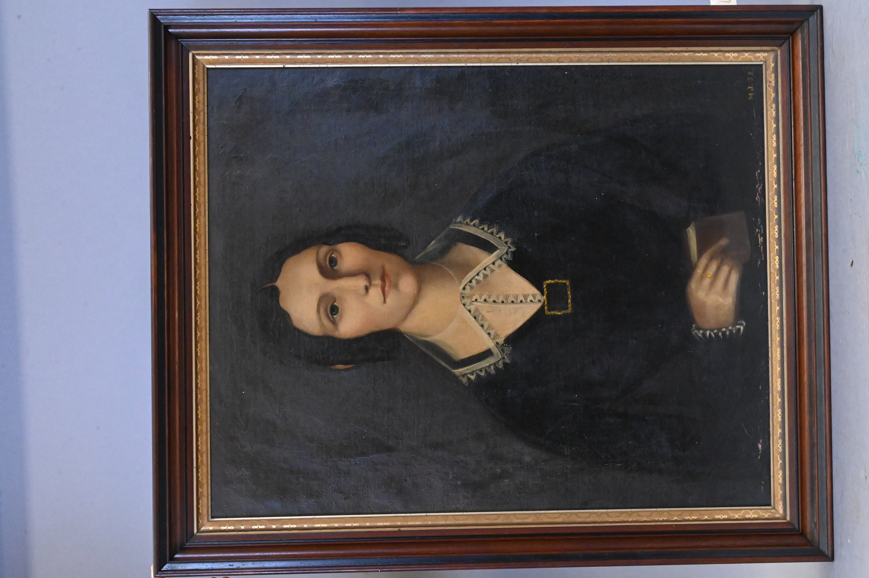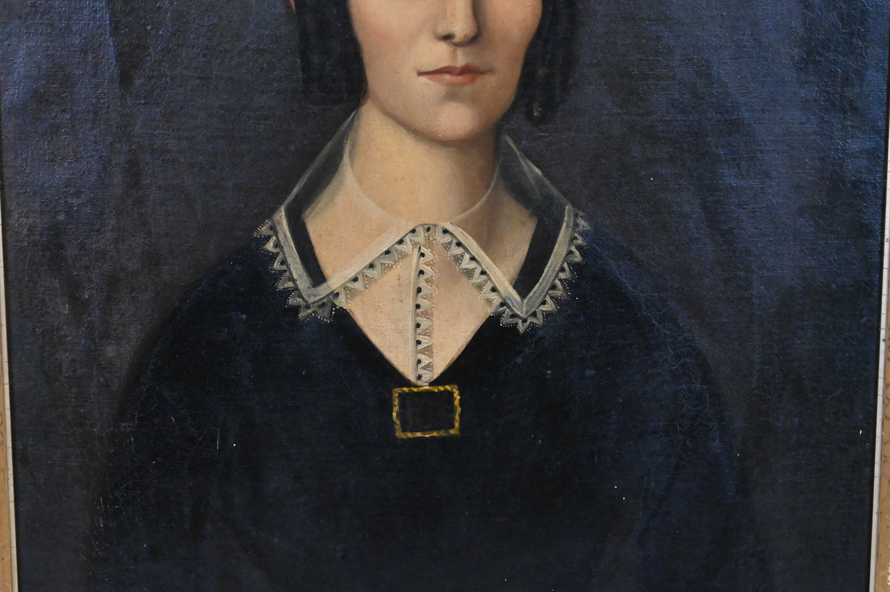 Depicting a woman with parted dark hair, dressed in a black gown with lace-trimmed collar and cuffs, holding a small book in her hands. Executed with the flat modeling and direct gaze characteristic of American folk portraiture of the early 19th century