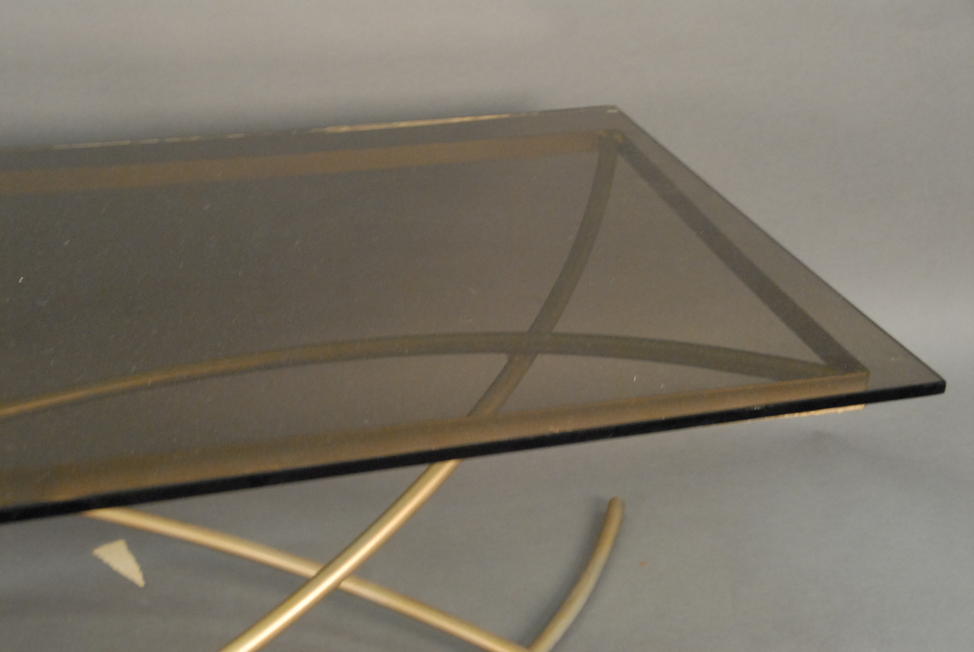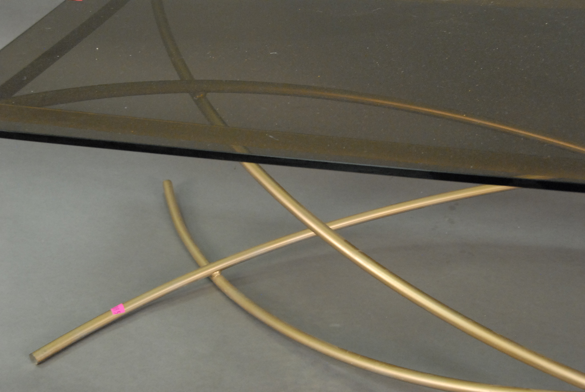 Contemporary coffee table with smoked glass top on a conjoined metal rod base.