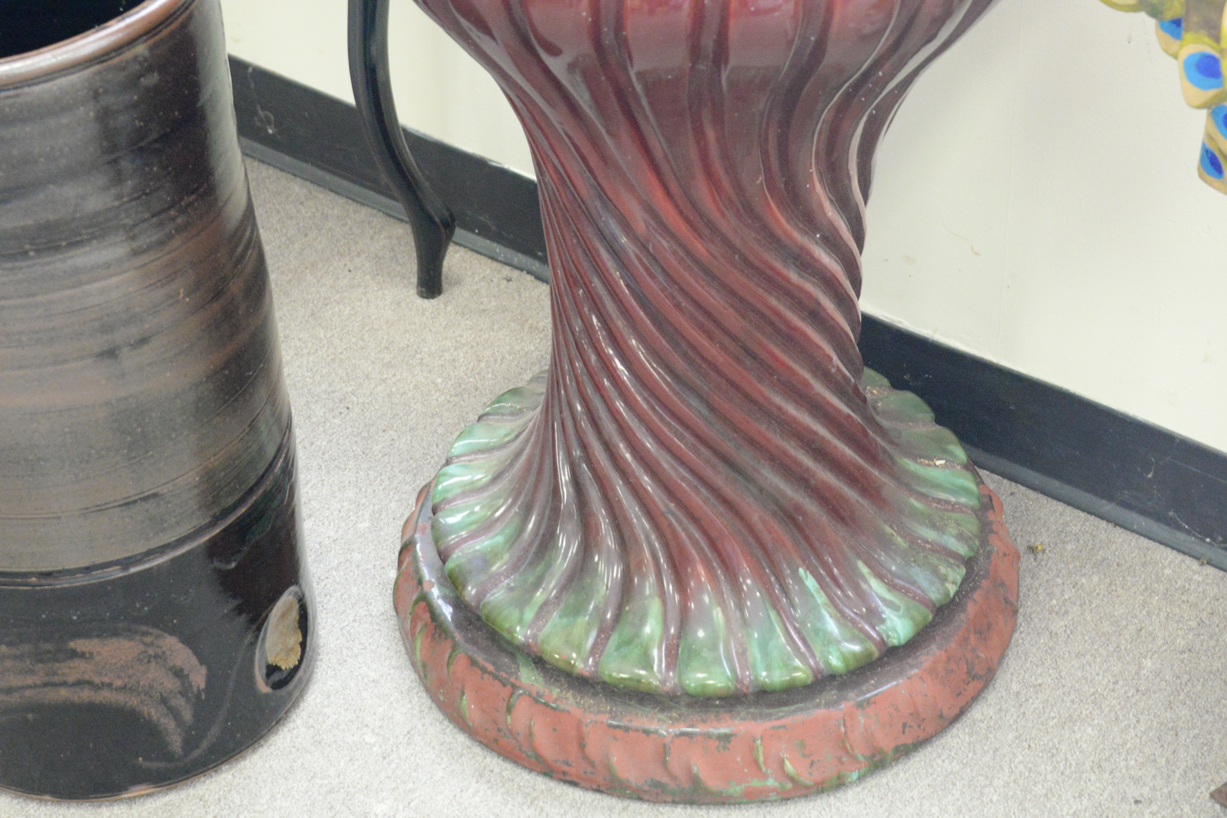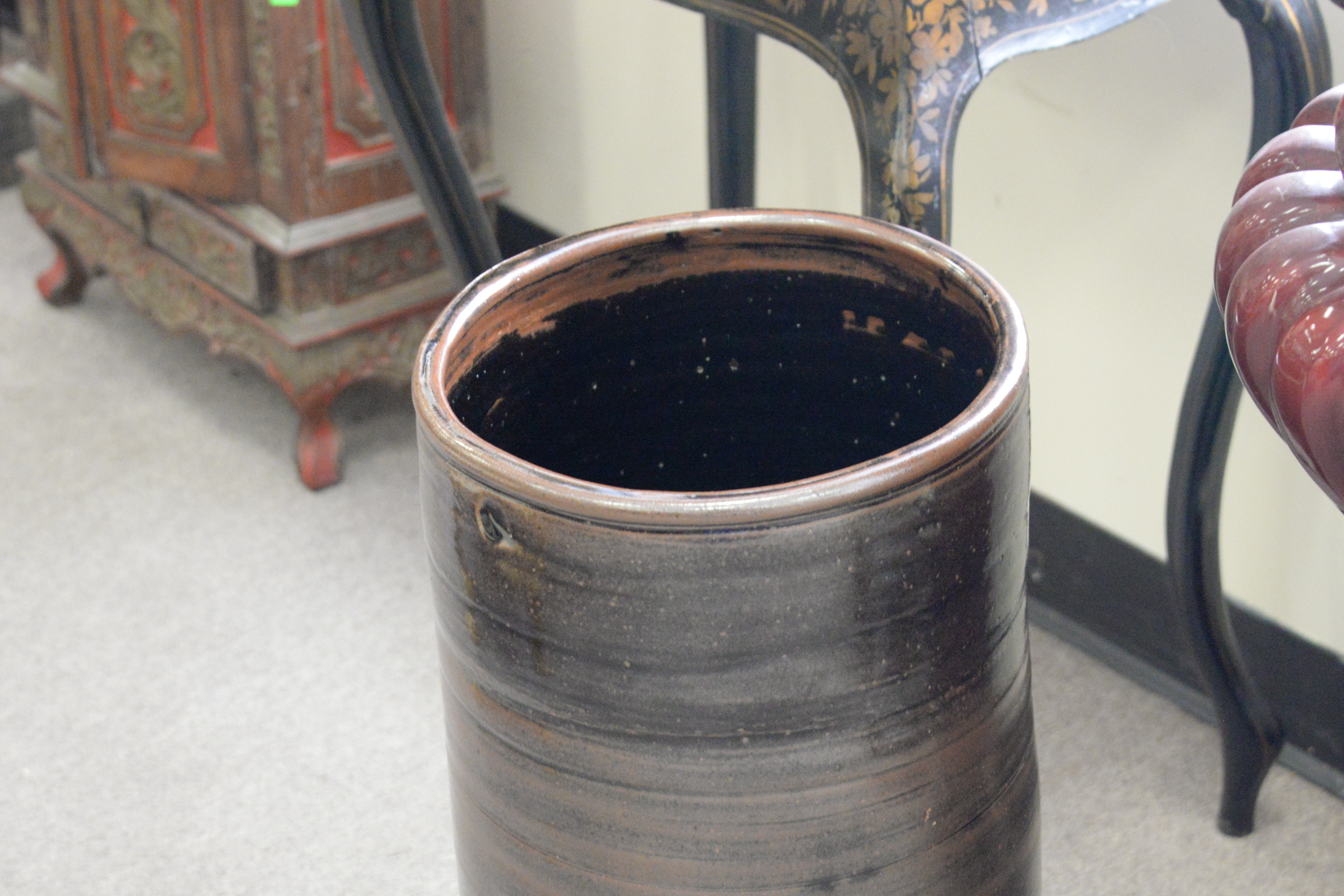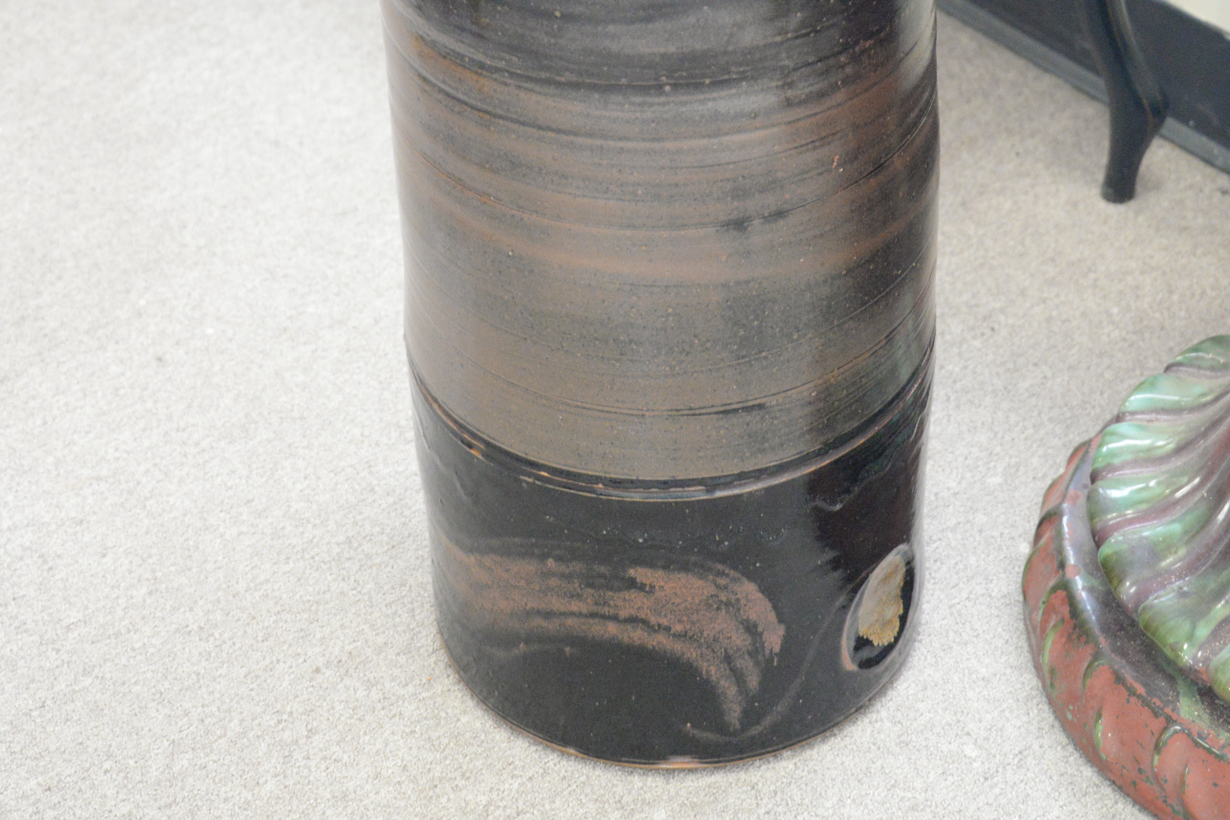 Two Piece Lot, to include, earthenware Jardiniere on stand, along with an umbrella holder, total height 44 inches, diameter 15 inches
