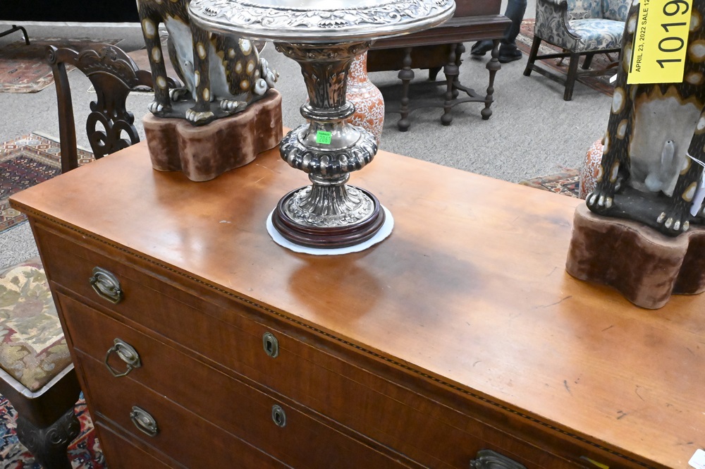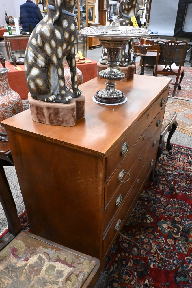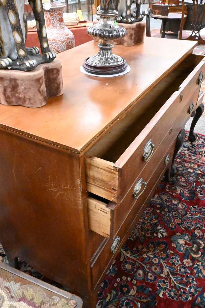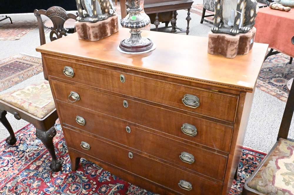 Lot 368: Federal Cherry and Mahogany Four Drawer Chest, on french feet, circa 1800, height 36 1/4 inches, width 41 inches. Provenance: Estate of Wallace Bradway, New Haven, CT.