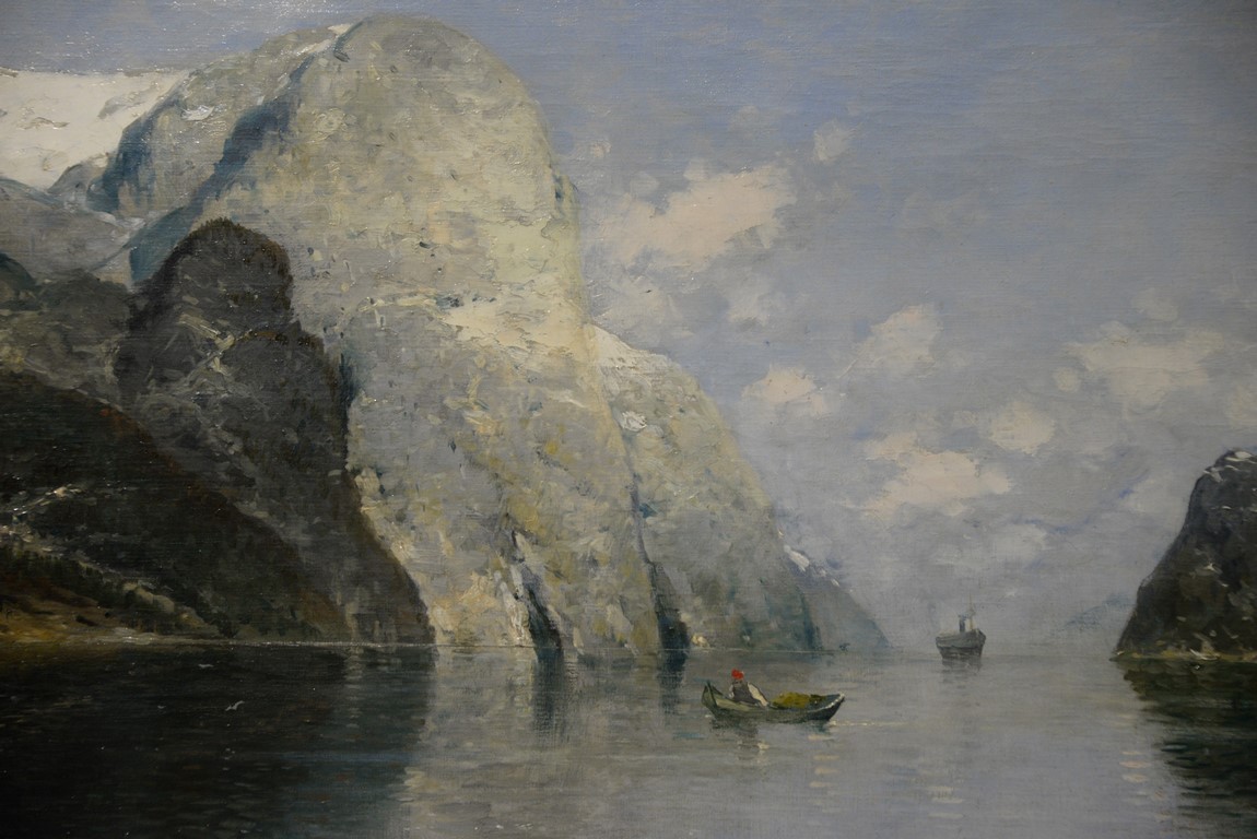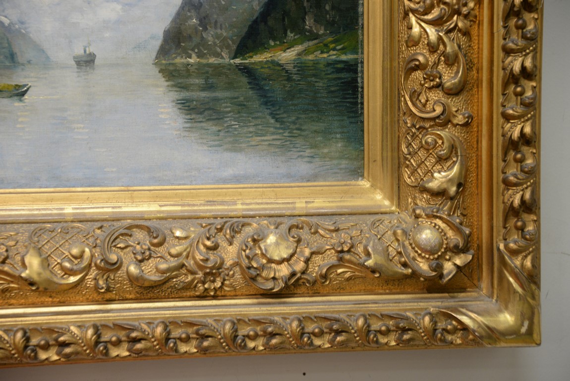 Lot 368: GEORG ANTON RASMUSSEN 1842-1914 Blue Skies at Fjord oil on canvas signed lower left A.G. Rasmussen 20 3/4 x 31