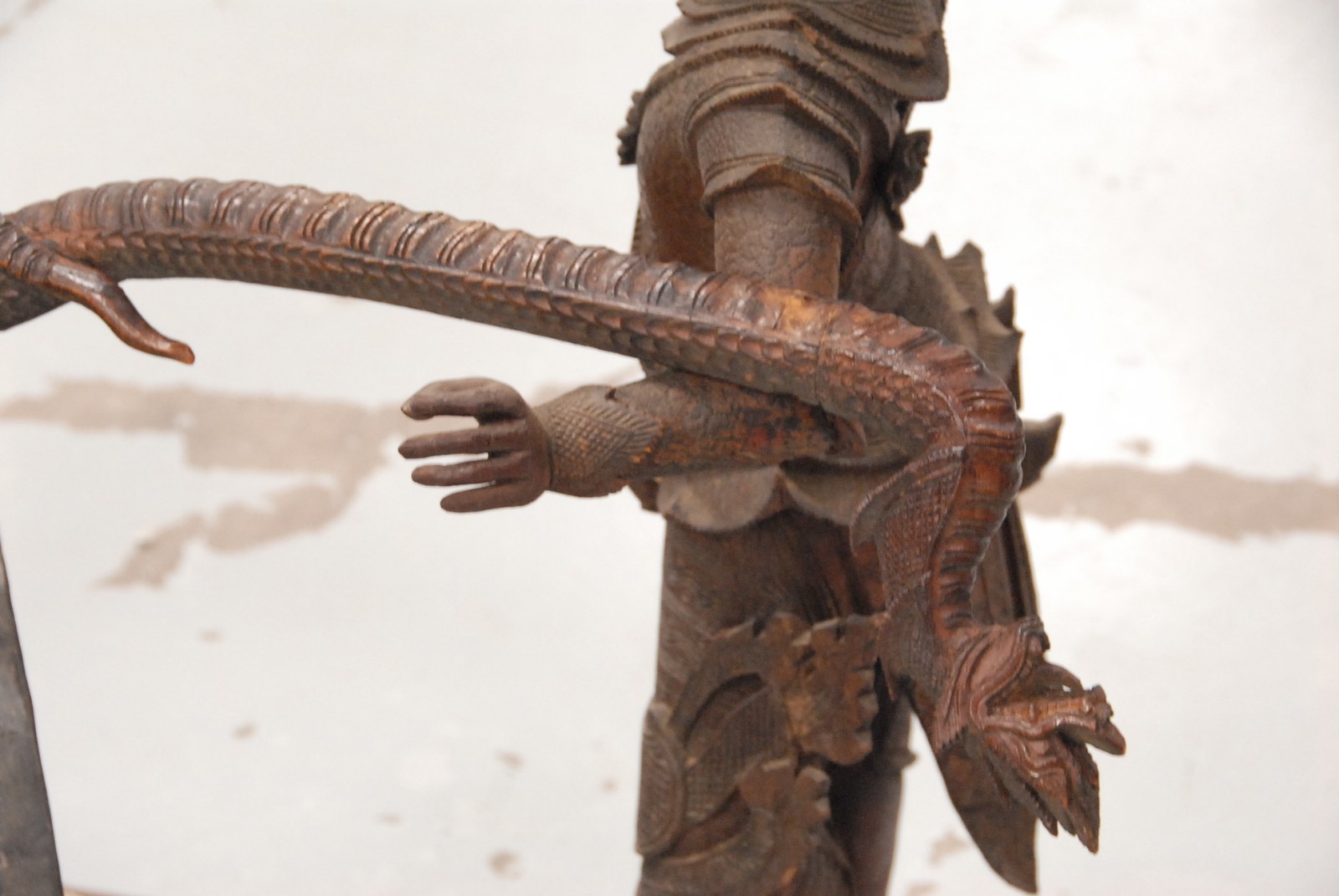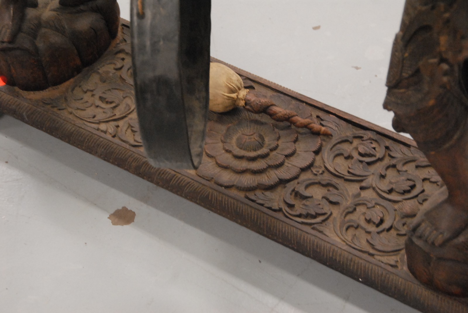Large Siamese Thai gong suspended from pair of intricately carved figures holding a dragon support bar ,small damage to robe flames, with a striker, 19th century – 20th century.