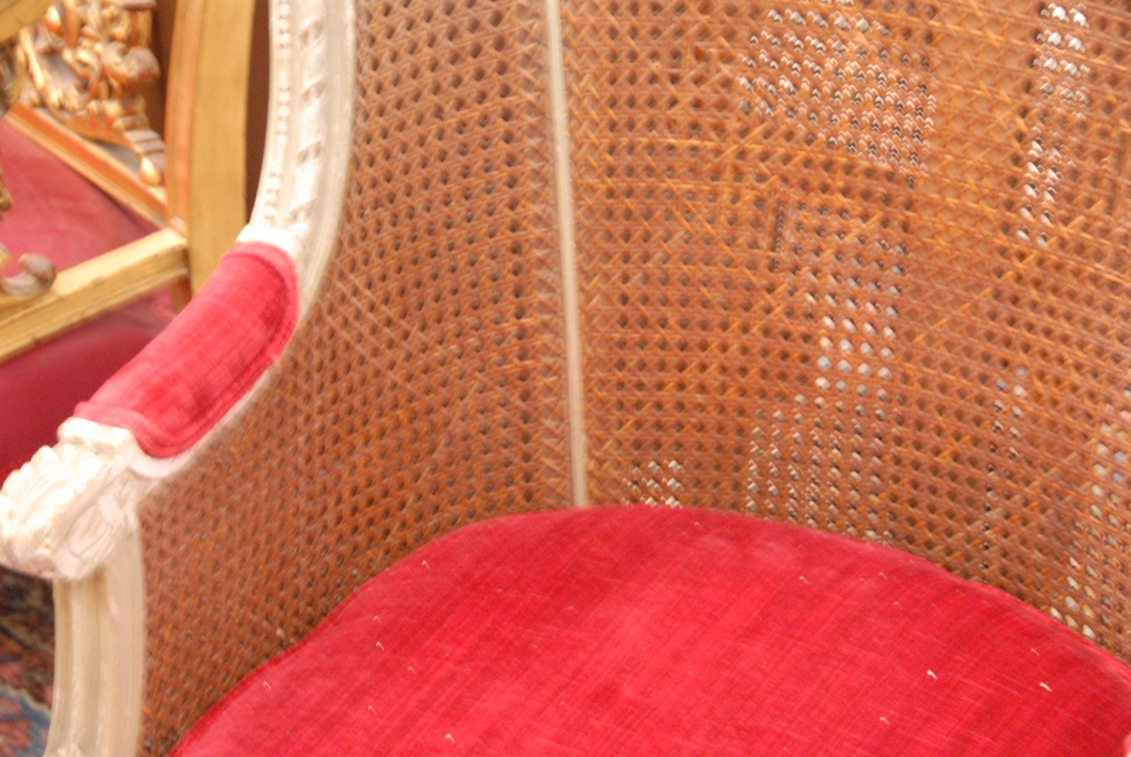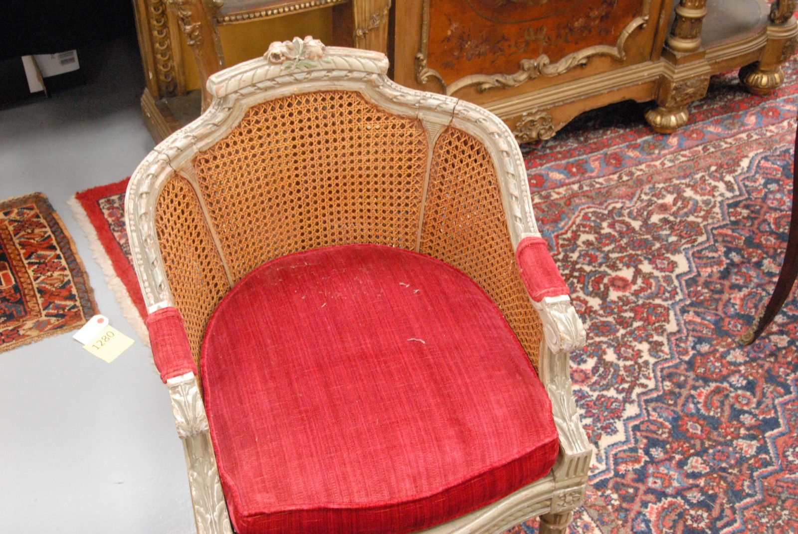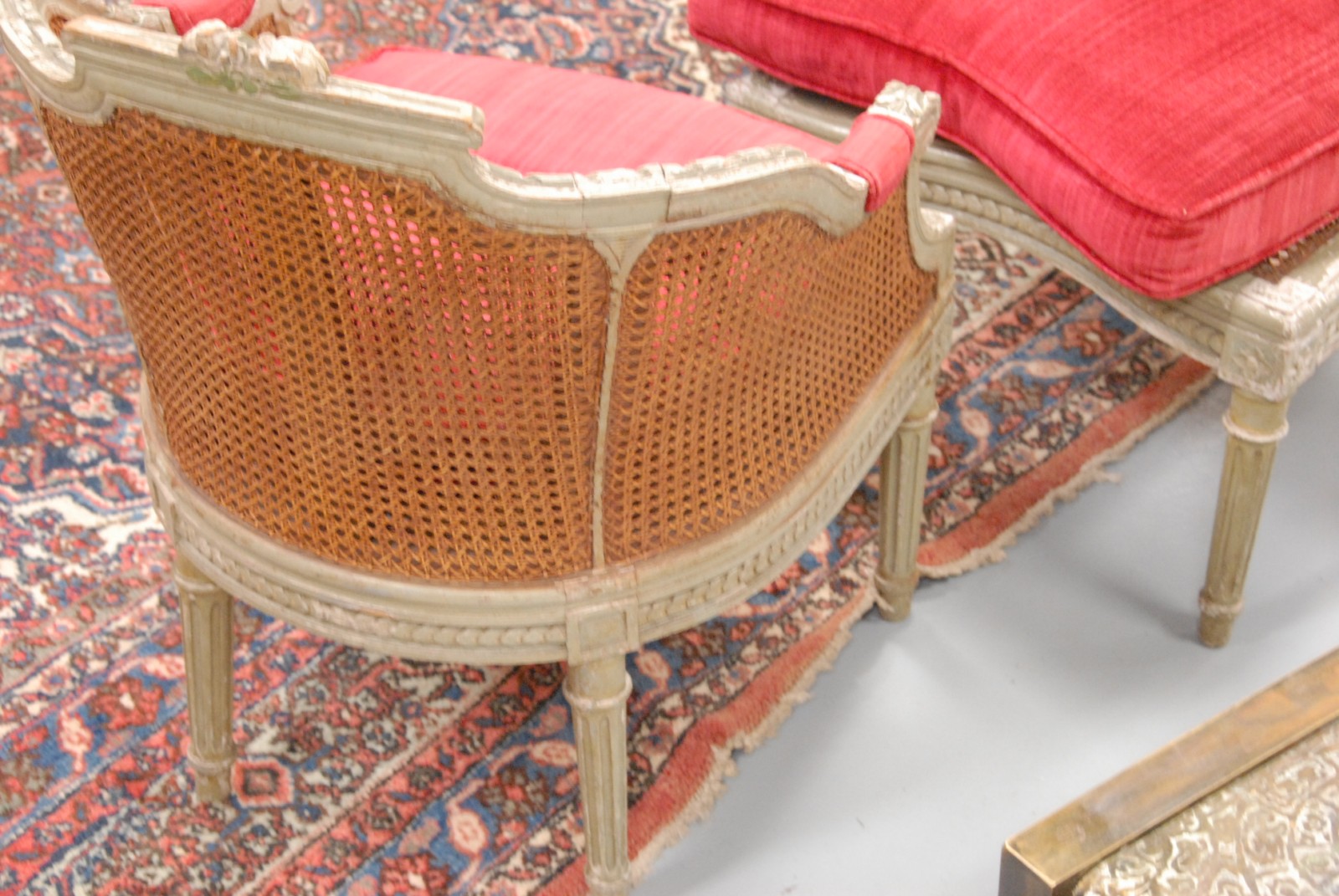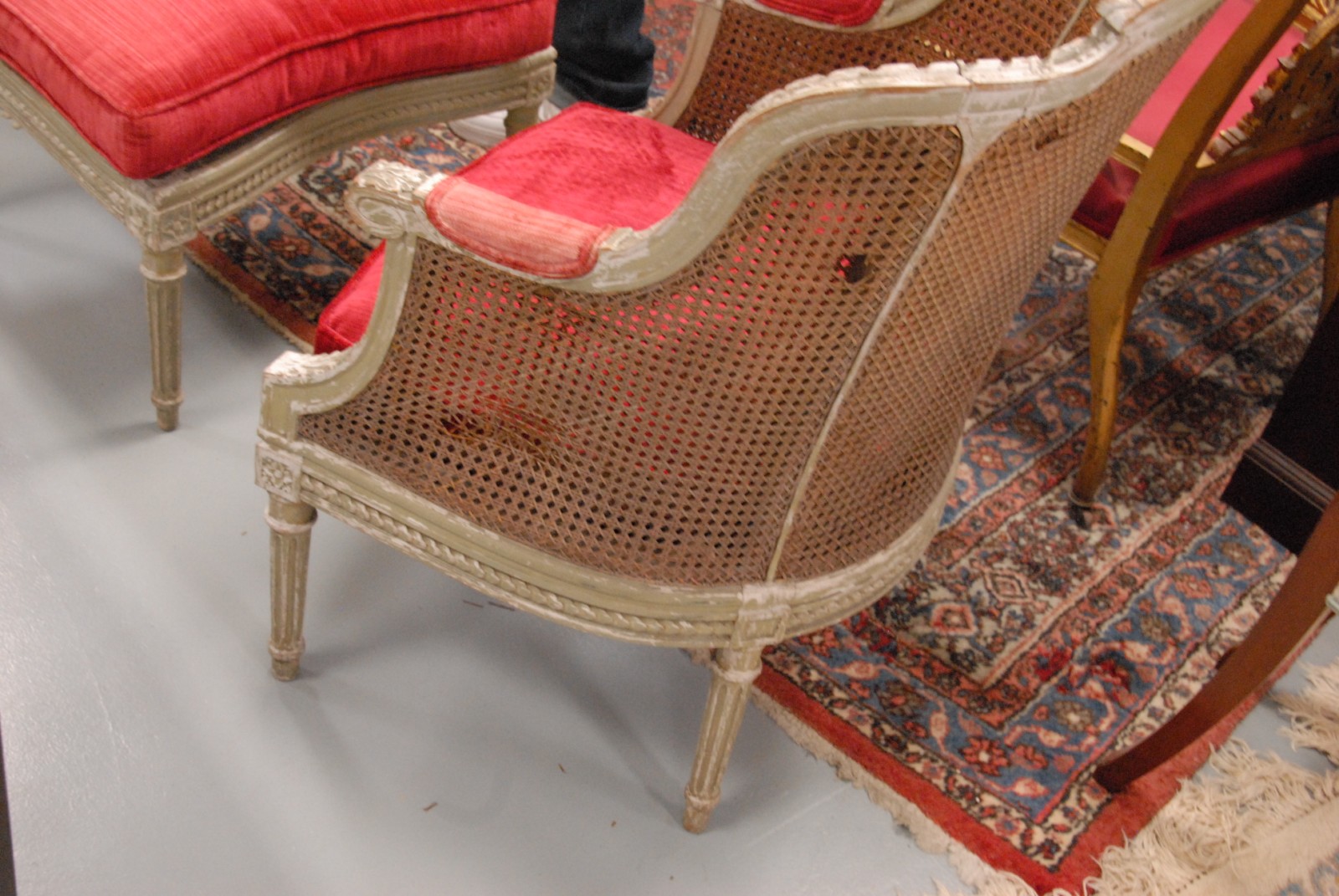 Louis XVI style three piece set to include cane back armchair, cane back ladies chair and matching footstool, caning on large chair has three holes in back.