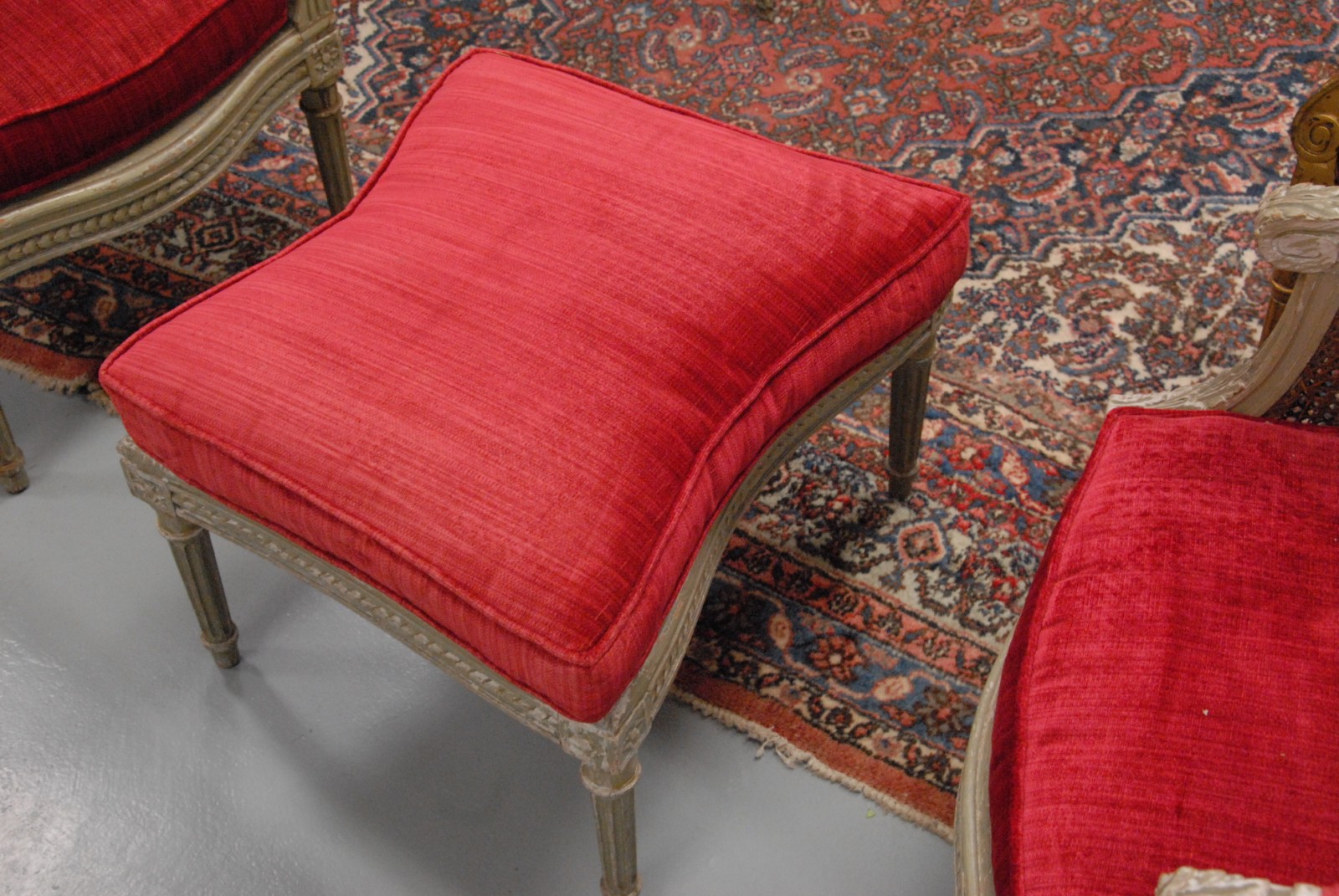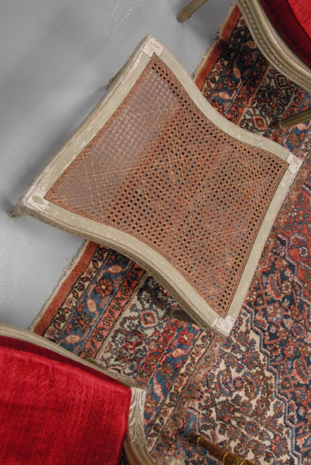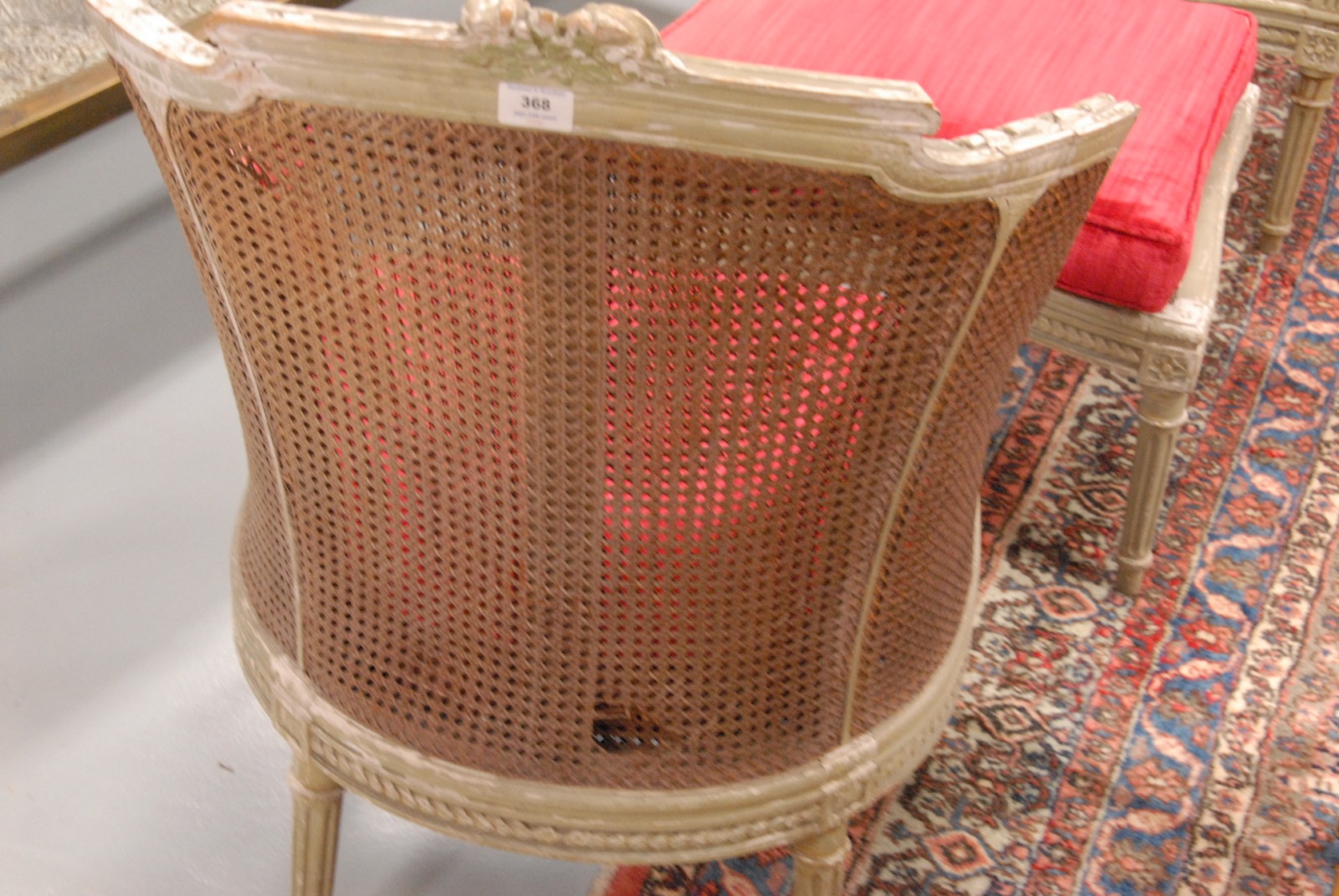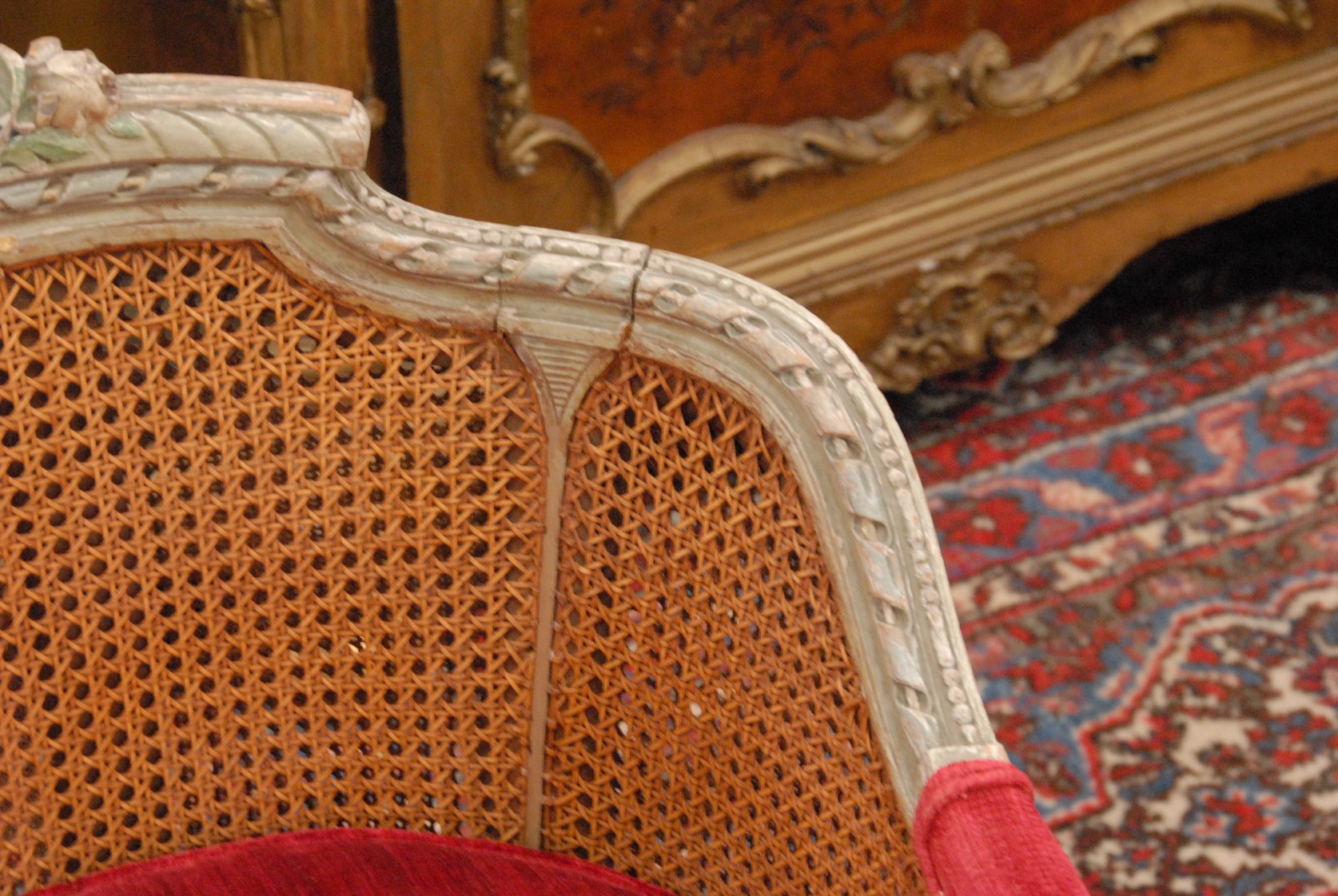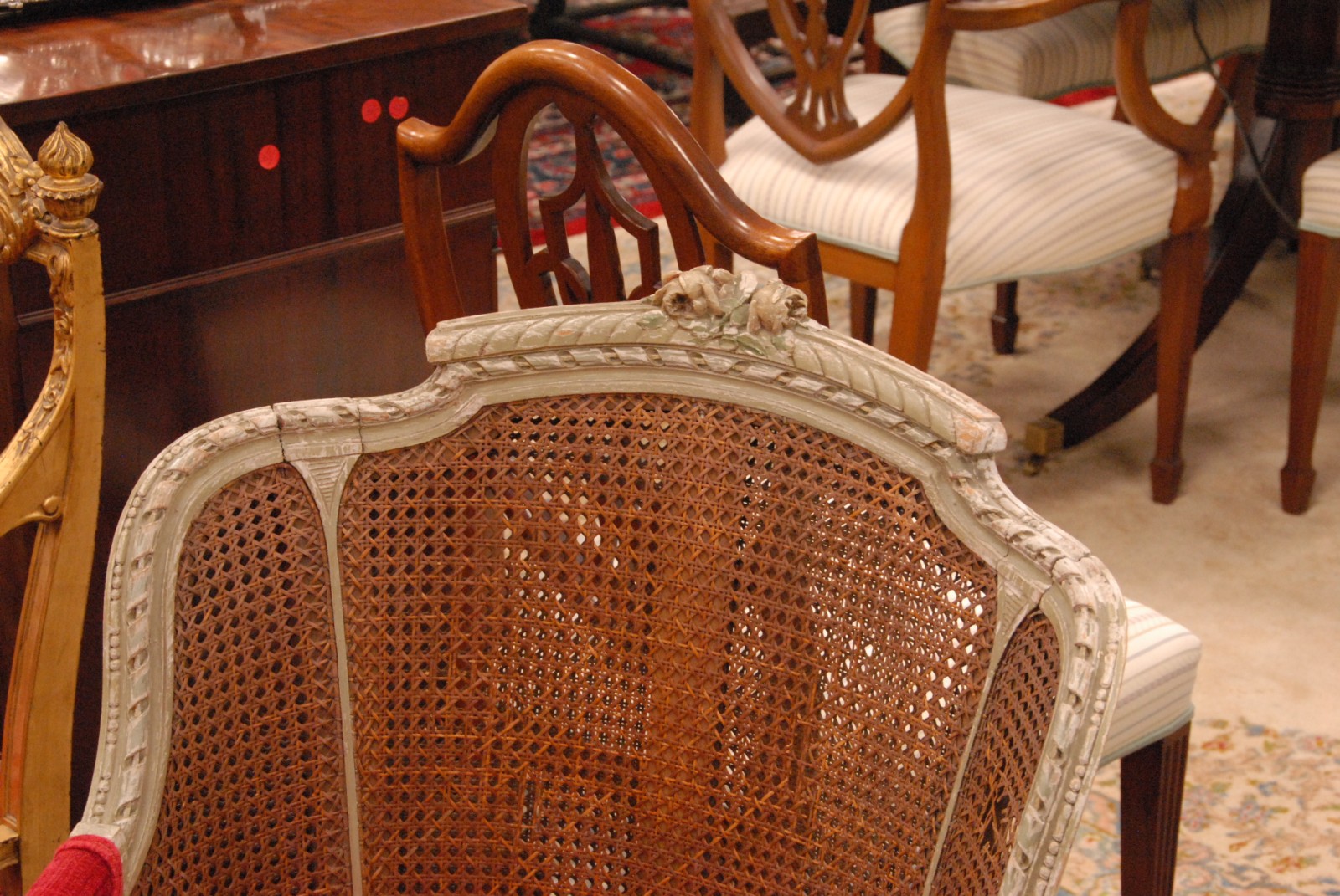 Louis XVI style three piece set to include cane back armchair, cane back ladies chair and matching footstool, caning on large chair has three holes in back.