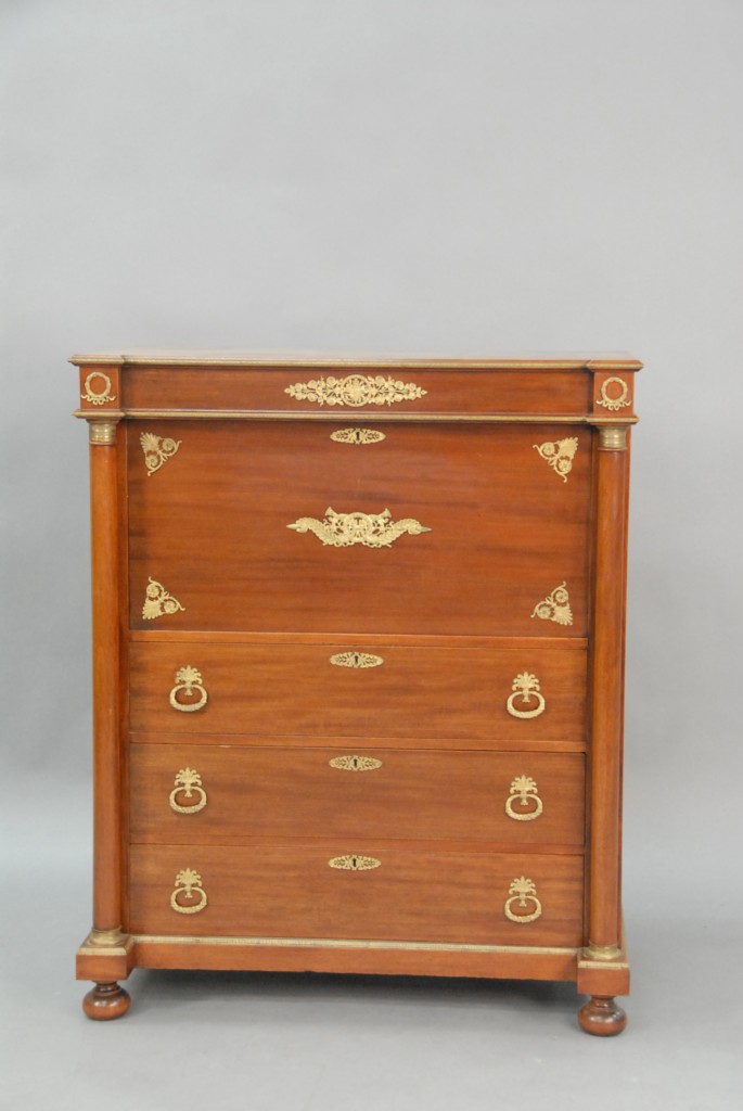 Mahogany Napoleonic style secretaire having drop front desk over three drawers set on suppressed ball feet and brass mounts, late 19th – early 20th century. height 50in. width 40in.