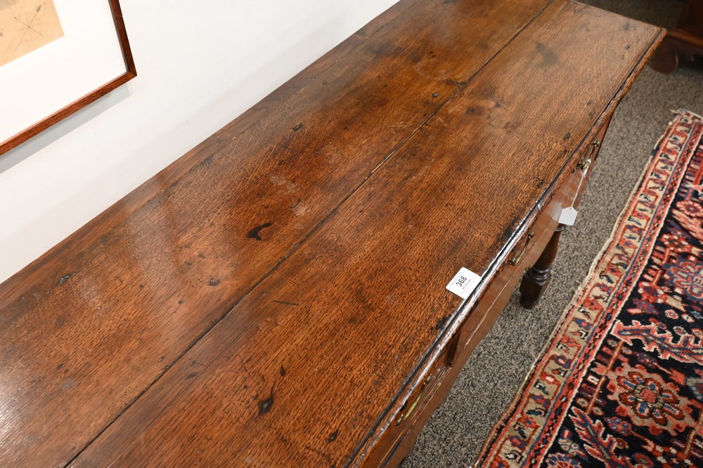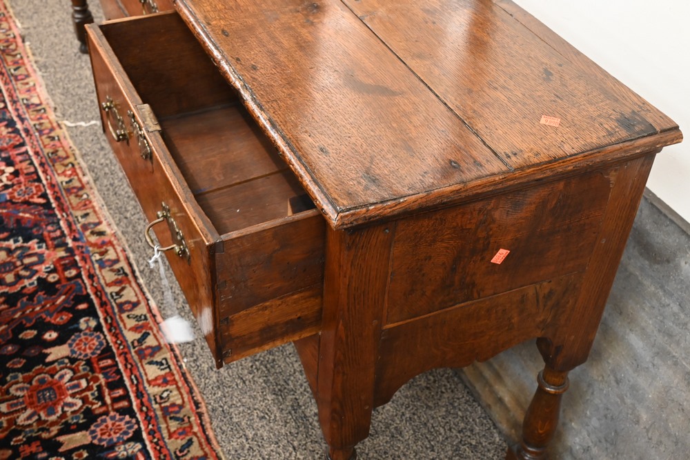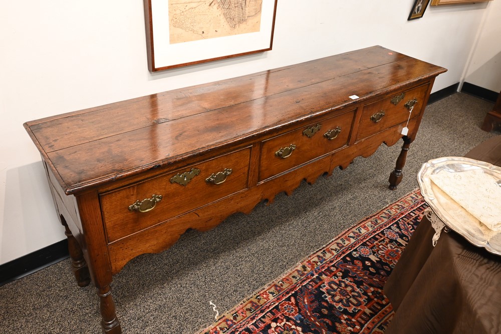 Lot 368: Oak Welsh Cupboard Base having three drawers height 29 1/2 inches, top 17 x 72 1/2 inches