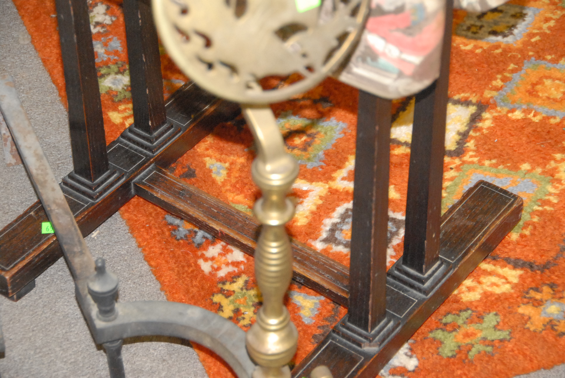 Pair of andirons and inlaid drop leaf table.