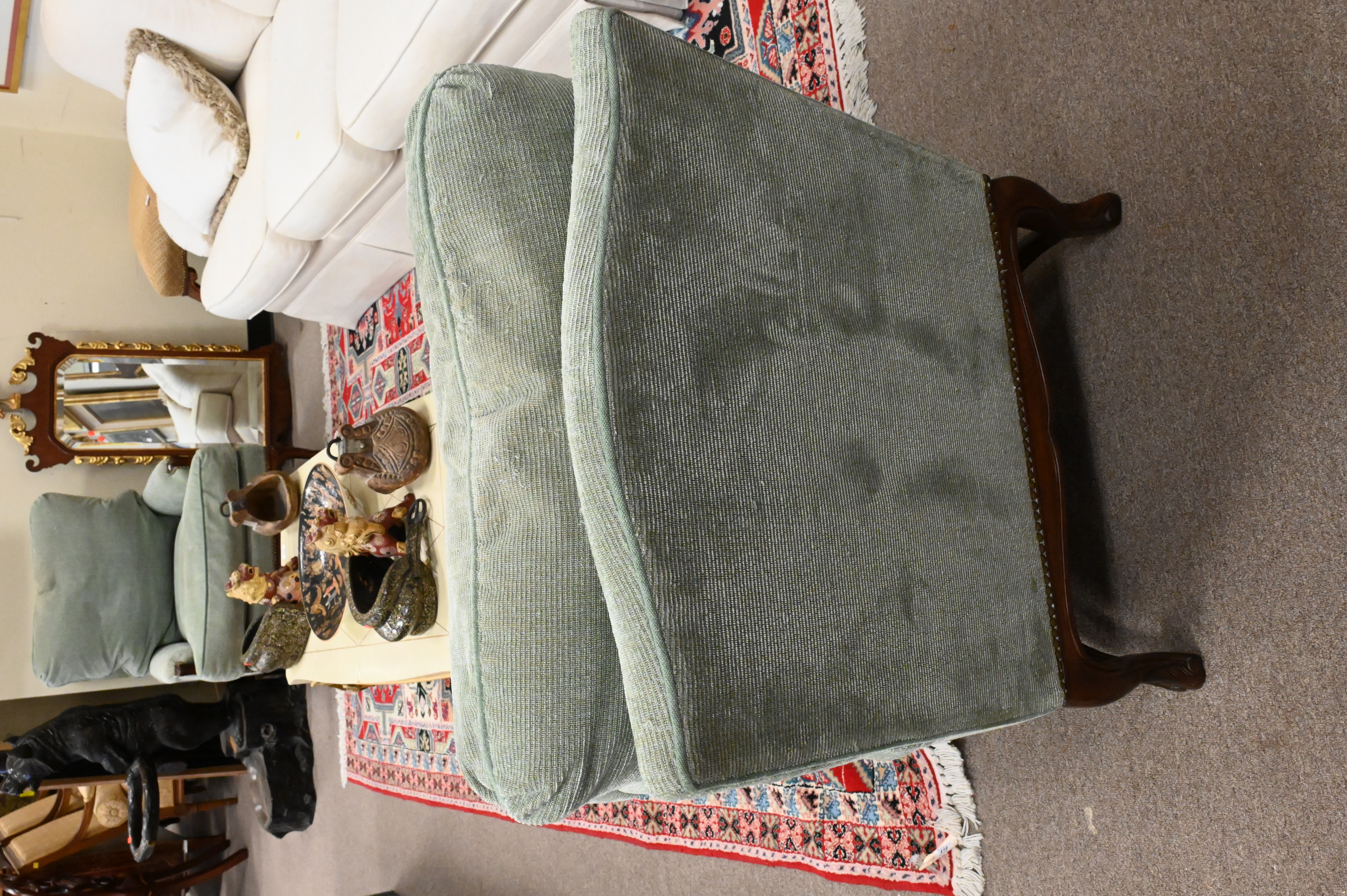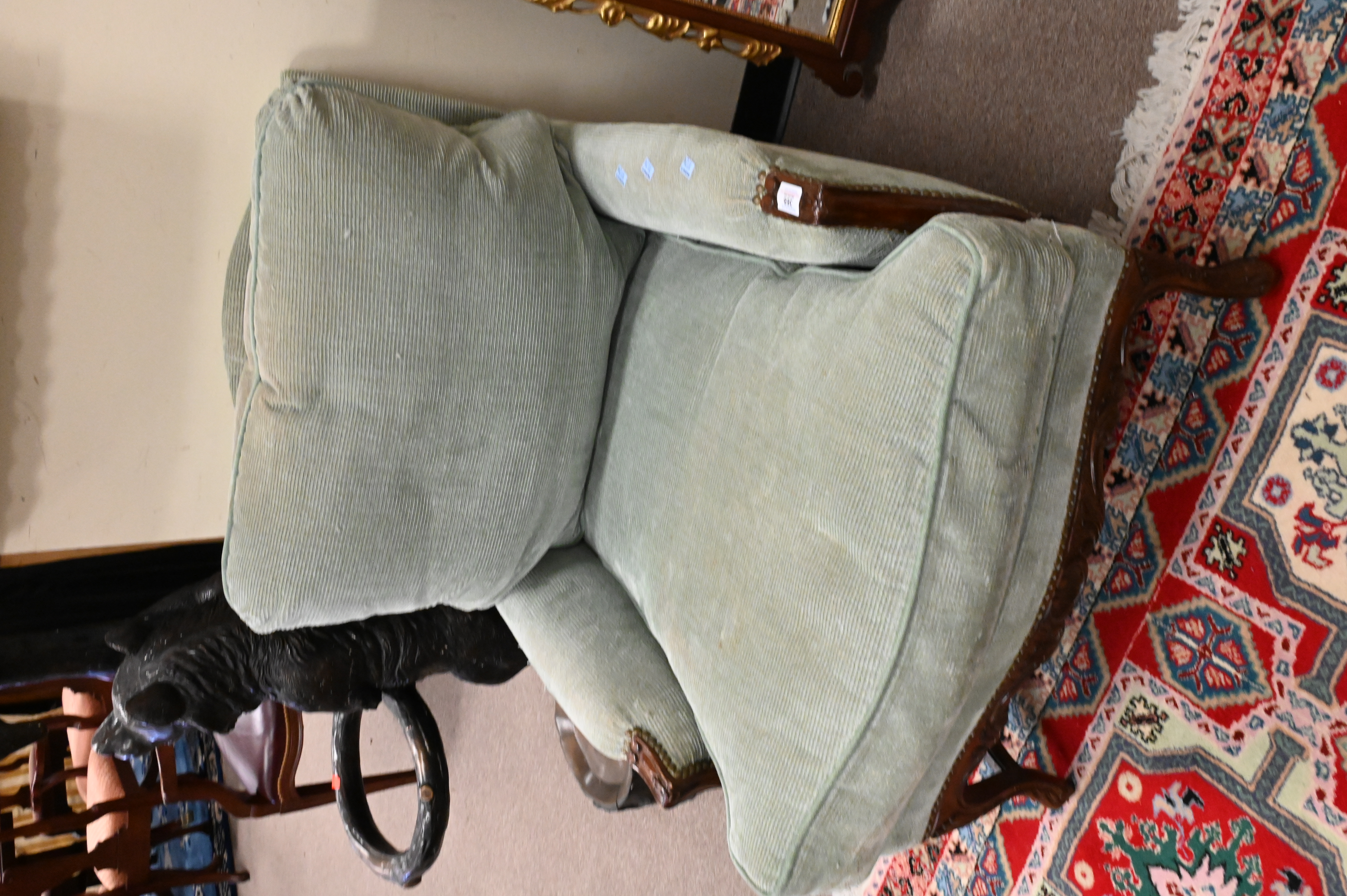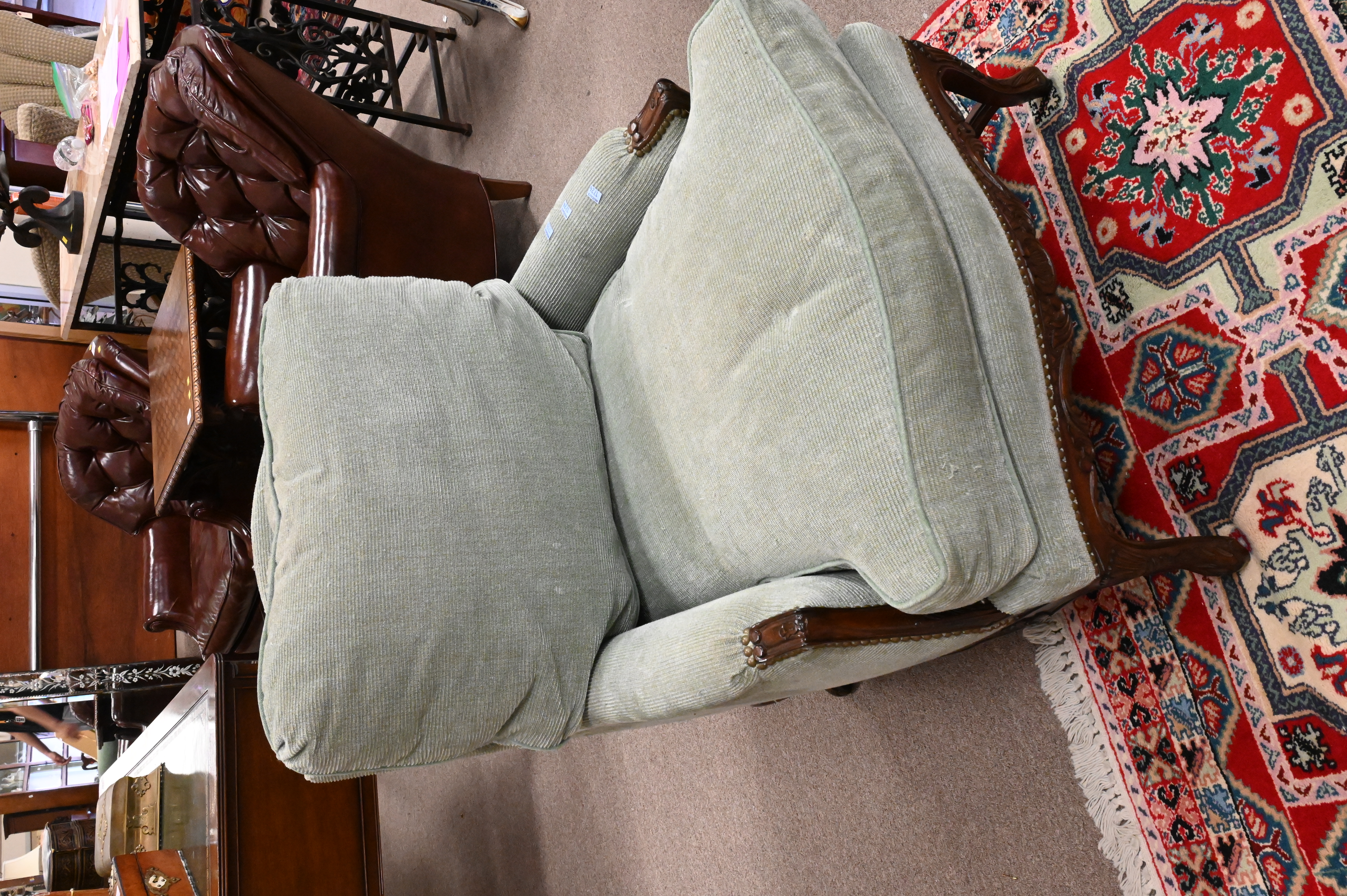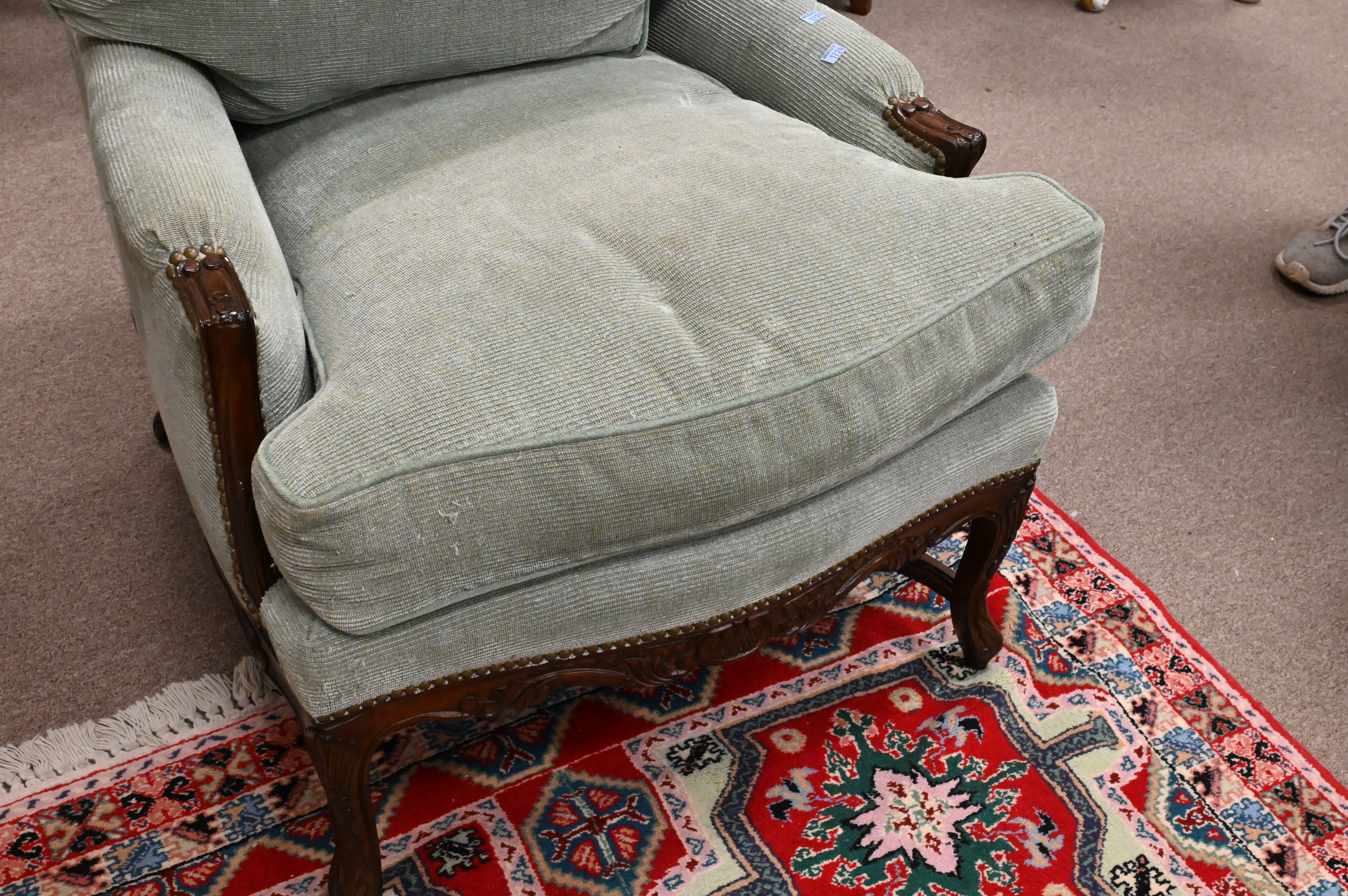 Pair of Louis Mittman French Style Arm Chairs, with custom upholstery, height 34 inches, height 29 inches.