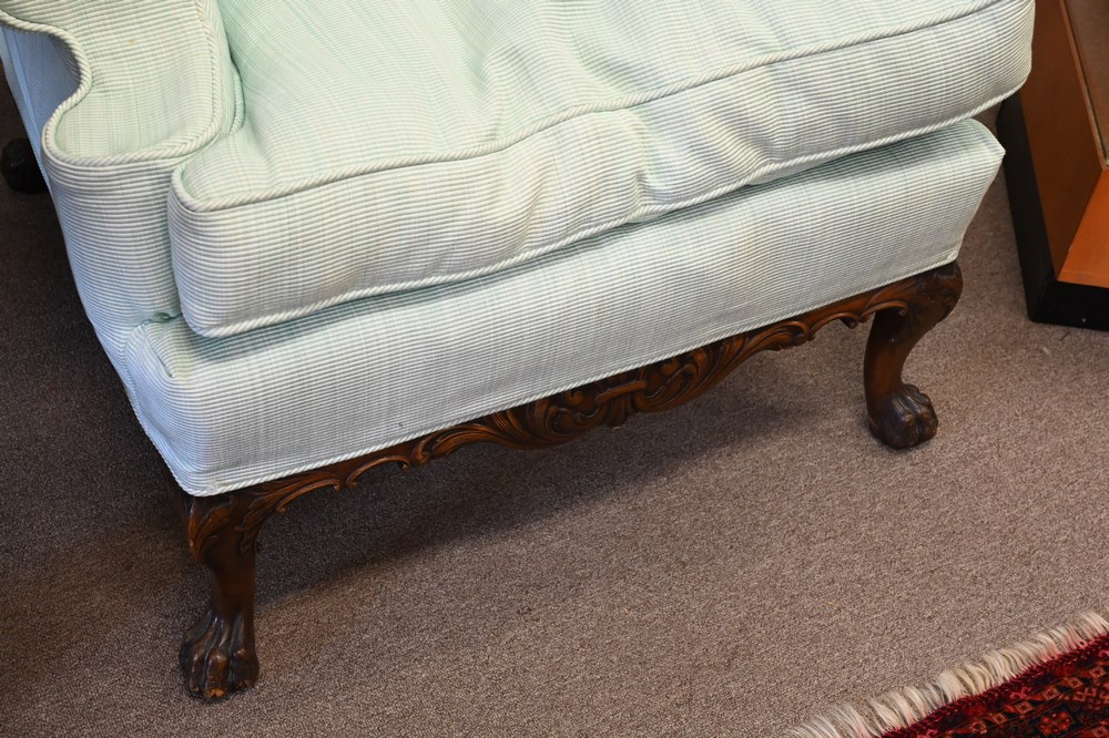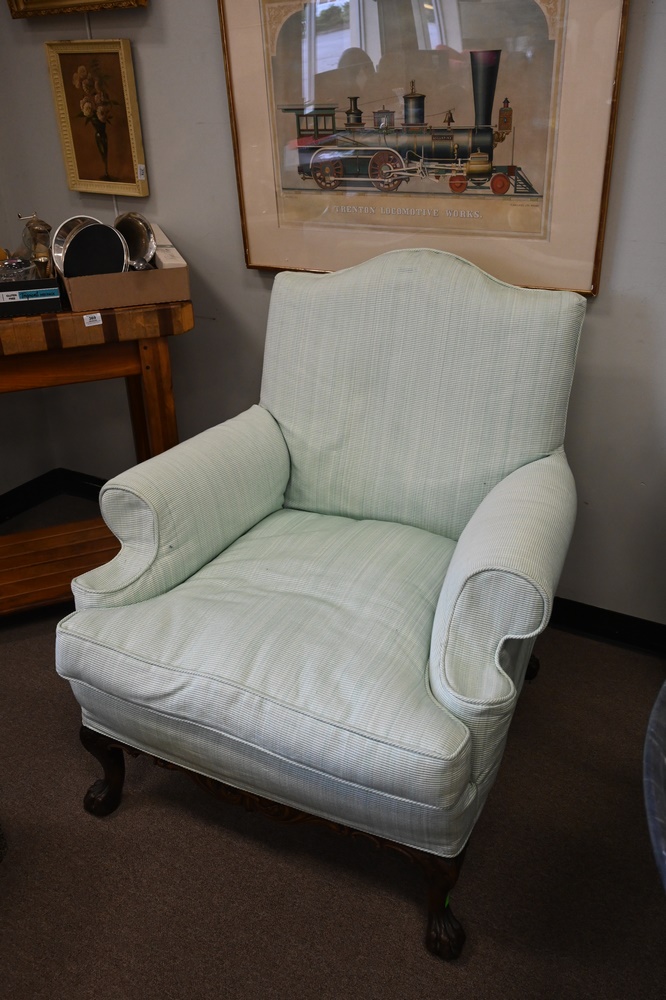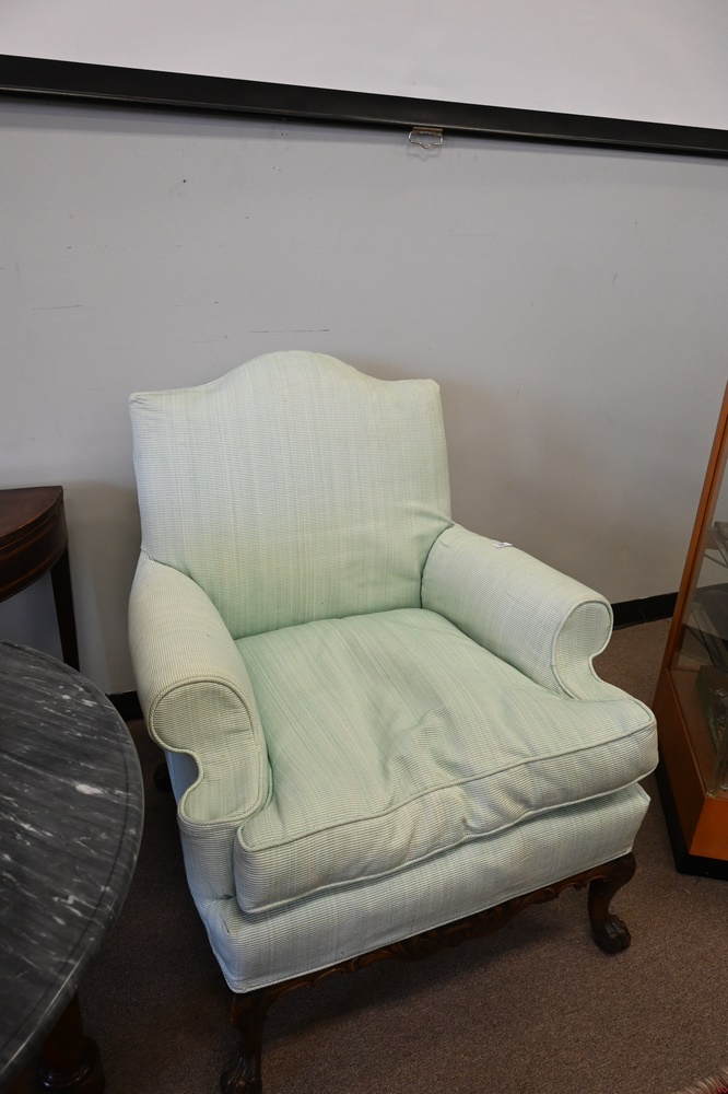 Lot 368: Pair of Mahogany Armchairs, having custom slipcovers, set on paw feet, like new, height 39 inches, width 35 inches.