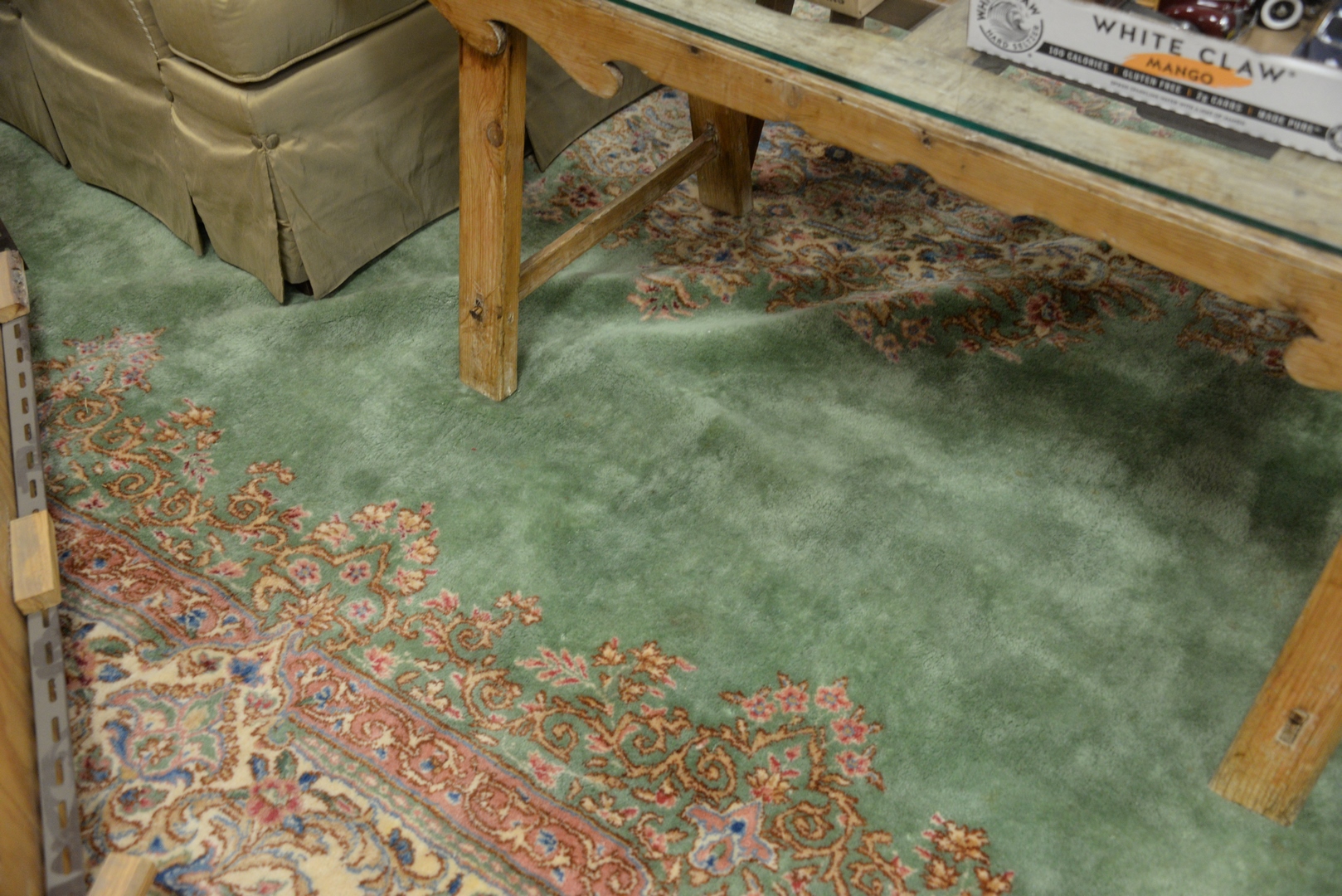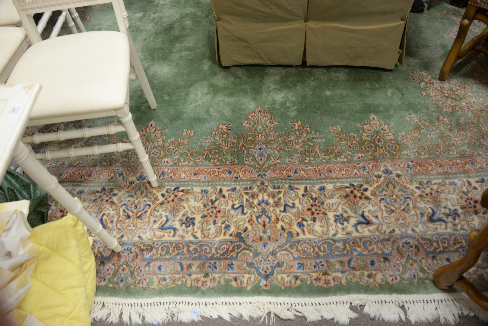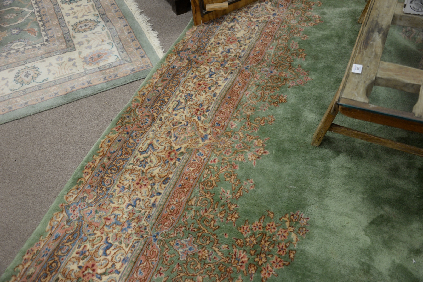 Room Size Kirman Oriental Carpet, green ground, 10′ 10″ x 15′ 4″.