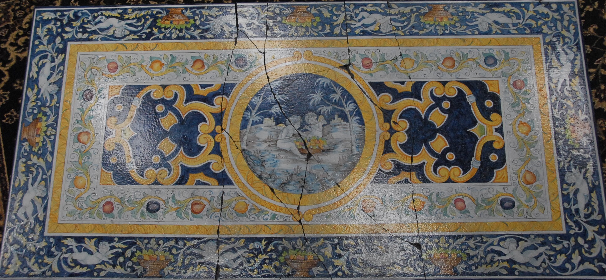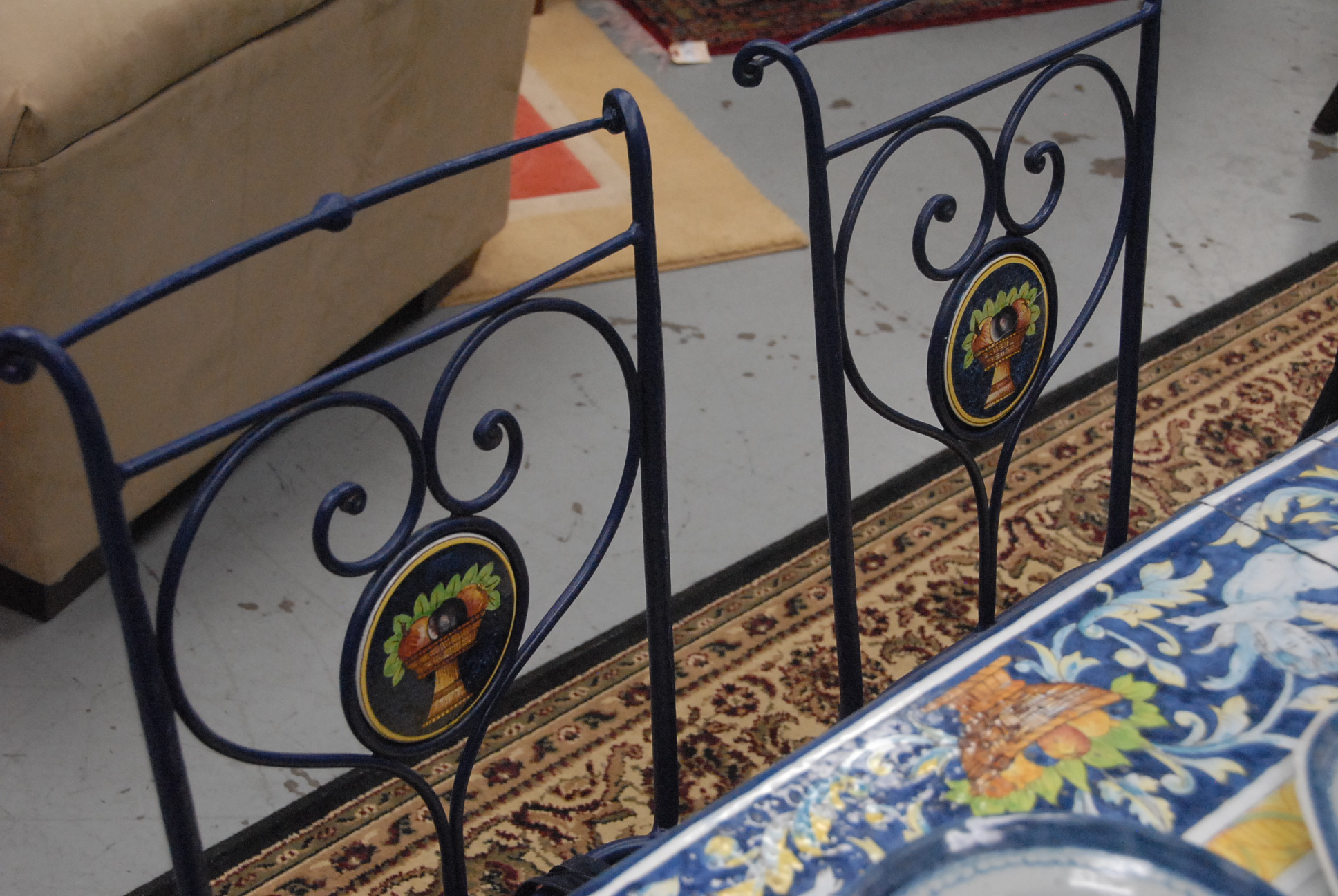 Seven piece patio set having six iron chairs with custom cushions and majolica style medallions along with iron base table with majolica hand painted top top as is – in need of repair.