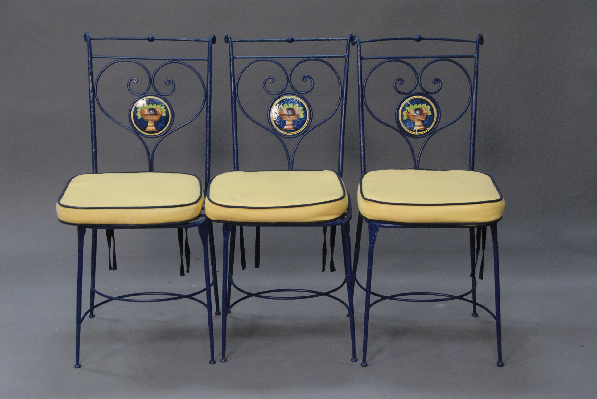 Lot 368: Seven piece patio set having six iron chairs with custom cushions and majolica style medallions along with iron base table with majo…