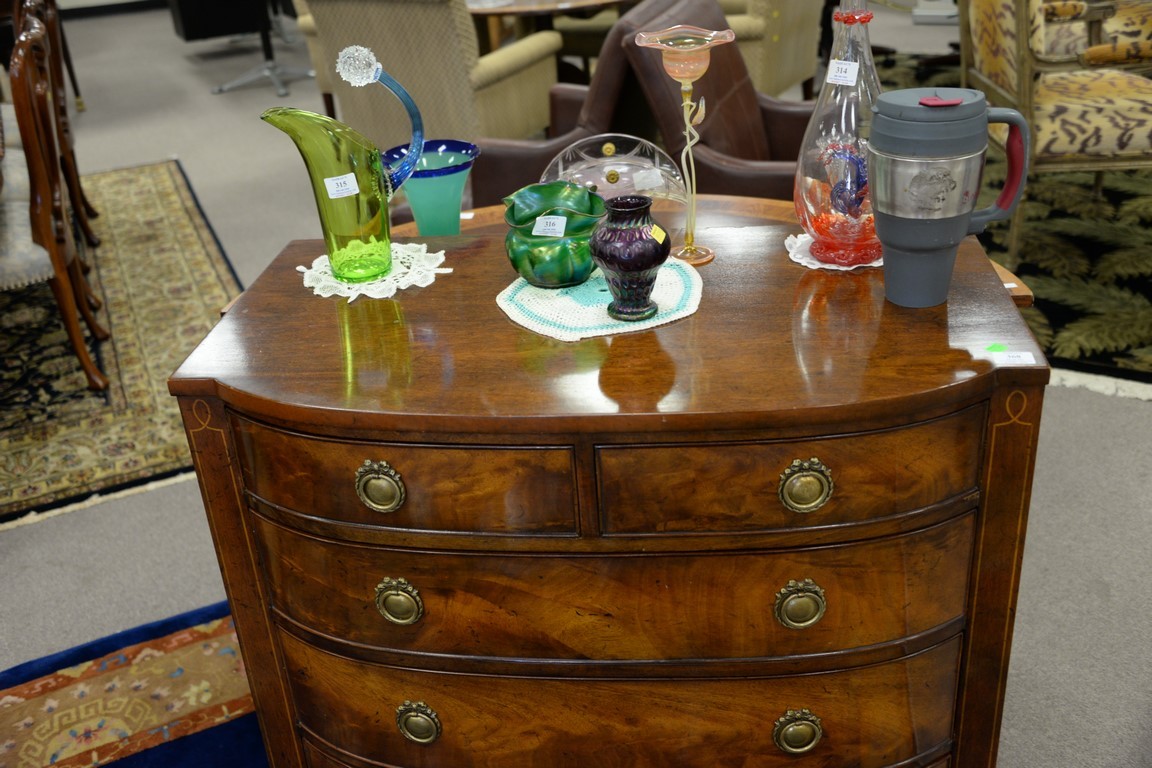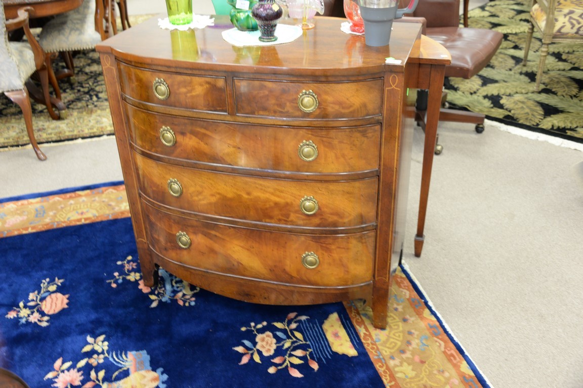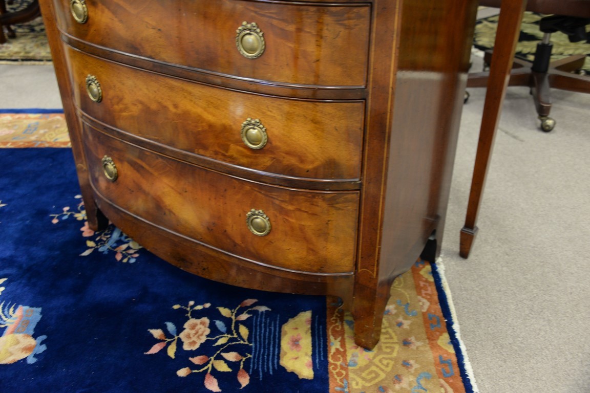 Lot 368: Signed mahogany bow front chest with burlwood front, signed Sahon Traditional Furniture, N.Y.. ht. 36in., wd. 36in., dp. 20 1/2in.