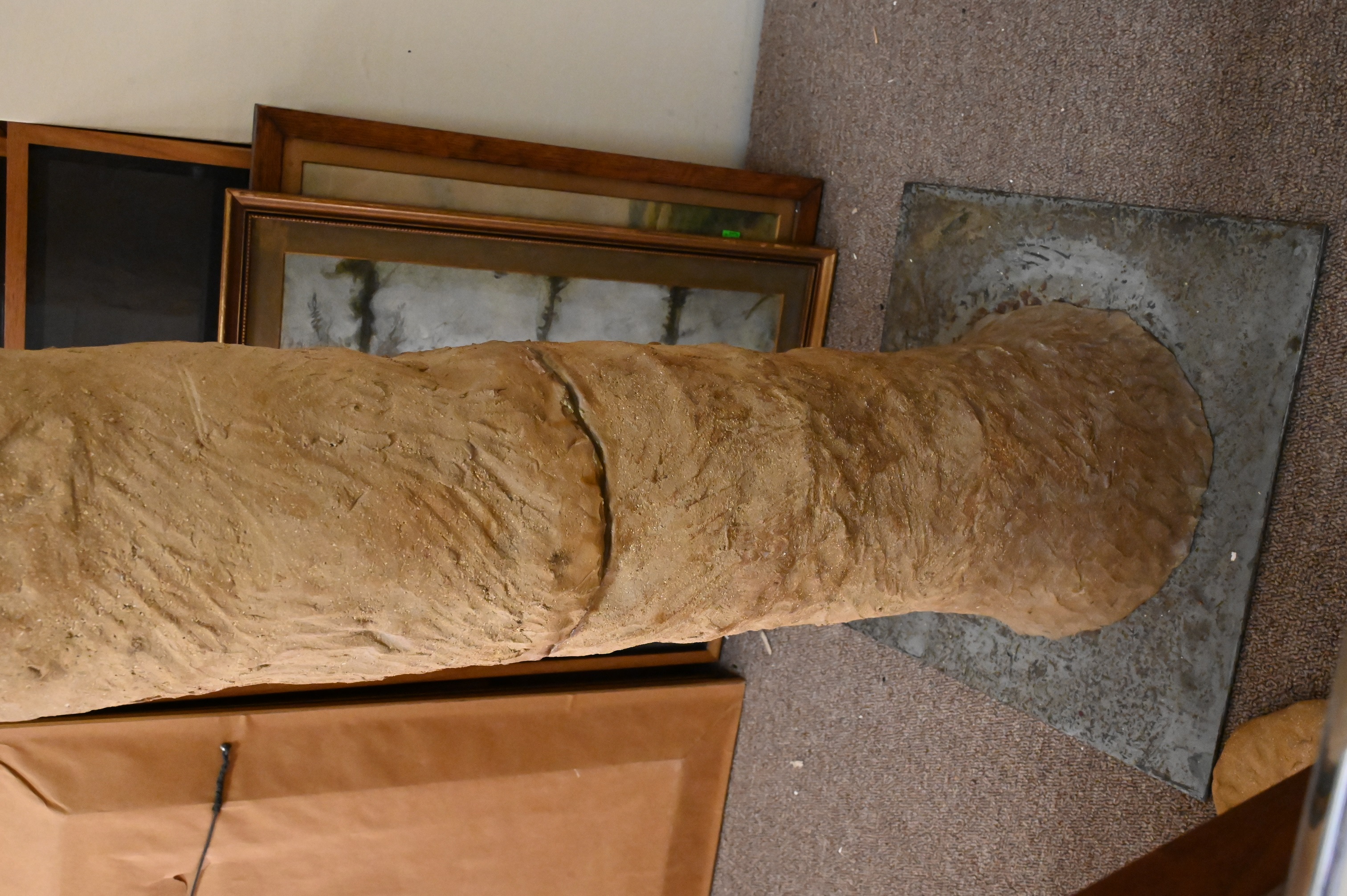 Having globular vase in center with leaf forms attached by twine all over tree trunk base