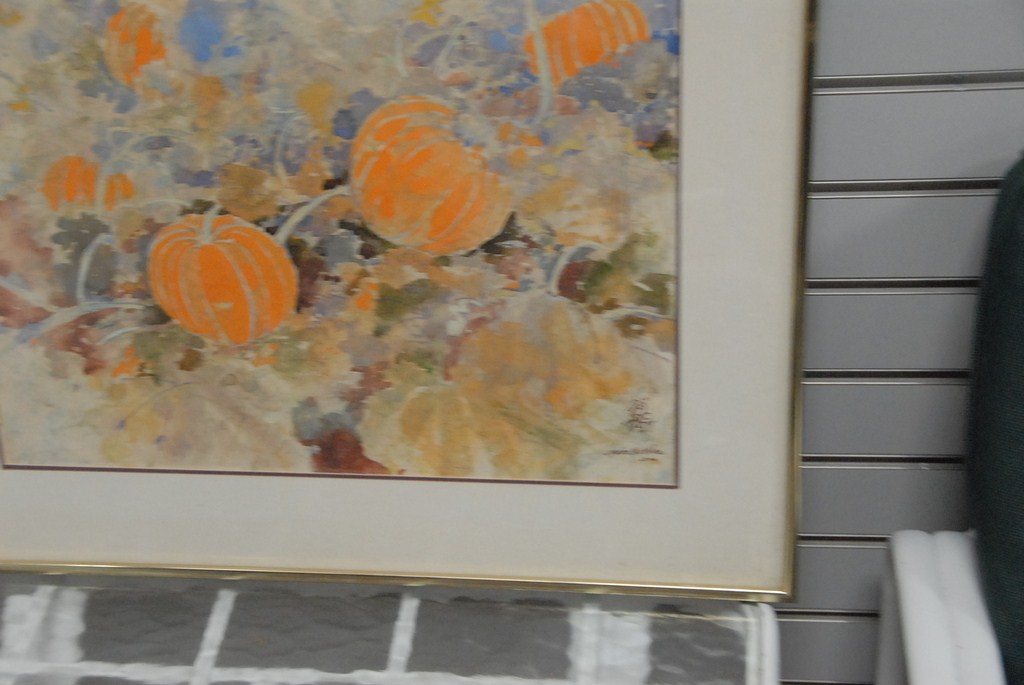 Lot 368: Two framed pieces oil on canvas of girl signed indistinctly lower right and watercolor of pumpkin signed lower right.