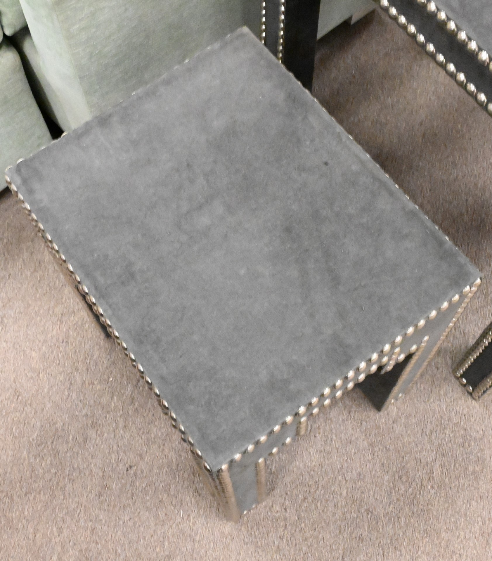 having dark grey upholstery and nailhead accents