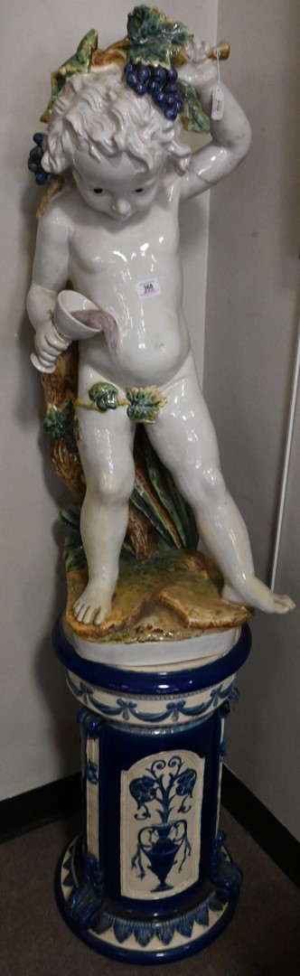 Two Piece Lot, to include a Majolica putti with grapes on Wedgwood pedestal, figure marked Zaccagnini Firenze,