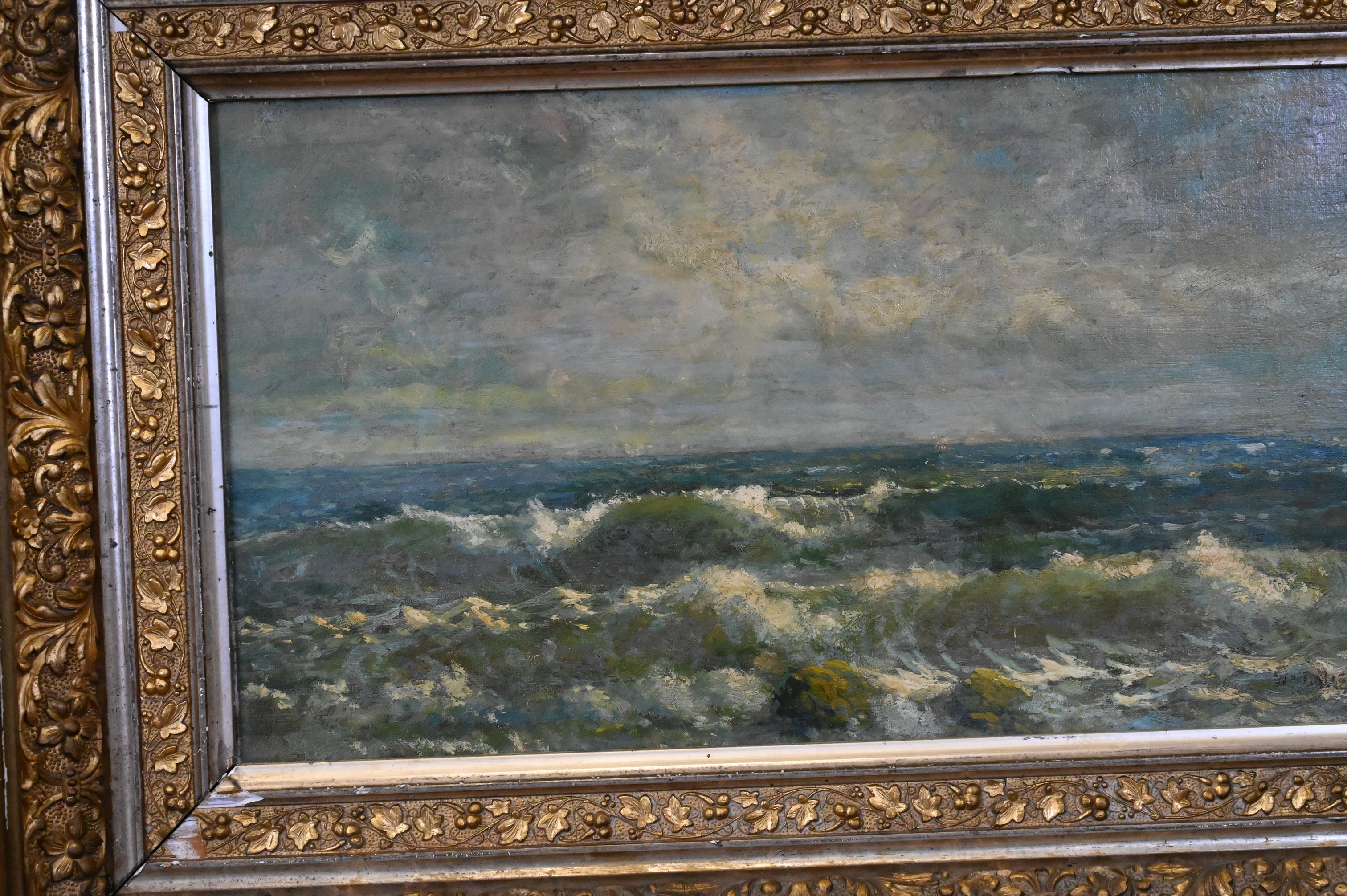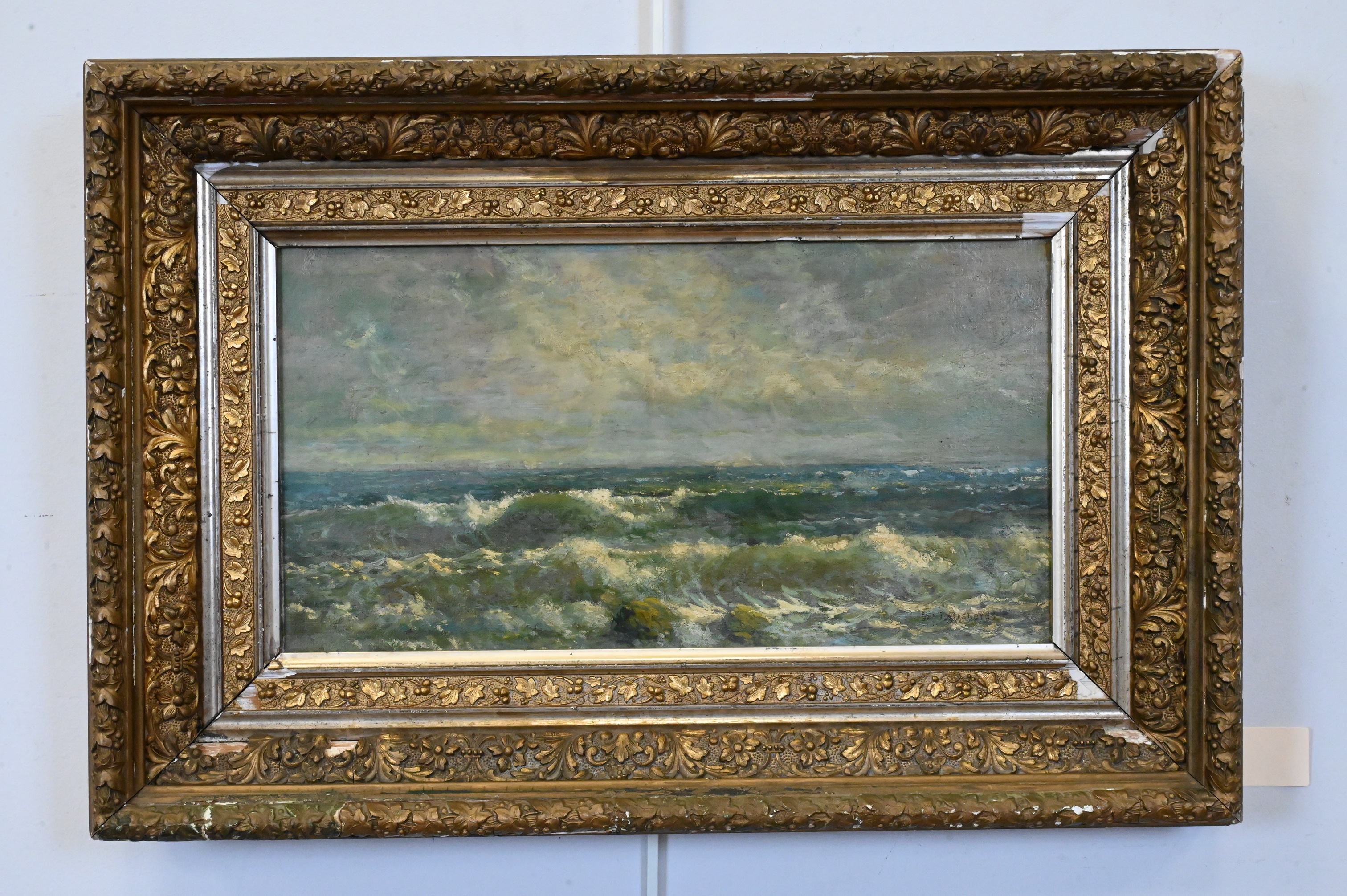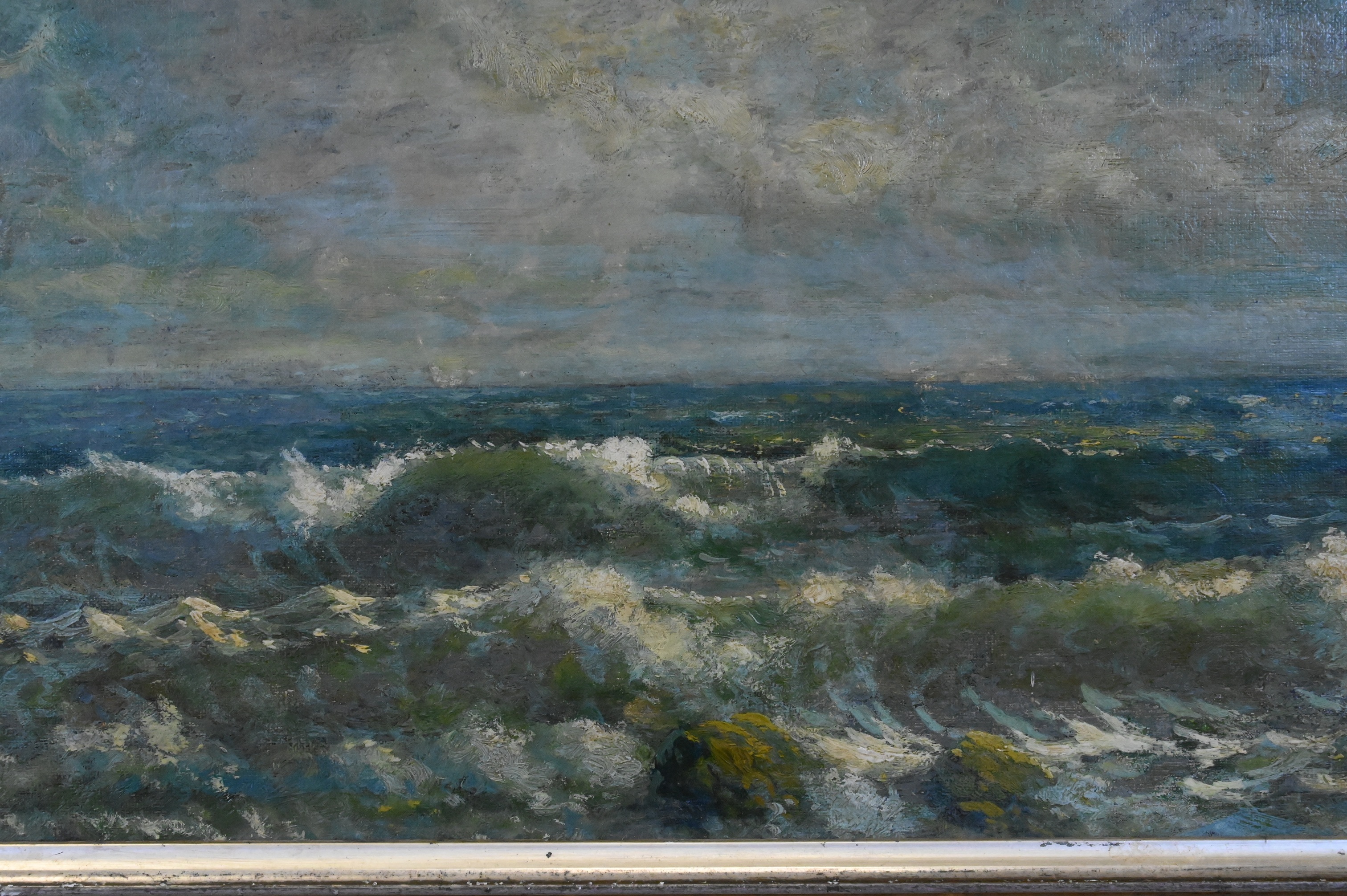 Atmospheric seascape study rendered with layered, textural strokes in soft greens, blues, and pale ochres, the composition divided by a central band of surf meeting calm water, capturing Richards’ characteristic sensitivity to light, motion, and natural detail.