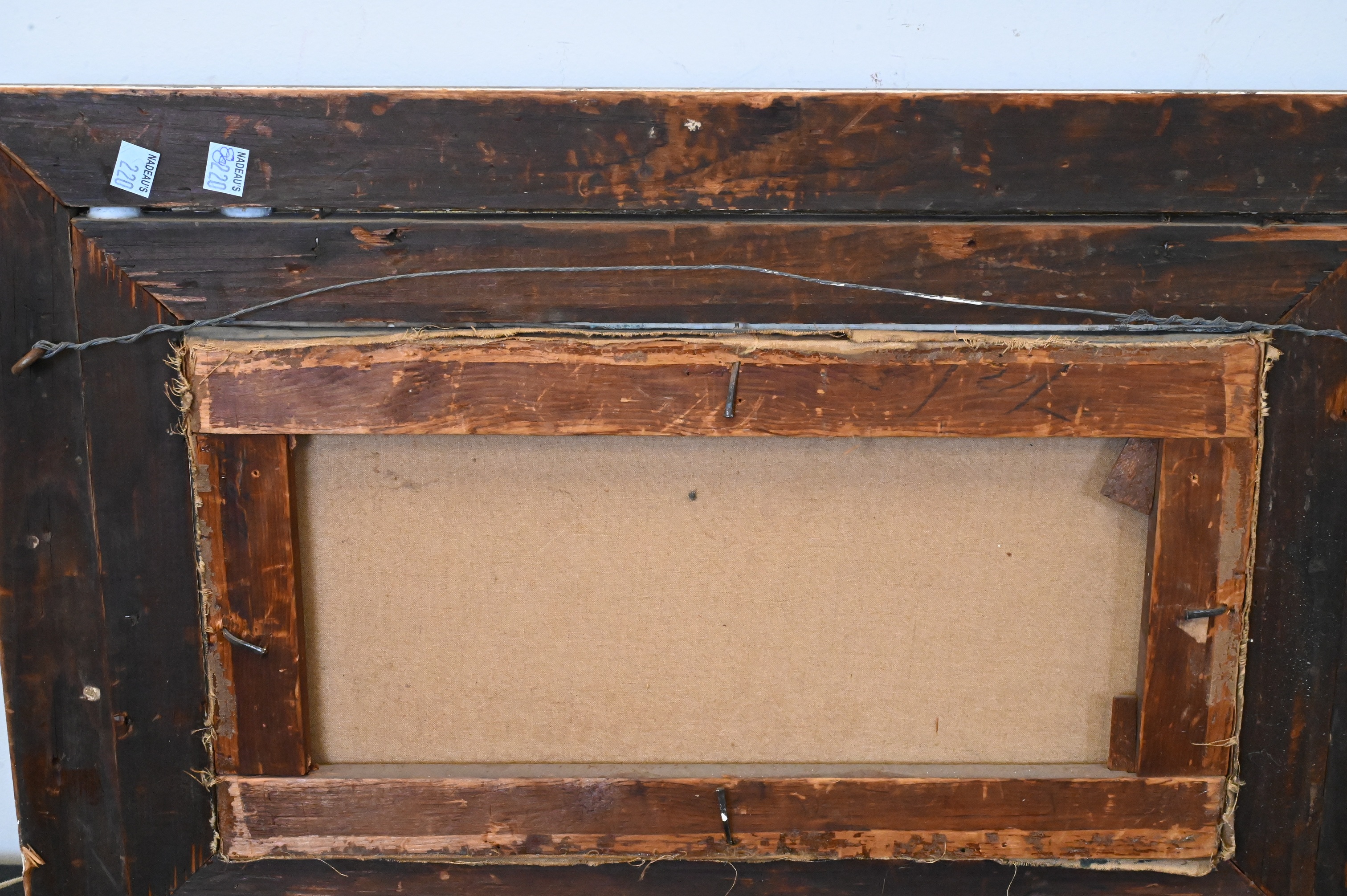 Relined and retretched canvas. craquelure, heavy surface grime, loss to frame. Inpainting visible under UV light, including sky, left foreground, borders. Scuffing and edgeware