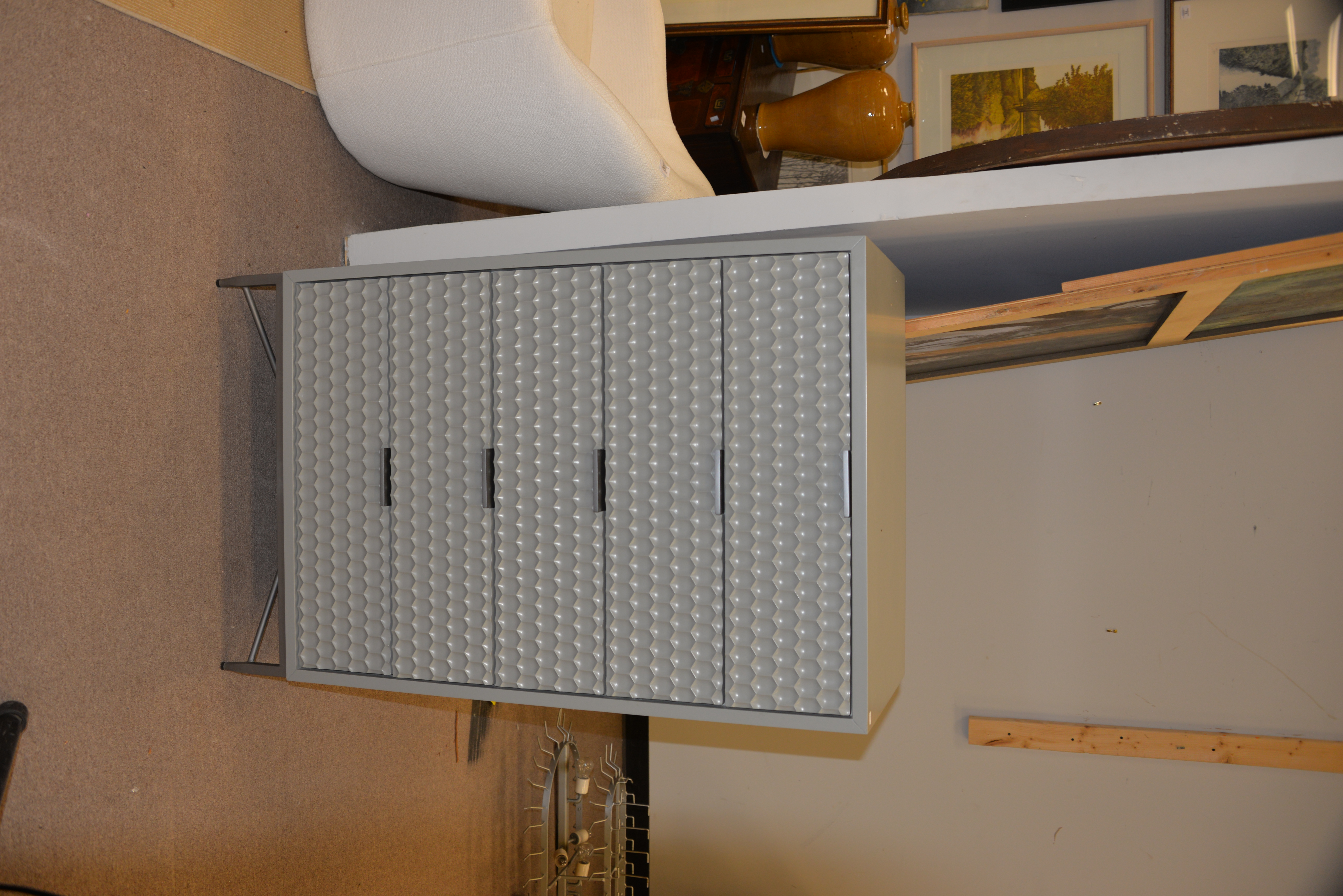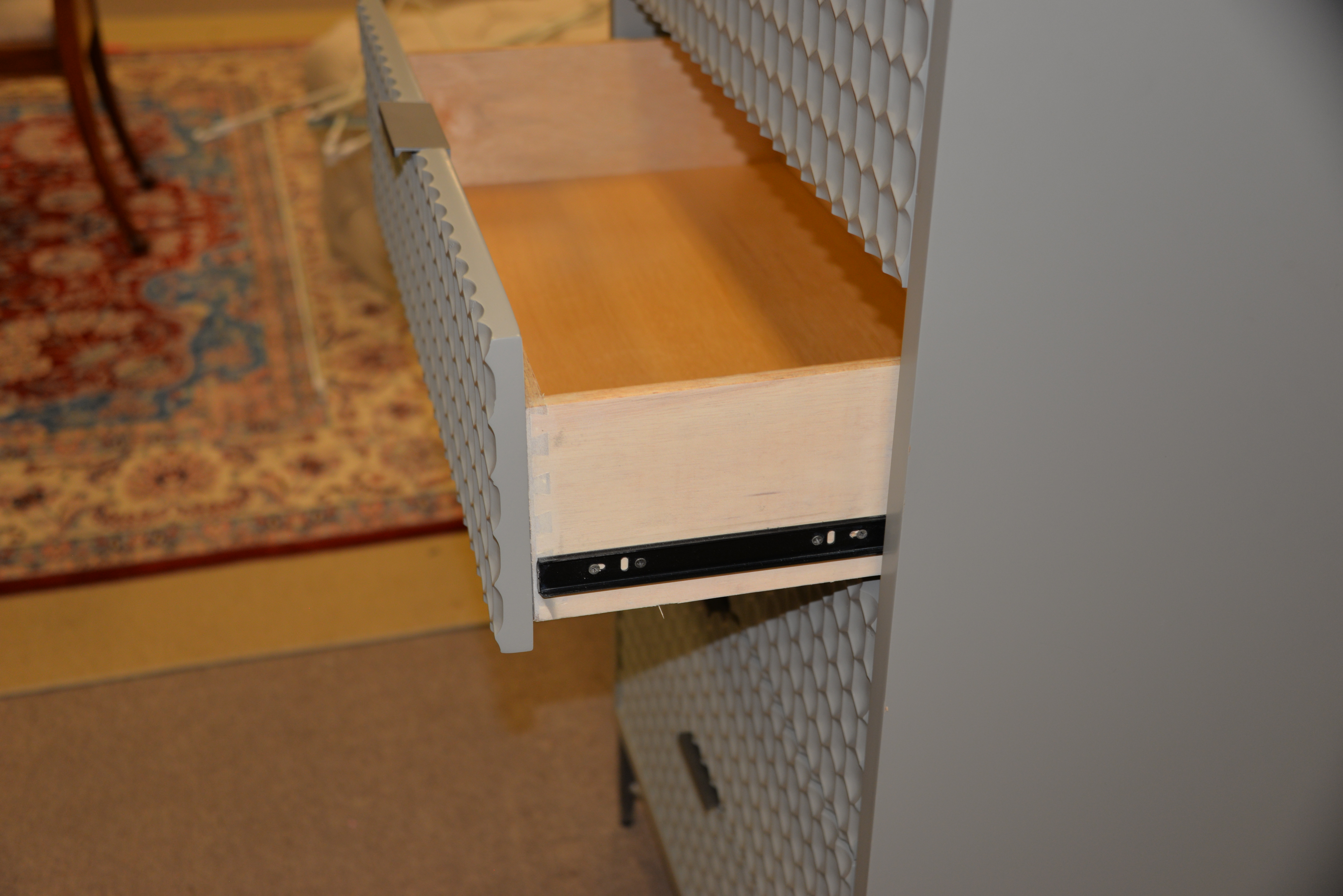 to include chest in grey having honey comb front, custom upholstered king size headboard, and one round mirror
