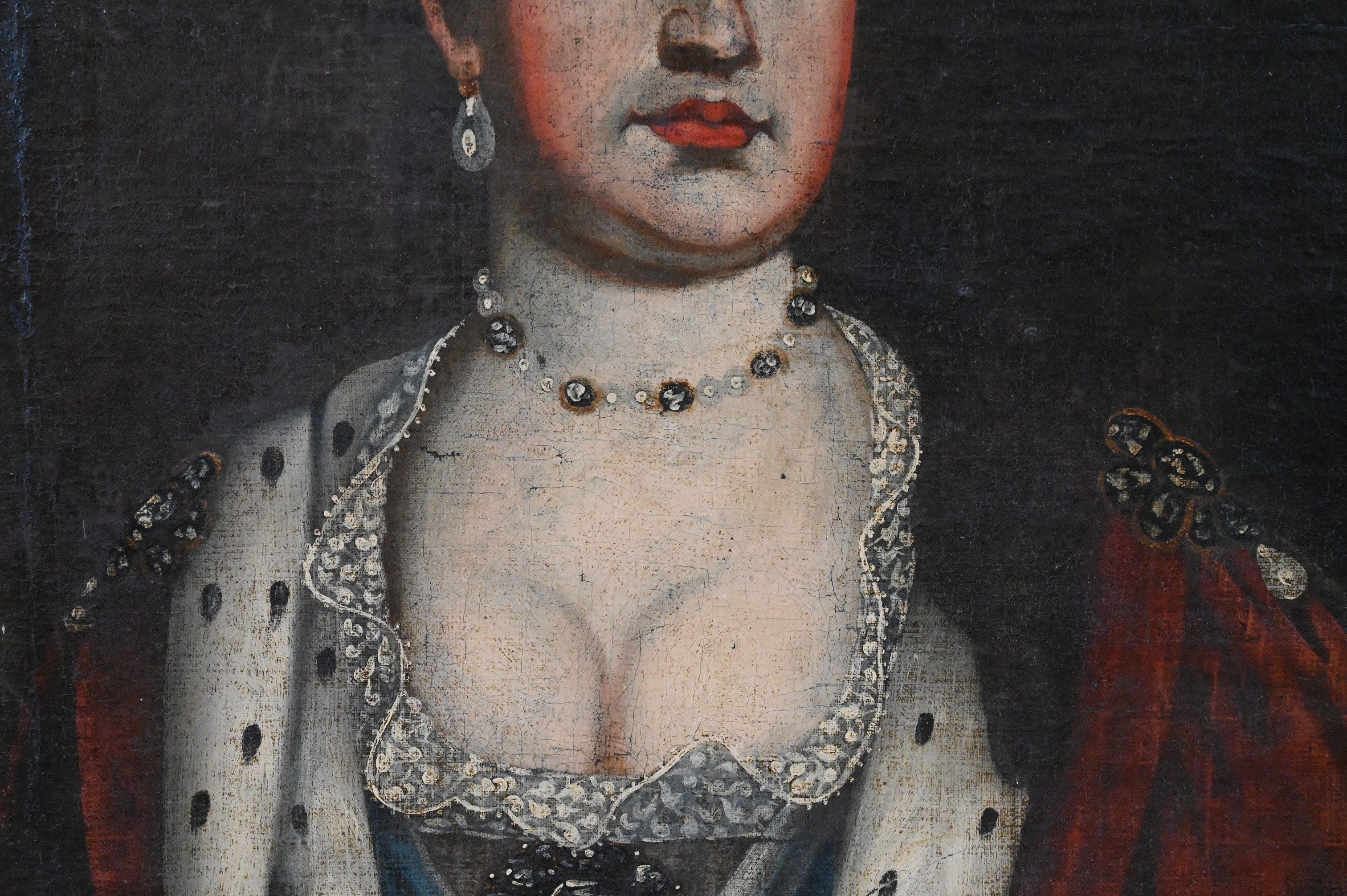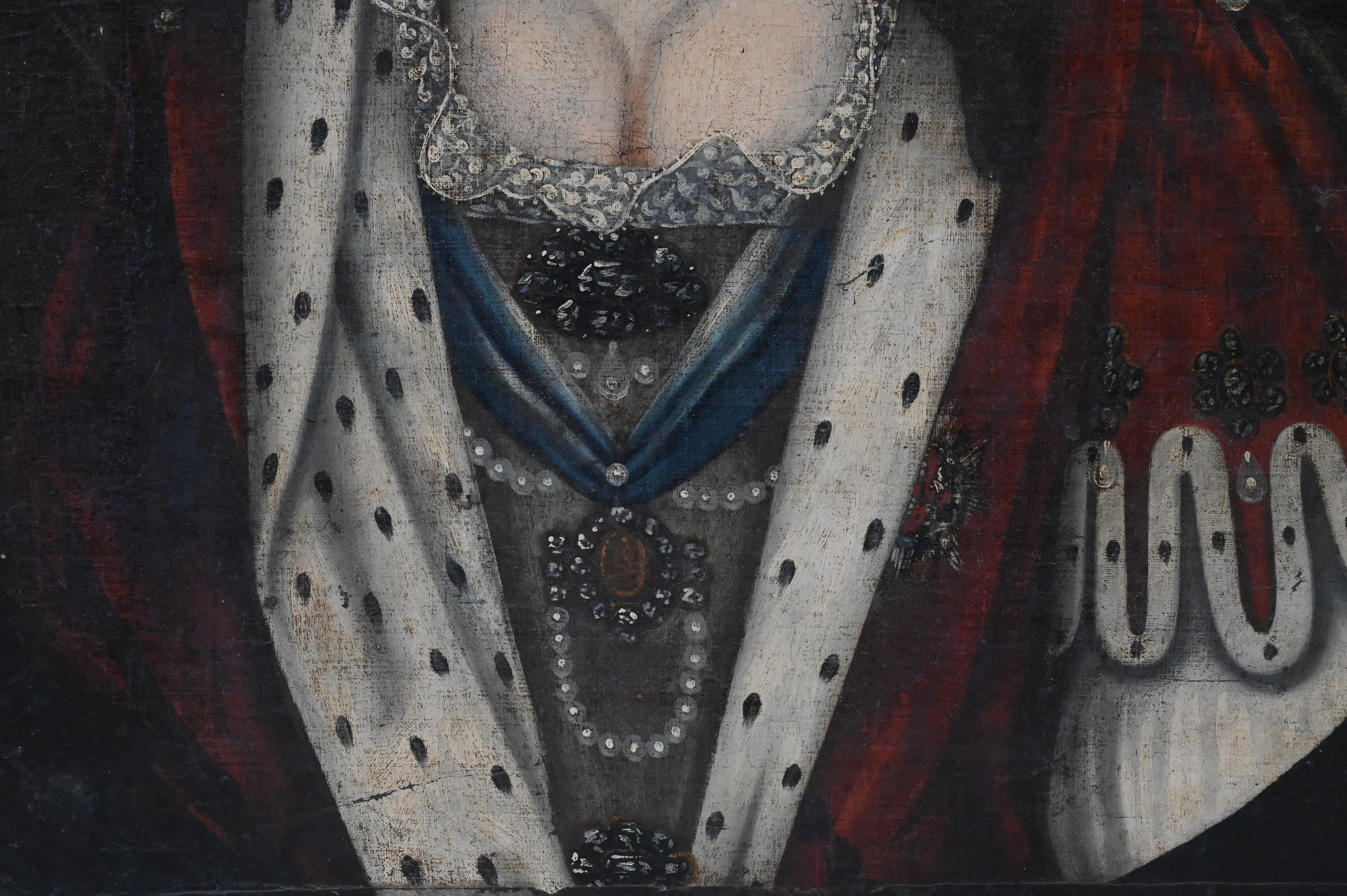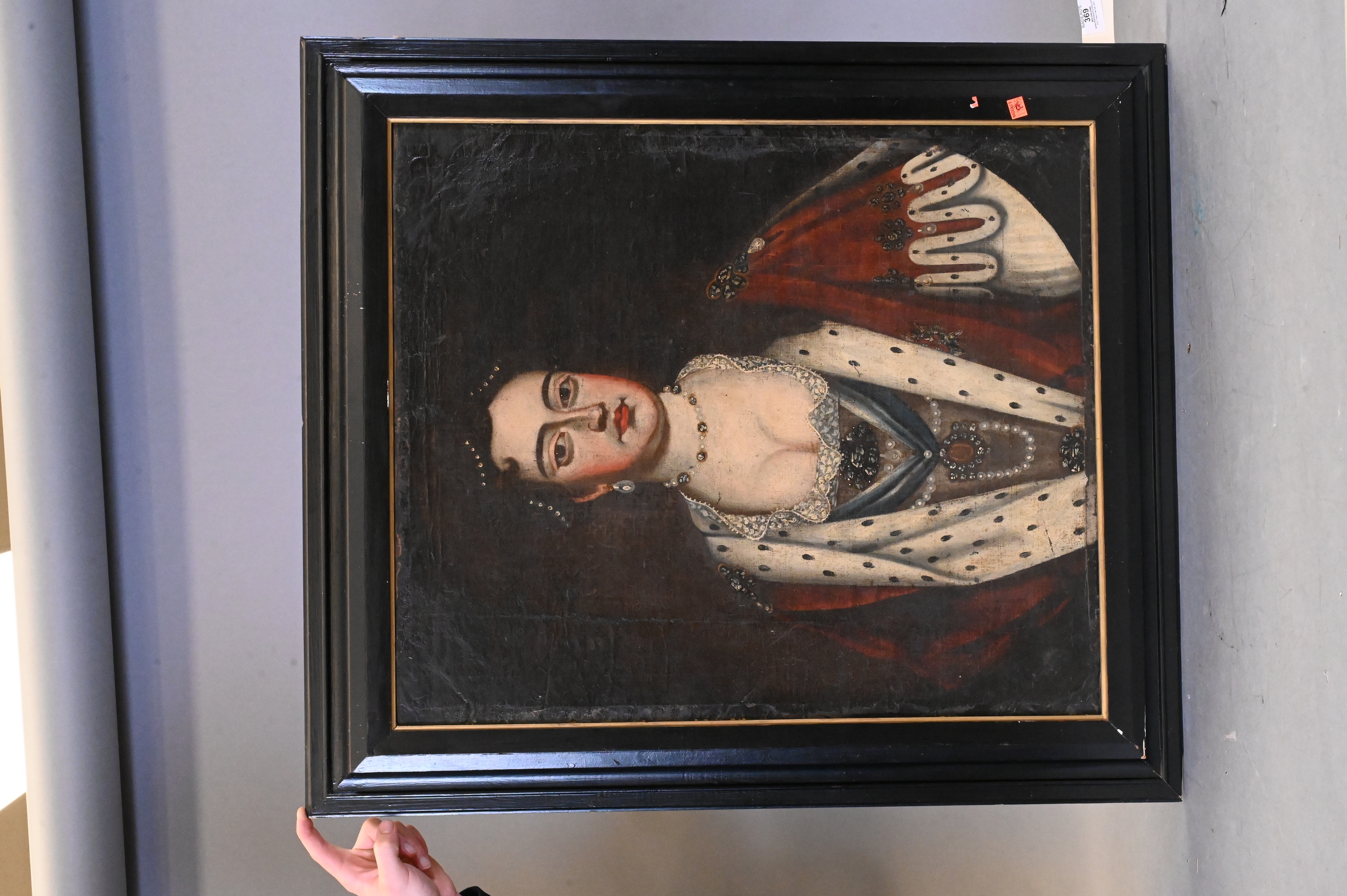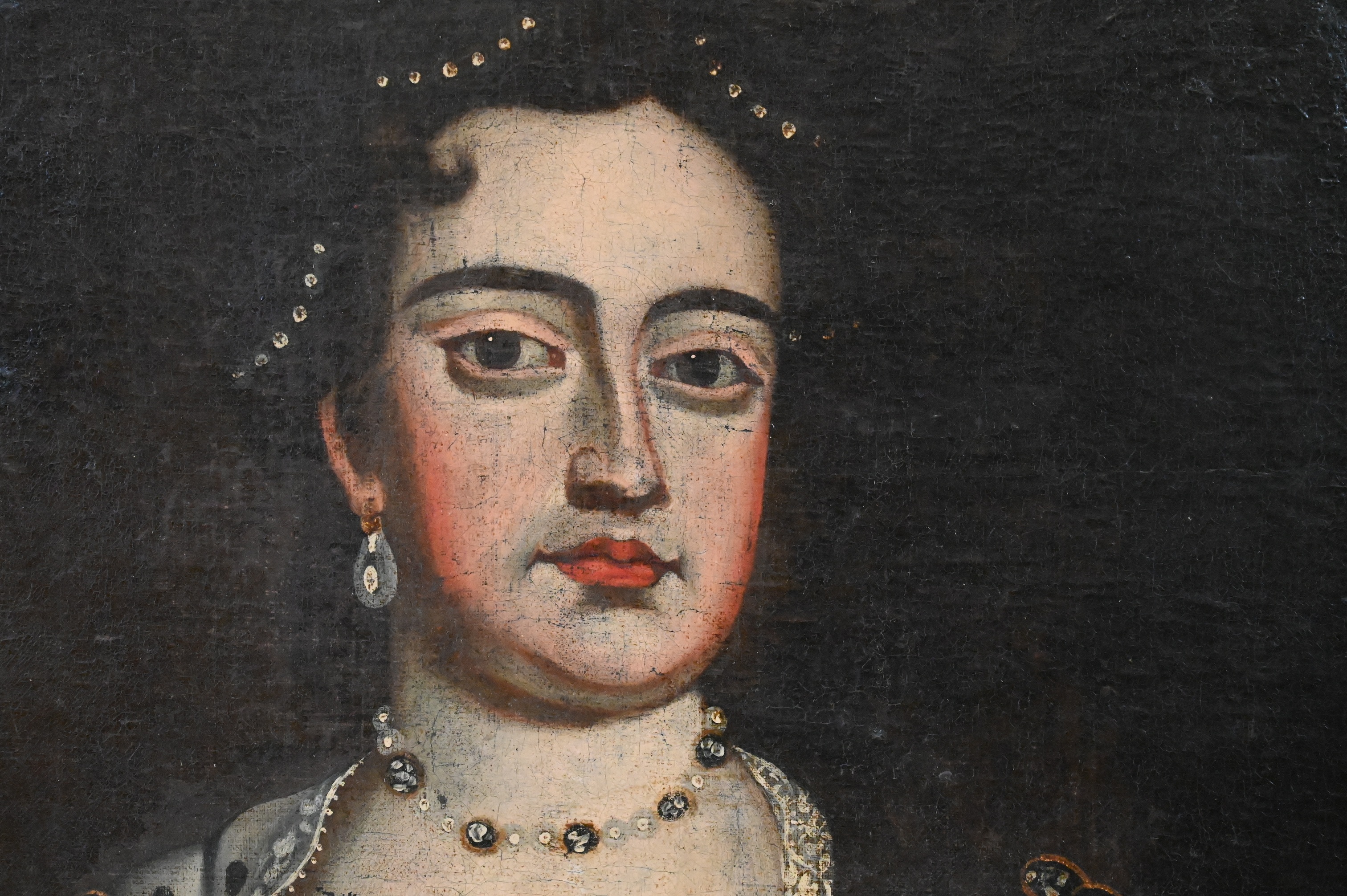 A period or later copy of Kneller’s well-known portrait type of Queen Mary II, shown in ermine-lined coronation robes adorned with pearls and jewels. Kneller, principal painter to the monarch, established the standard image of the queen, which was repeated and adapted by followers throughout the late 17th and 18th centuries.