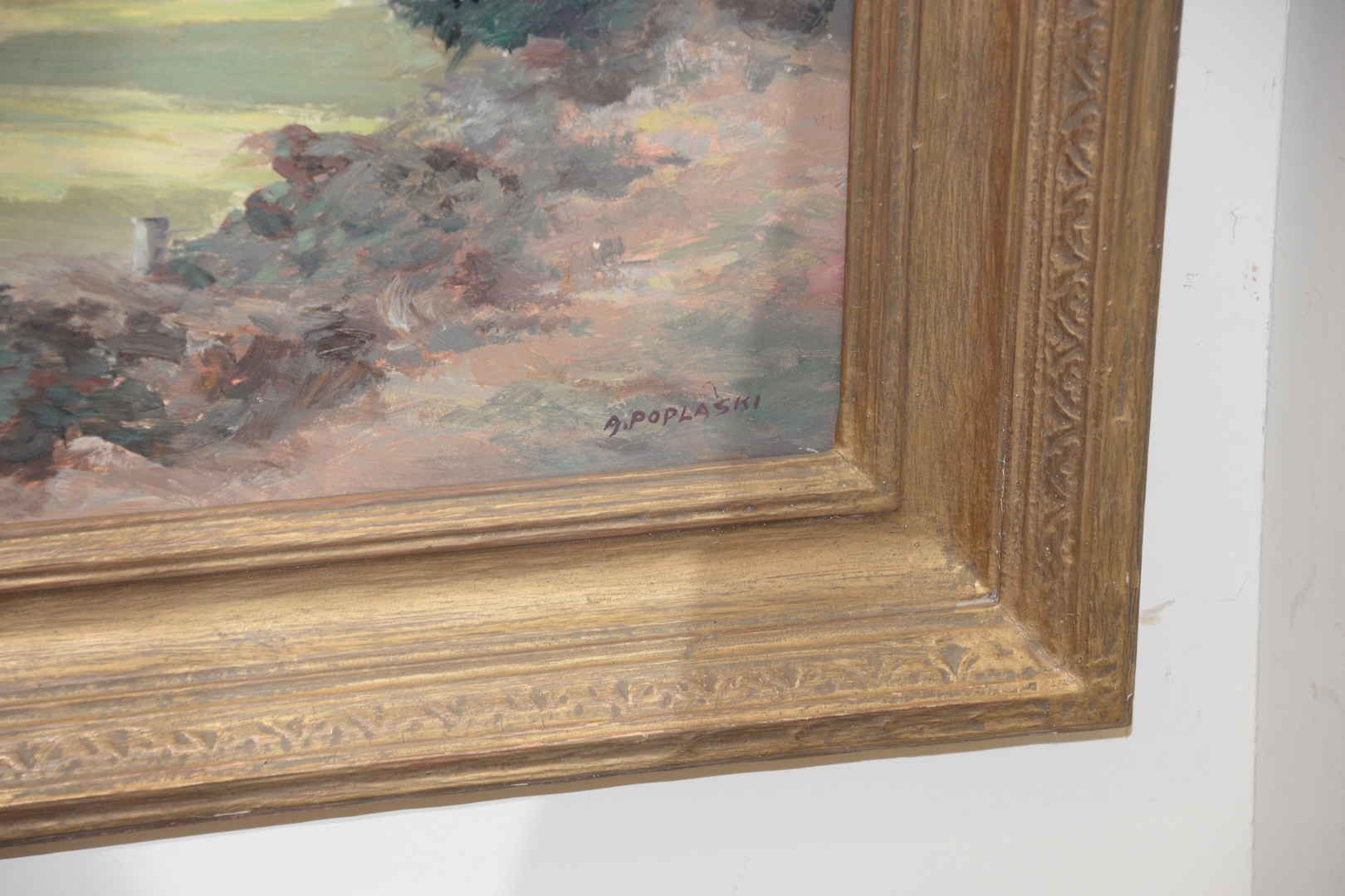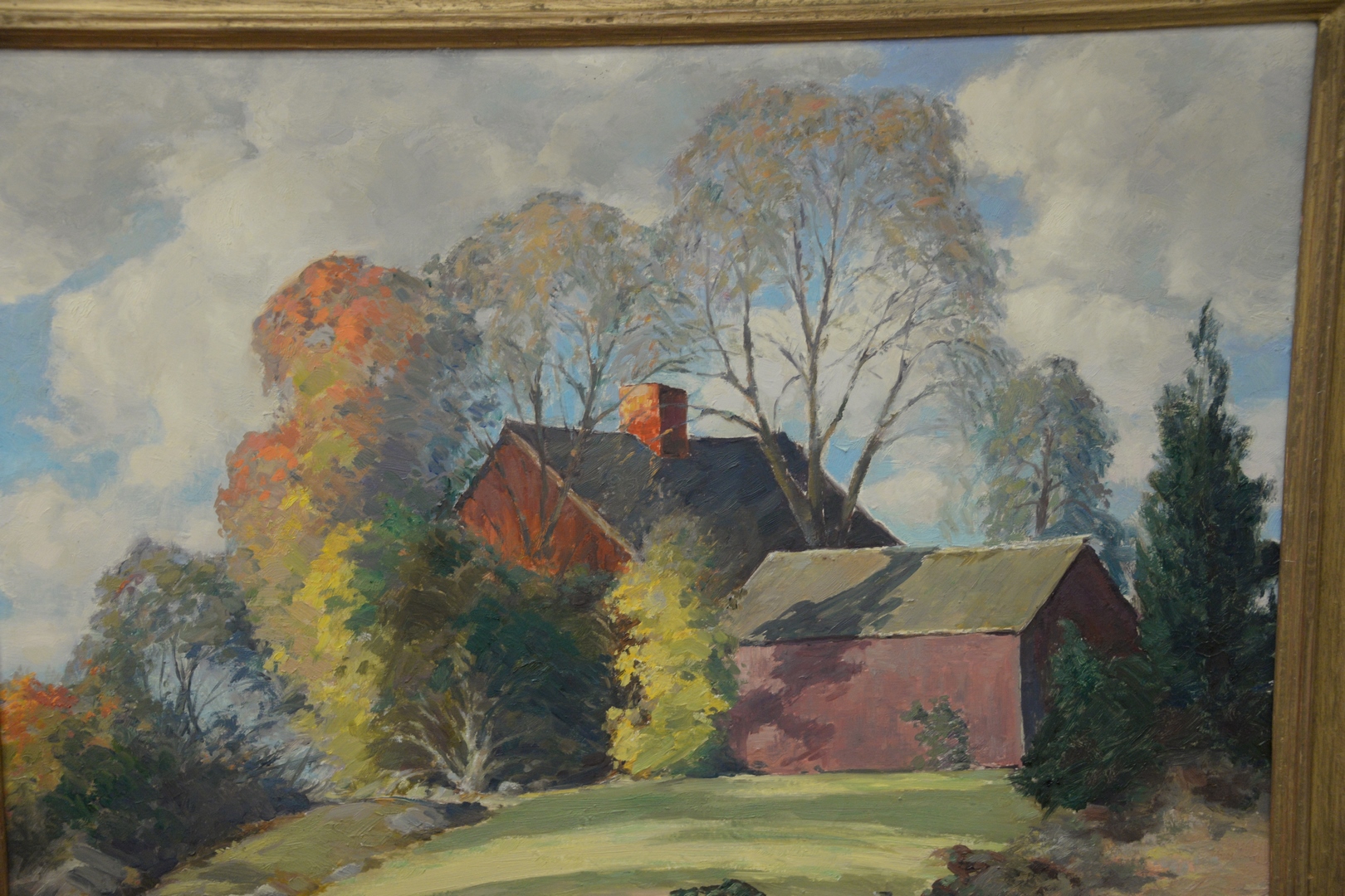 Lot 369: Alex Poplaski Russian/American, 1906 – 1988, Red House on the Hill, oil on canvas, signed lower left: A. Poplaski, 25 x 30.
