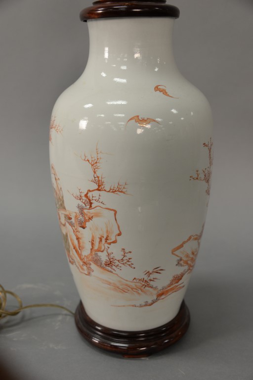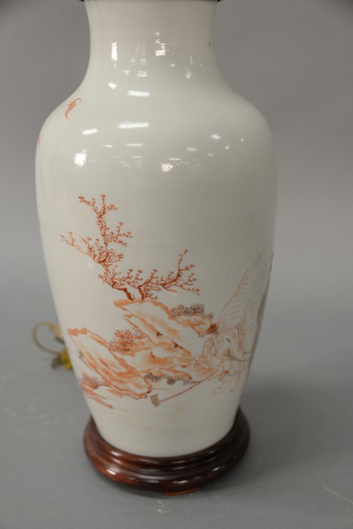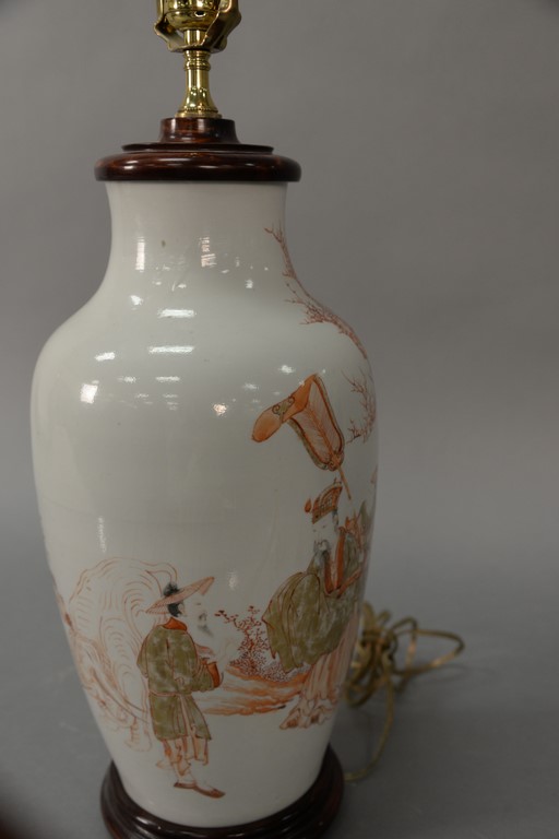 Lot 369: Chinese orange and gilt porcelain vase having painted scholars and landscape scene, made into a table lamp. height 14 1/2 inches, t…