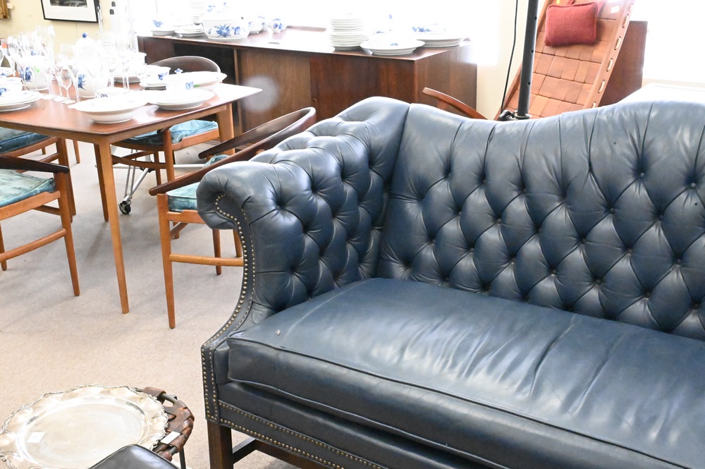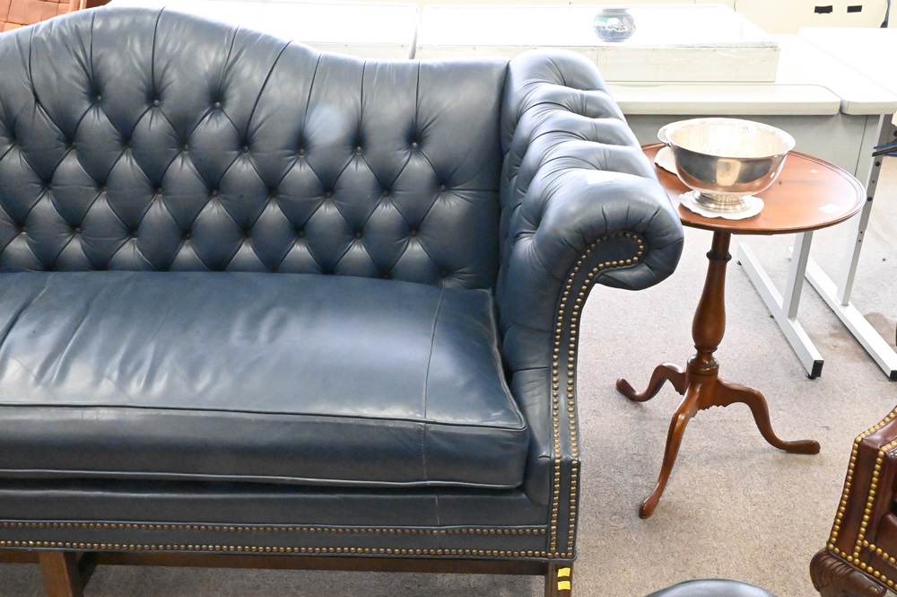 Lot 369: Chippendale Style Camelback Sofa in Blue Leather Upholstery having tufted back and arms on square molded legs, height 37 inches, length 80 inches.