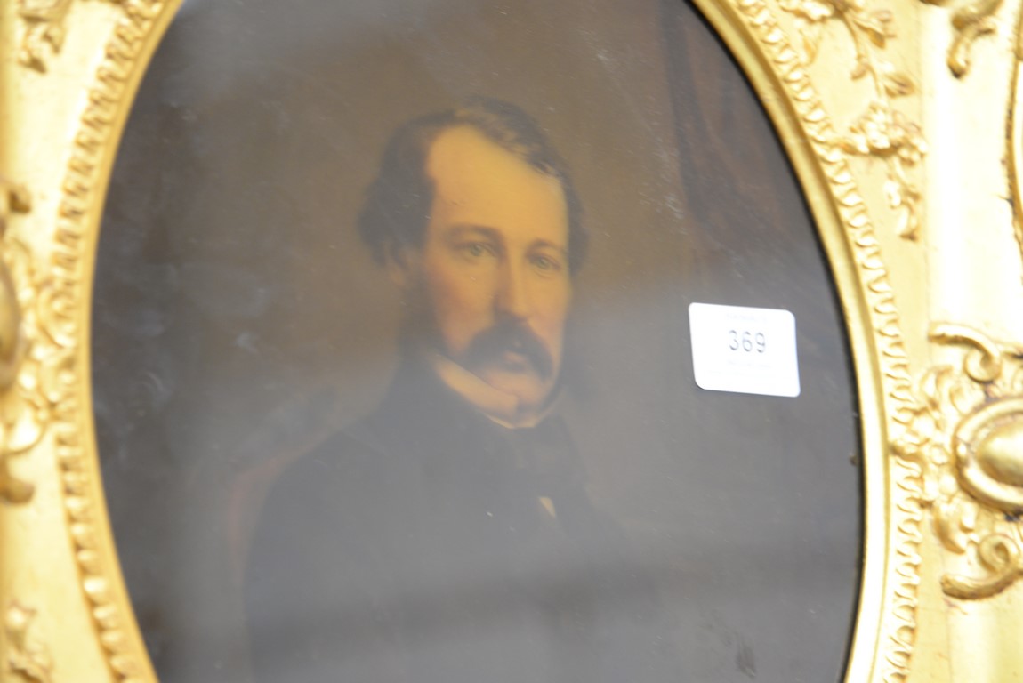 Lot 369: Double reverse painting on glass, portrait of a gentleman with a mustache sitting in a Victorian chair, this appears to have two pieces of glass together and painted on both pieces to create a three dimensional effect. 11 1/2 x 13 1/2