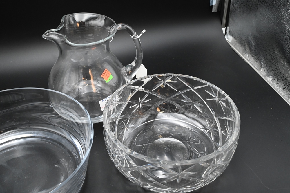 Eight Piece Glass Group, to include four Krosno pieces, two under plates, center bowl and a D’Argental bowl (as is), tallest 10 1/2 inches.