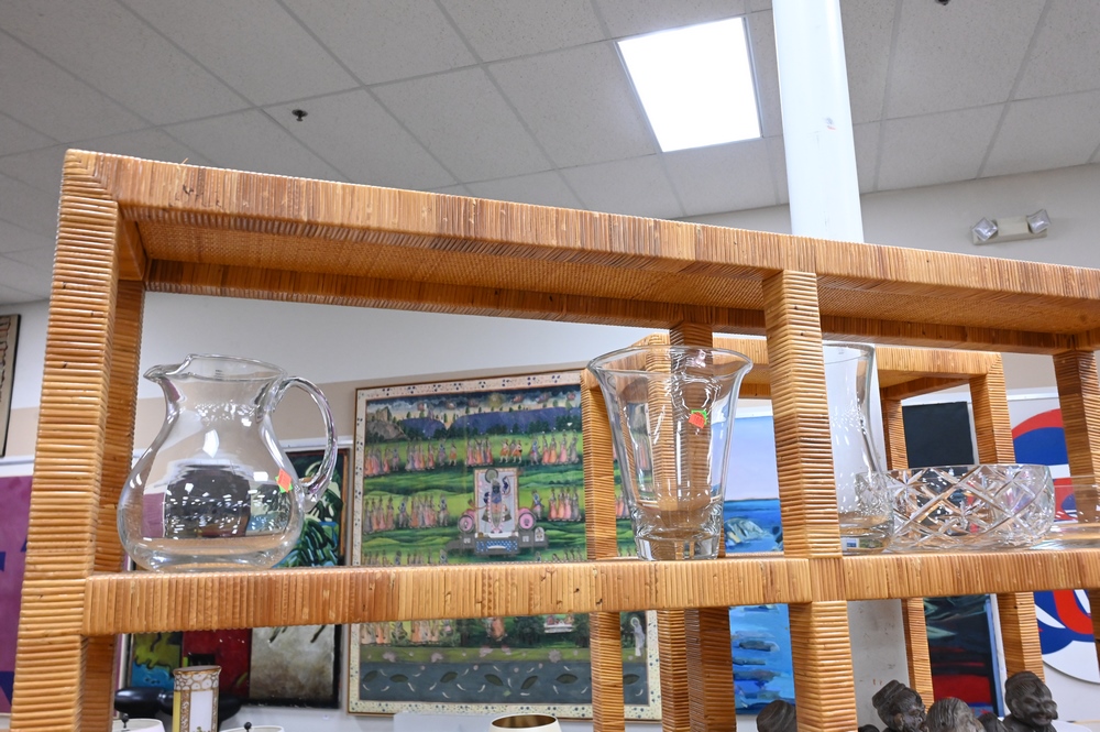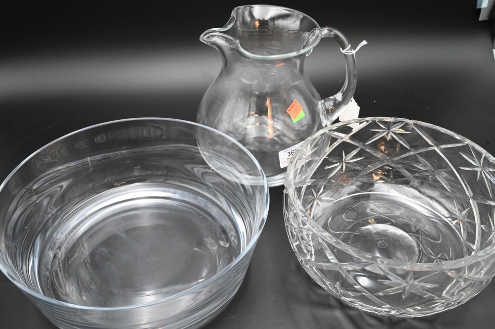 Lot 369: Eight Piece Glass Group, to include four Krosno pieces, two under plates, center bowl and a D’Argental bowl (as is), tallest 10 1/2 inches.